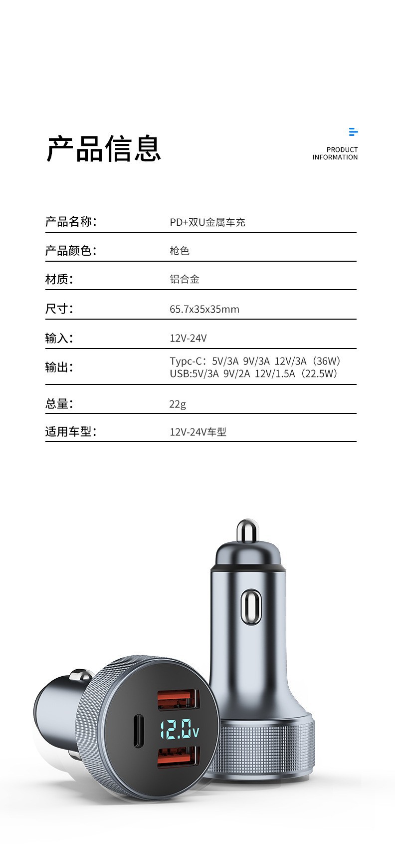 跨境金属车载快充数显充电器 车充金属双口PD充电器点烟器转换头
