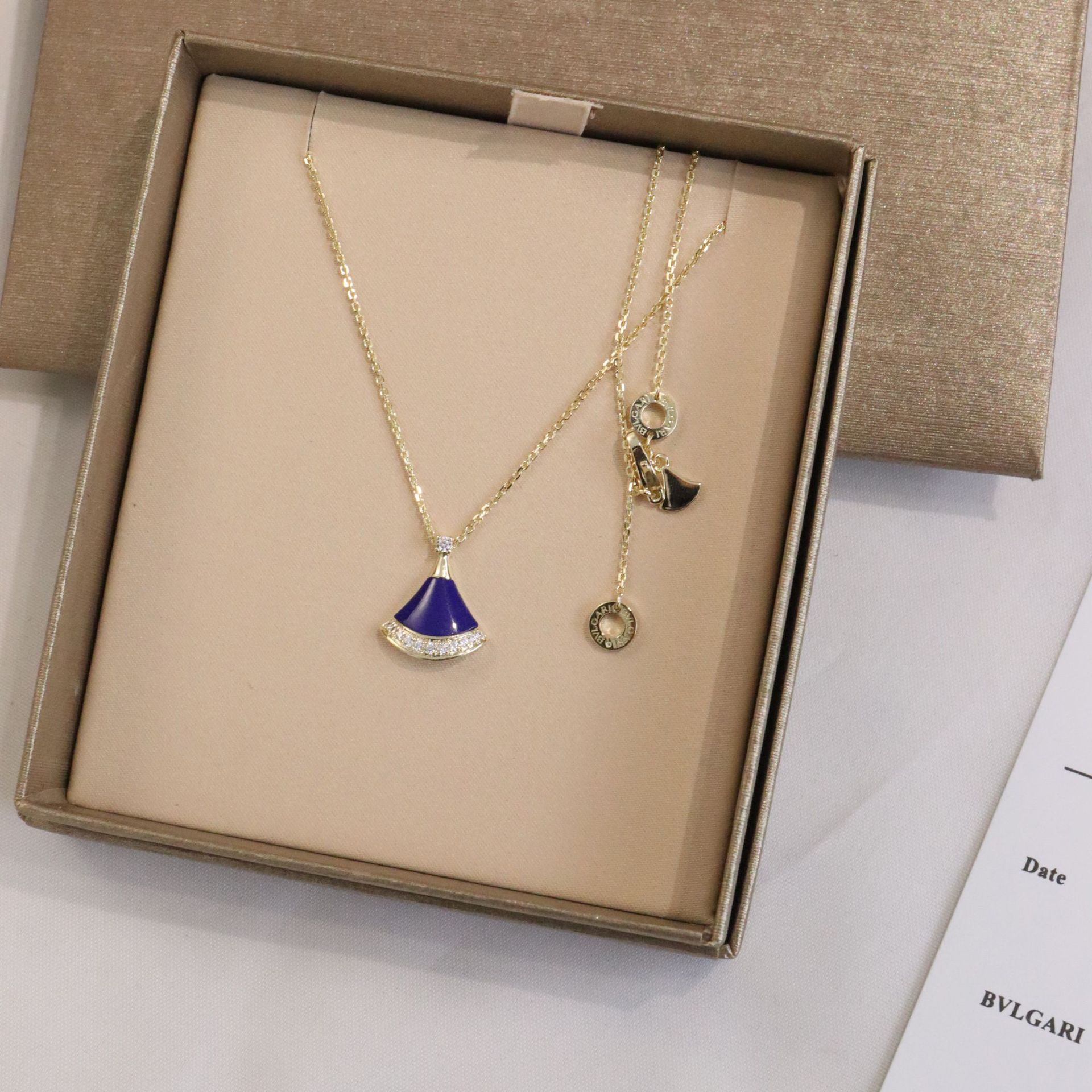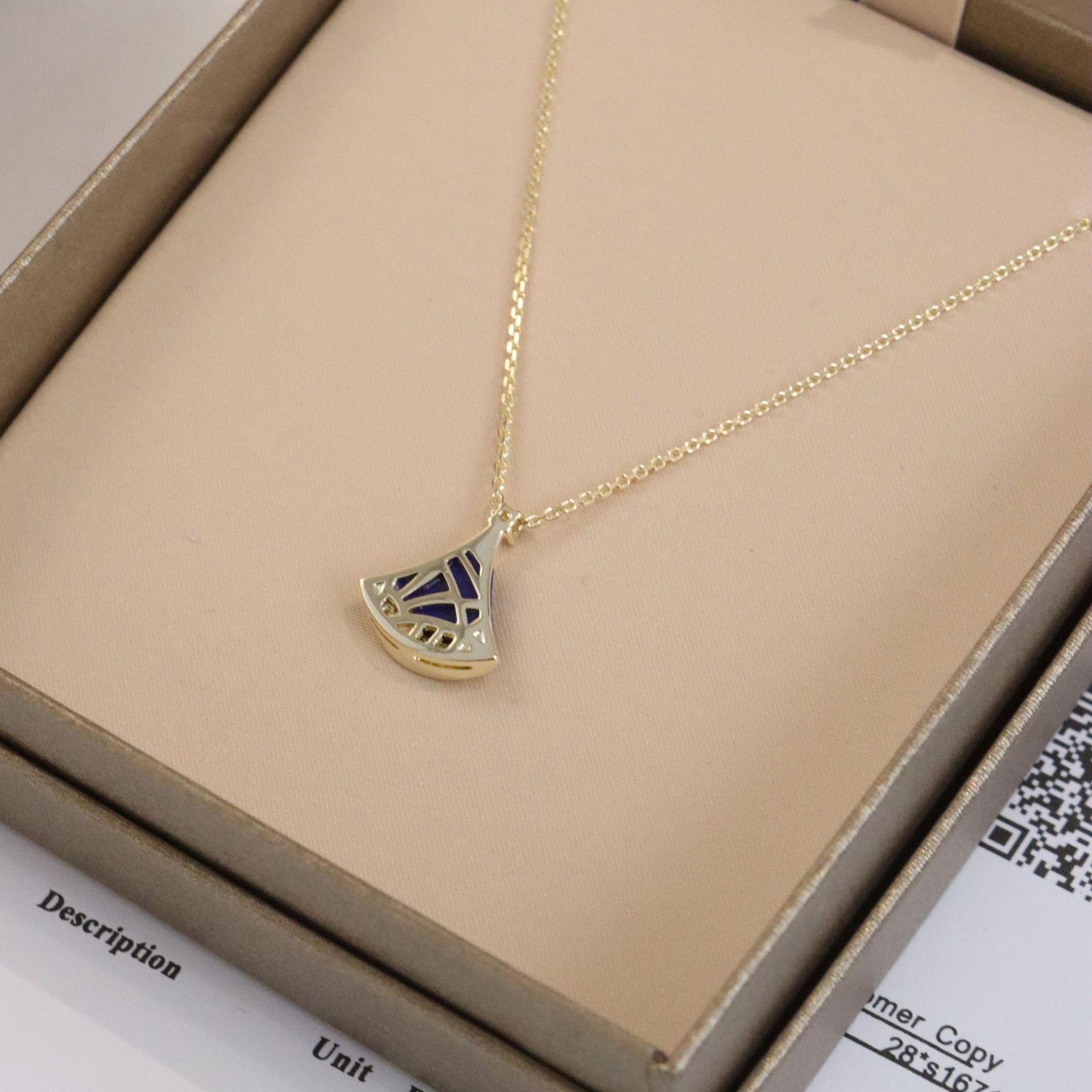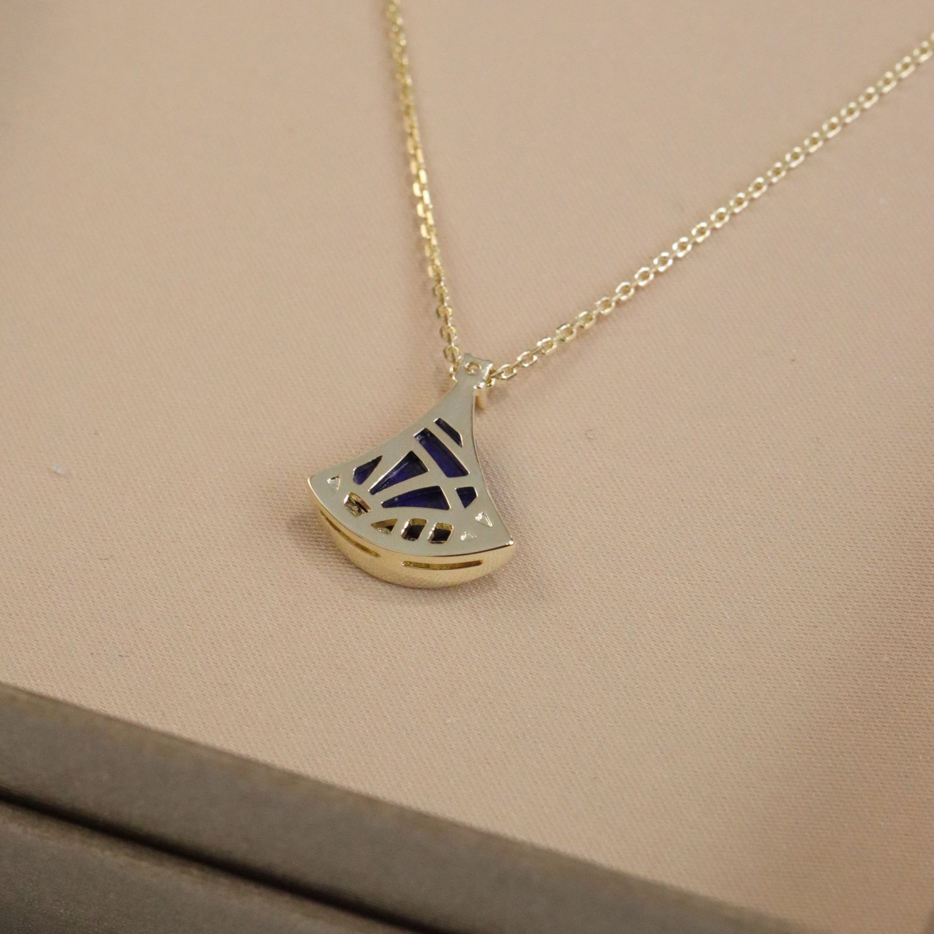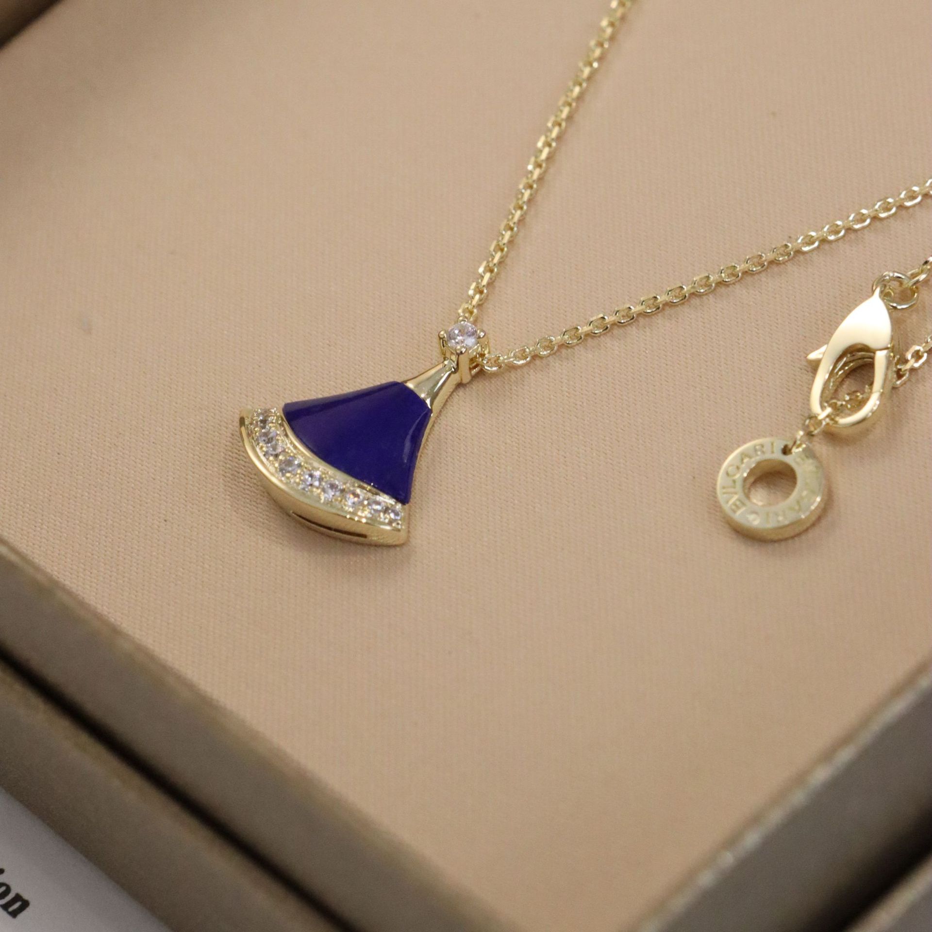 正确版新款蓝色小裙子项链女s925银镀18k玫瑰金蓝宝石扇子项链女