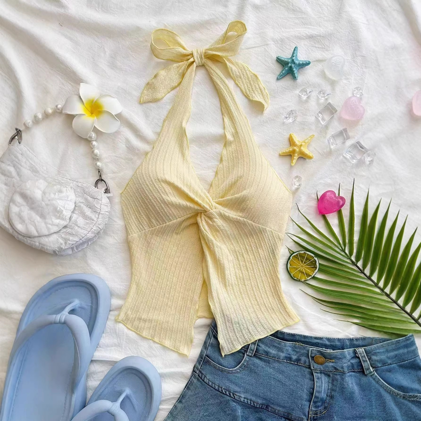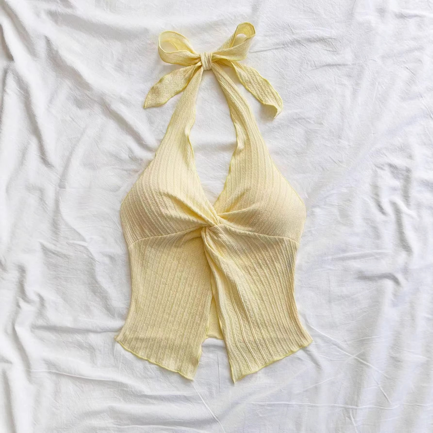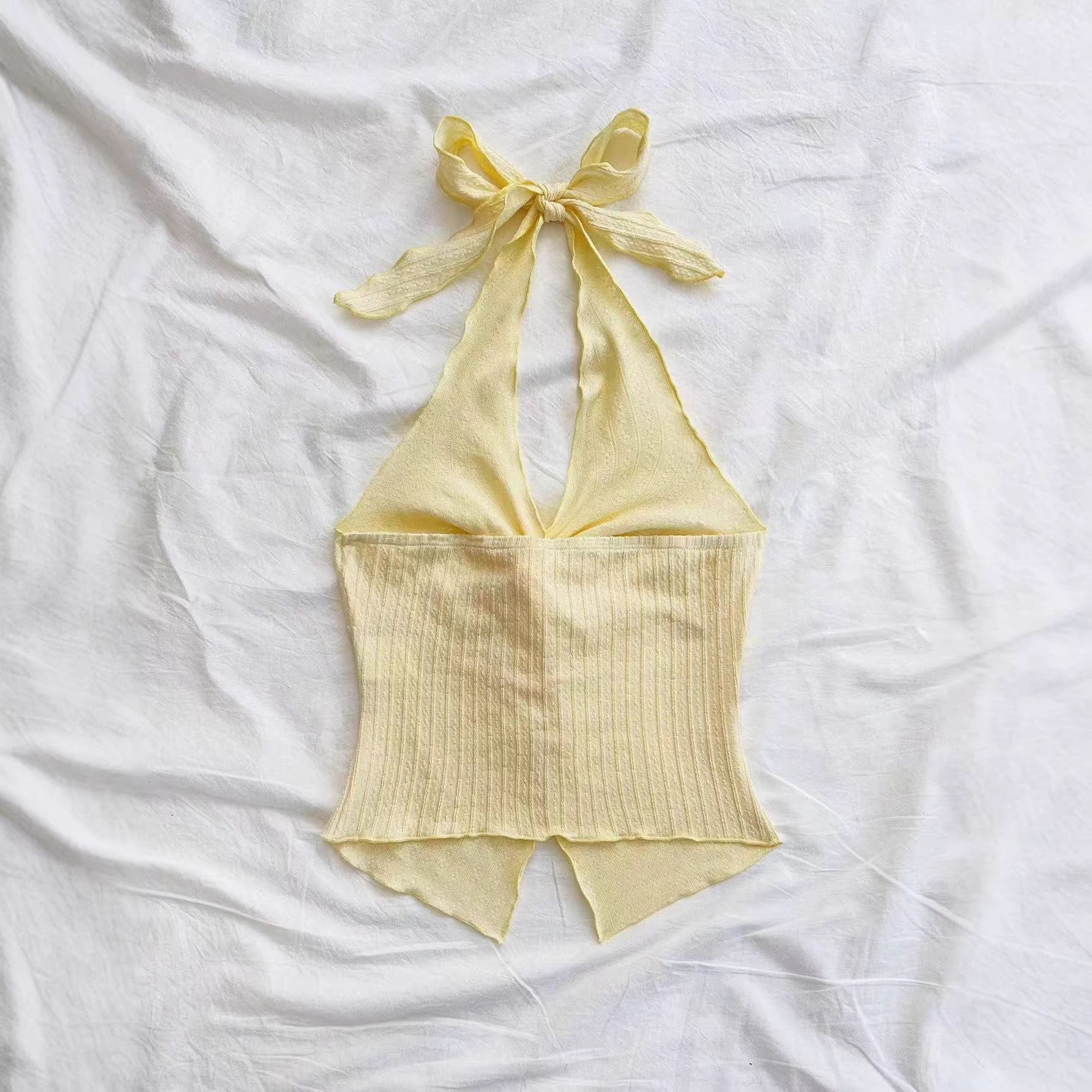 2025欧美跨境新款挂脖辣妹风气质优雅森系纯欲蝴蝶结挂脖小背心女