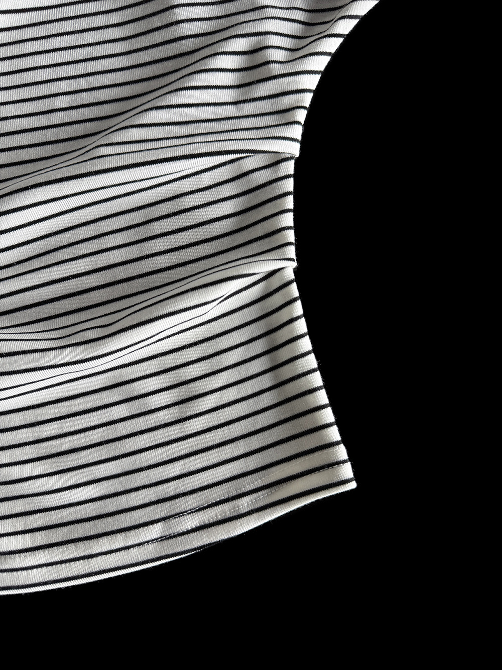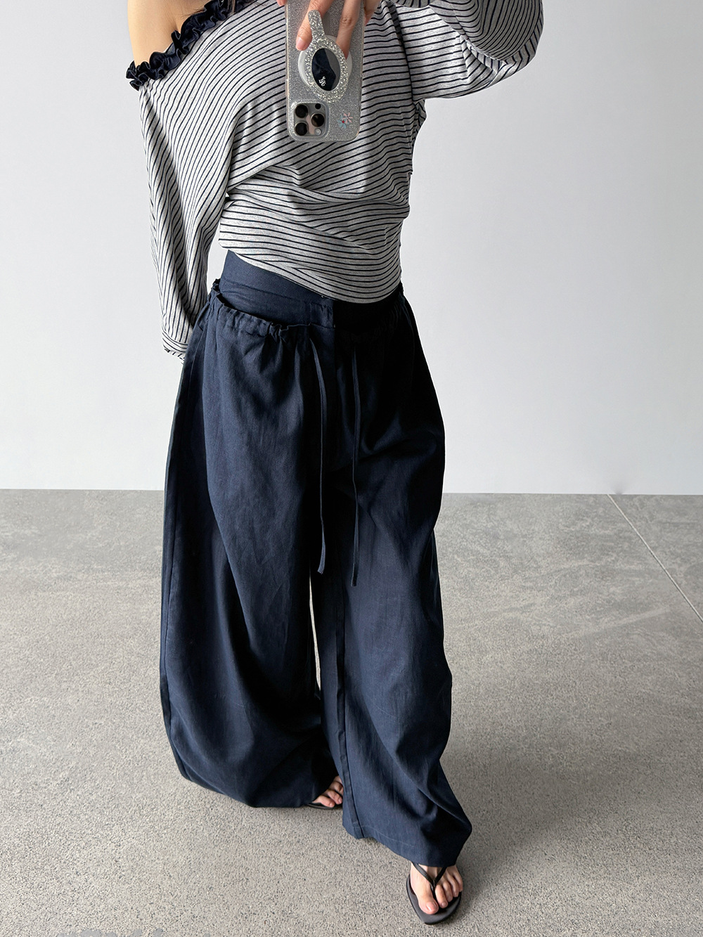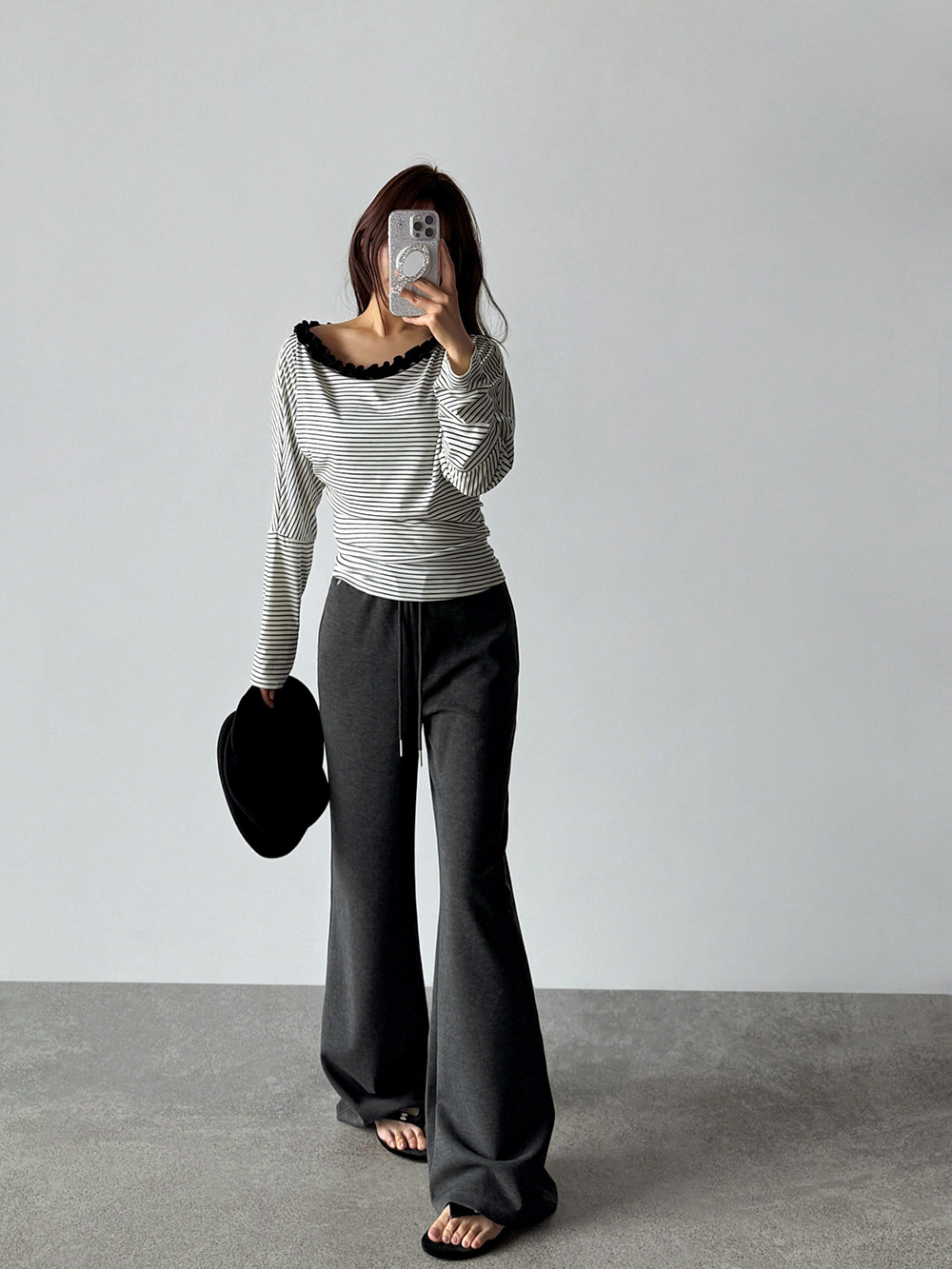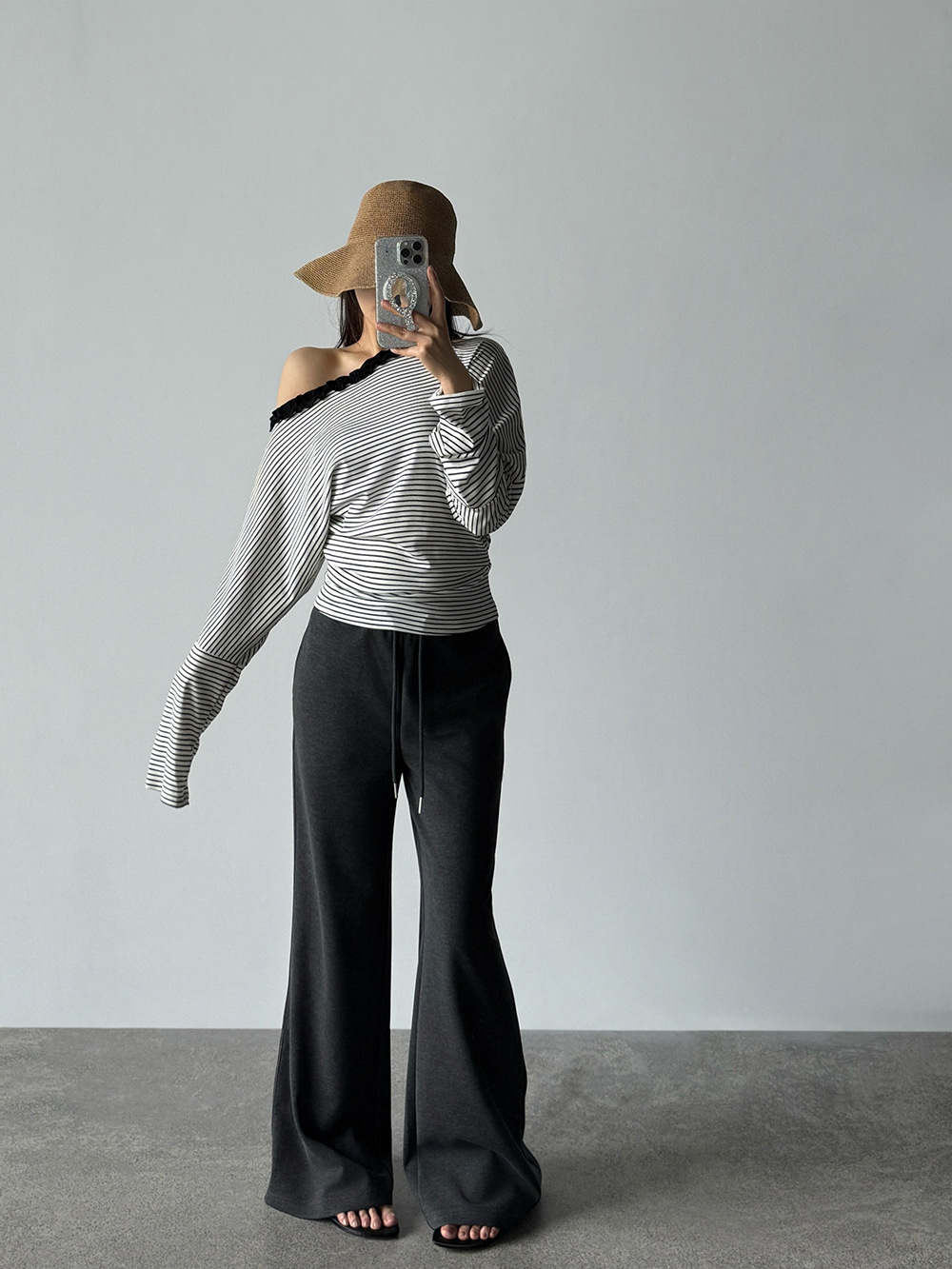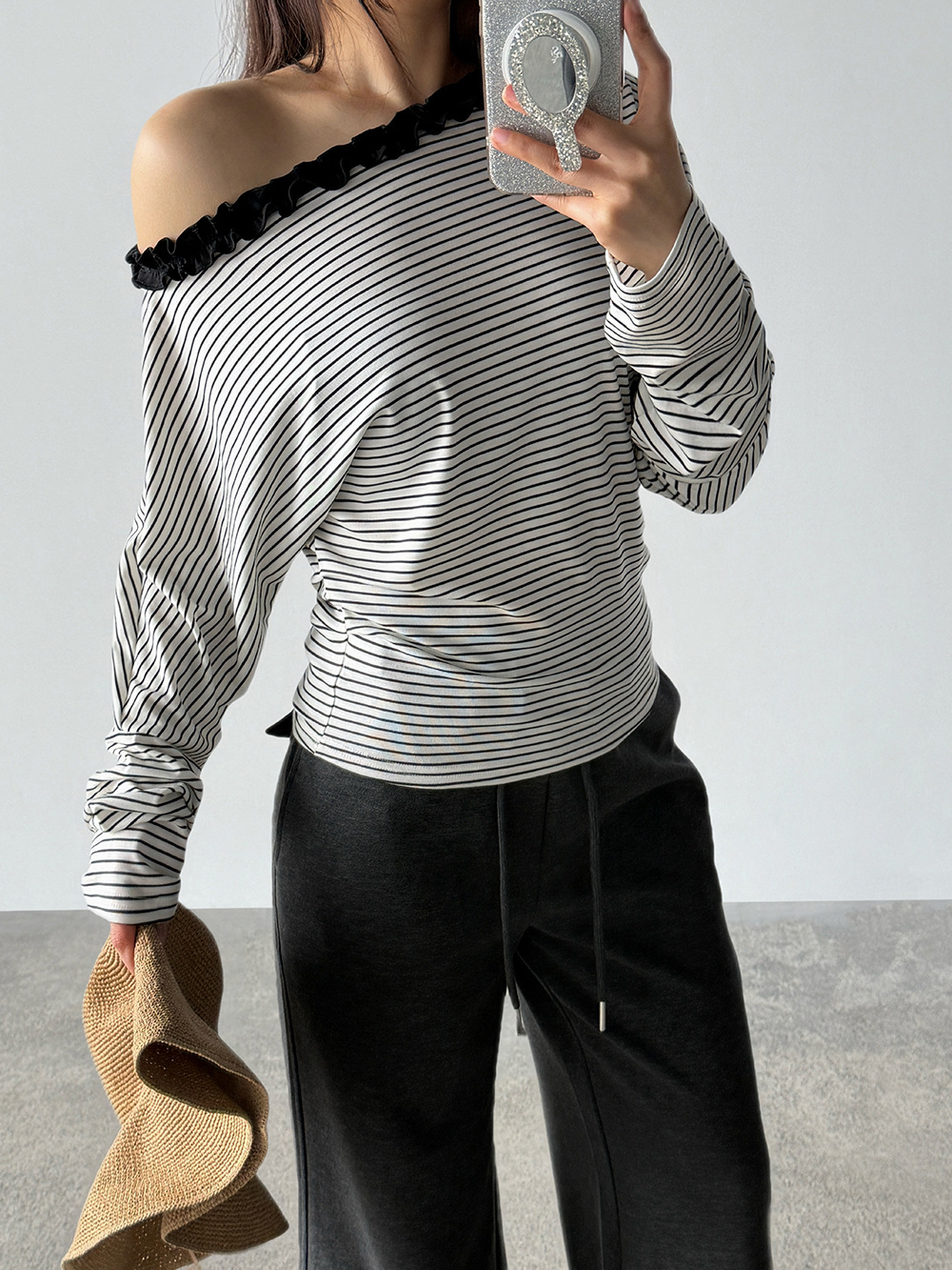 【王琪芝】设计感木耳花边斜肩条纹T恤女春百搭显瘦上衣长袖WQ231