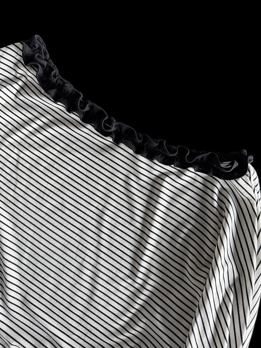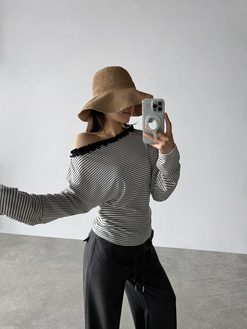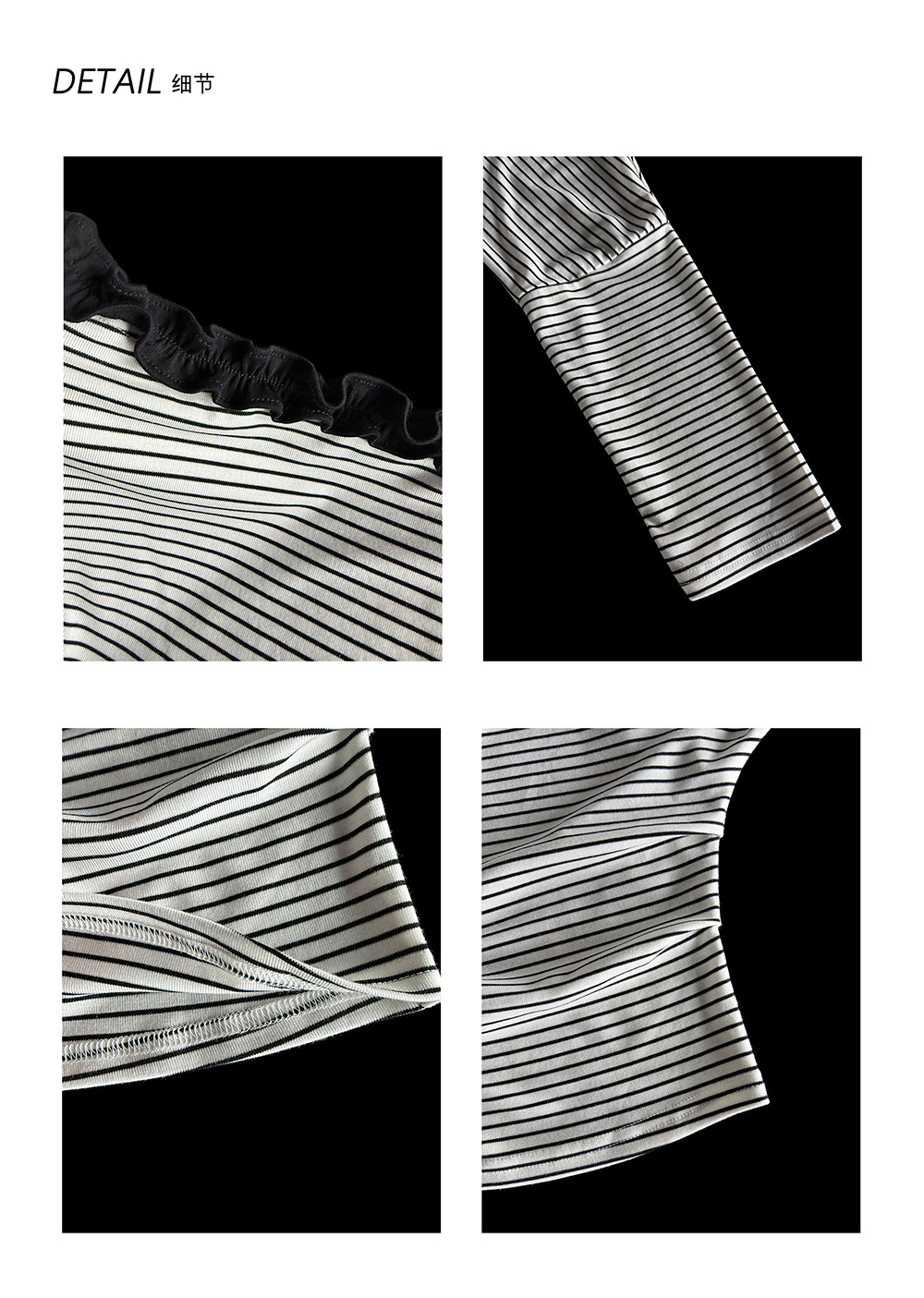 【王琪芝】设计感木耳花边斜肩条纹T恤女春百搭显瘦上衣长袖WQ231,批发价,价格:79,厂家直销,【王琪芝】设计感木耳花边斜肩条纹T恤女春百搭显瘦上衣长袖WQ231,免费拿样。
