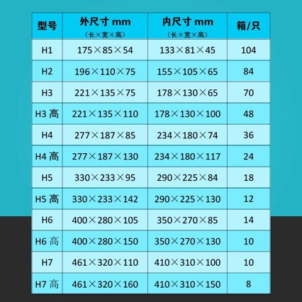 防水箱不同型号的尺寸表,内有产品的外尺寸和内尺寸,以及包装数量,量大可以联系我们的客服。