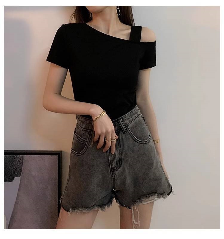 黑色一字肩上衣斜领短袖女夏季25新款露肩性感锁骨设计感小众T恤
