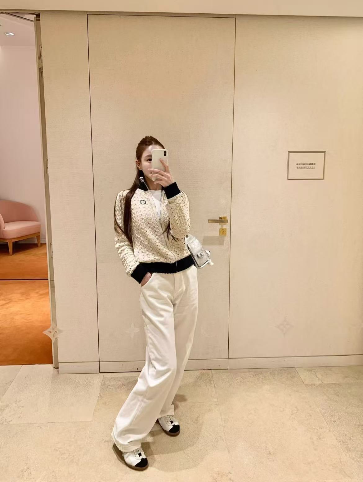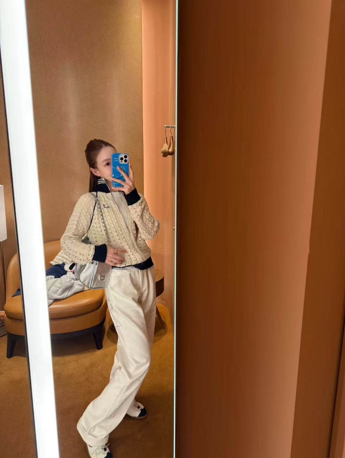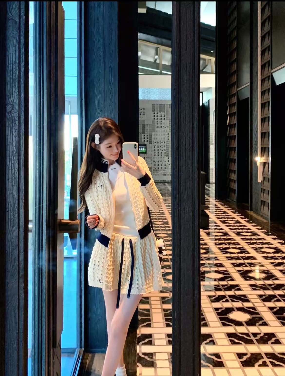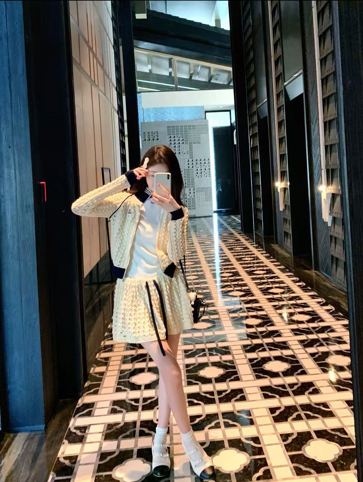 推荐理由:这套是当下超火的Miu 系穿搭模板,精准拿捏了甜妹的精致感与富家千金的贵气感~奶fufu 的米白色为主调,领口、袖口和下摆的藏蓝色撞色包边,瞬间勾勒出学院感,自带减龄滤镜,探店,出游和日常轻松驾驭。