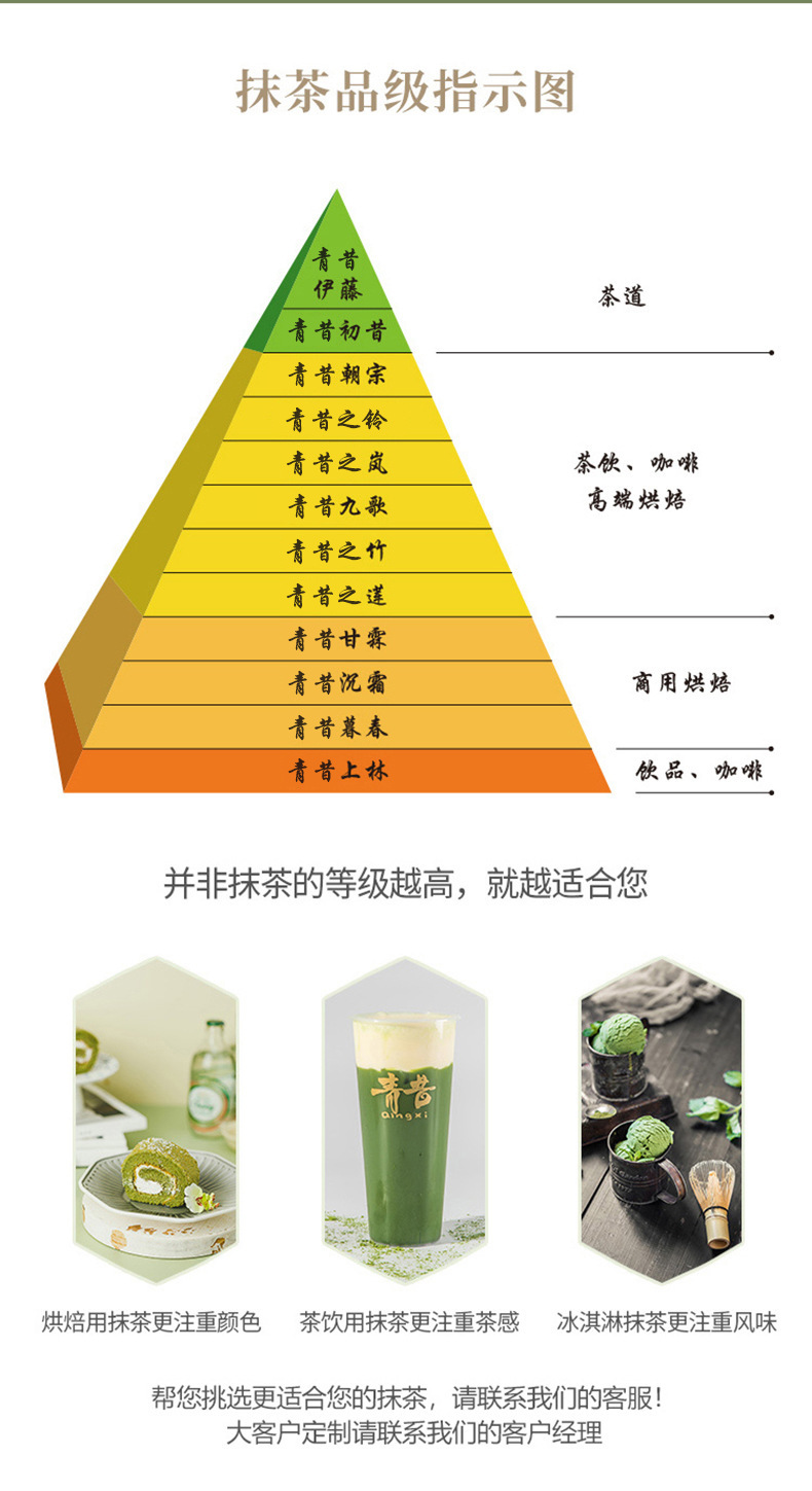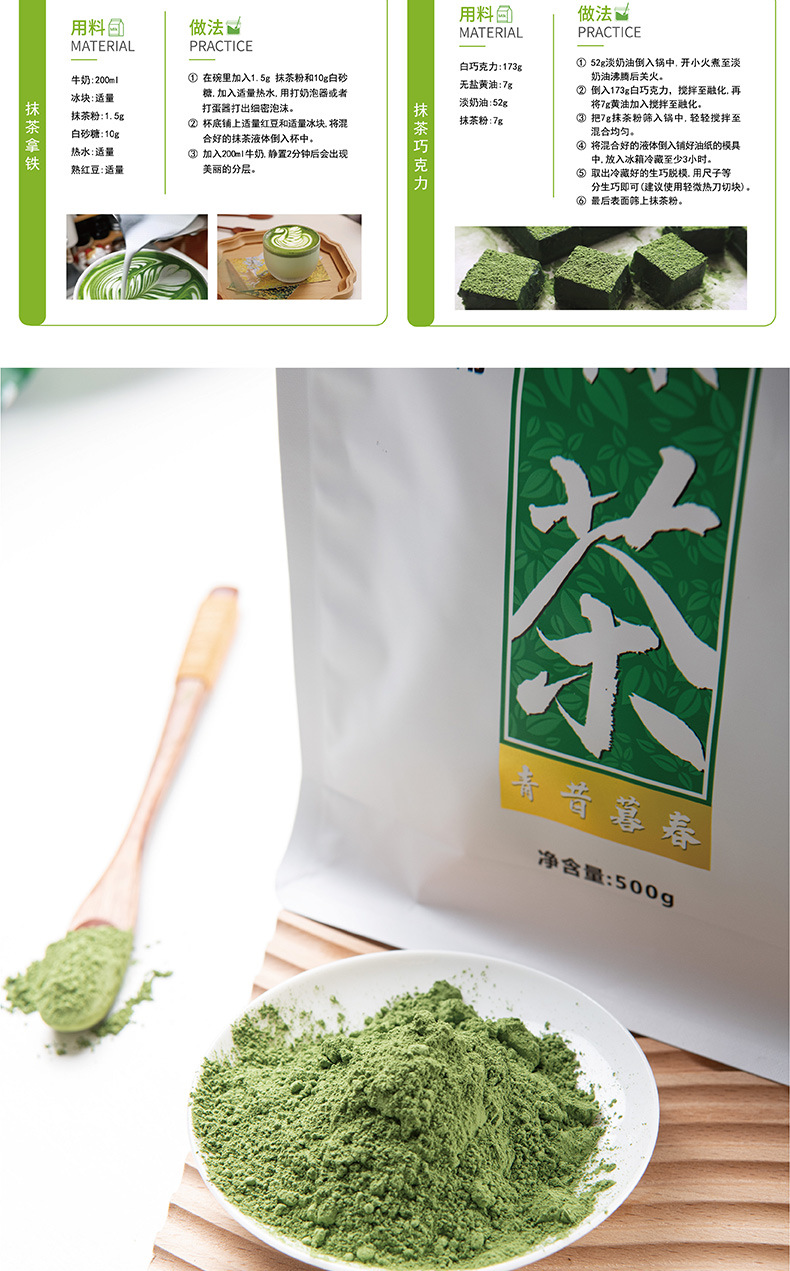 是制作甜品的神奇原料!用于制作抹茶蛋糕、抹茶曲奇、抹茶生巧、抹茶冰淇淋等,颜色清新,风味独特,轻松提升甜点档次