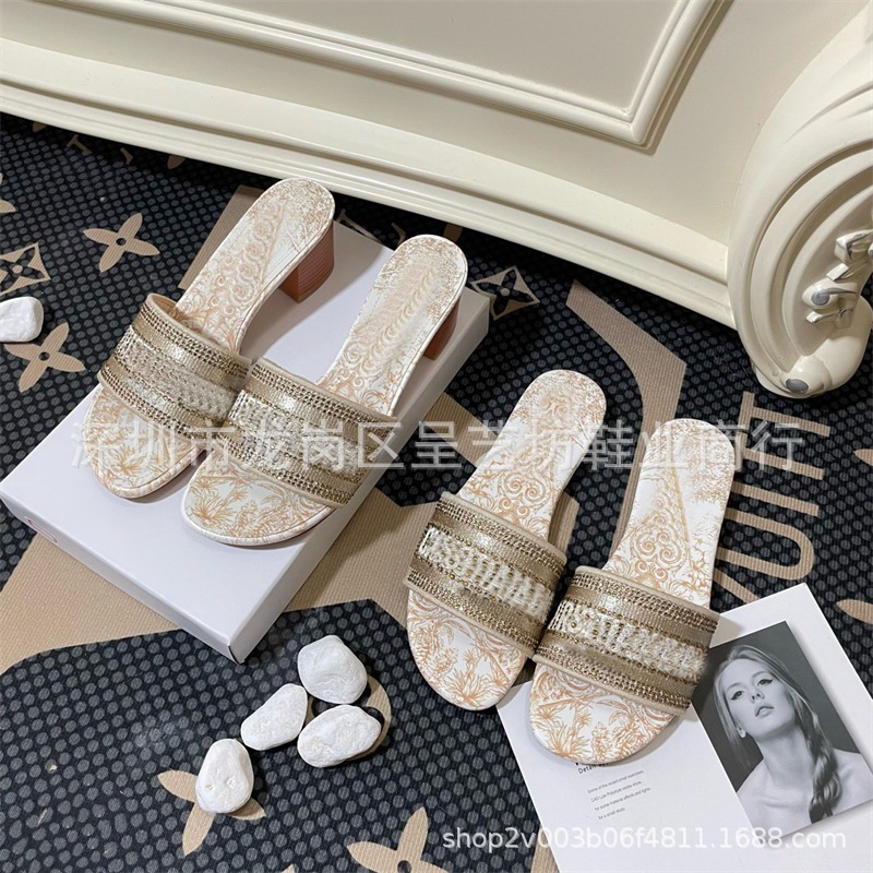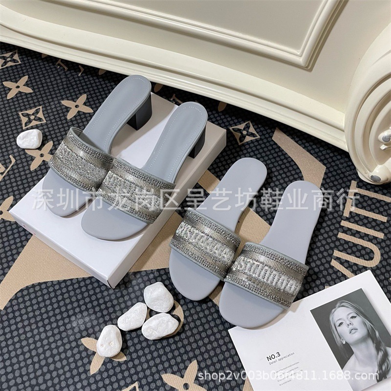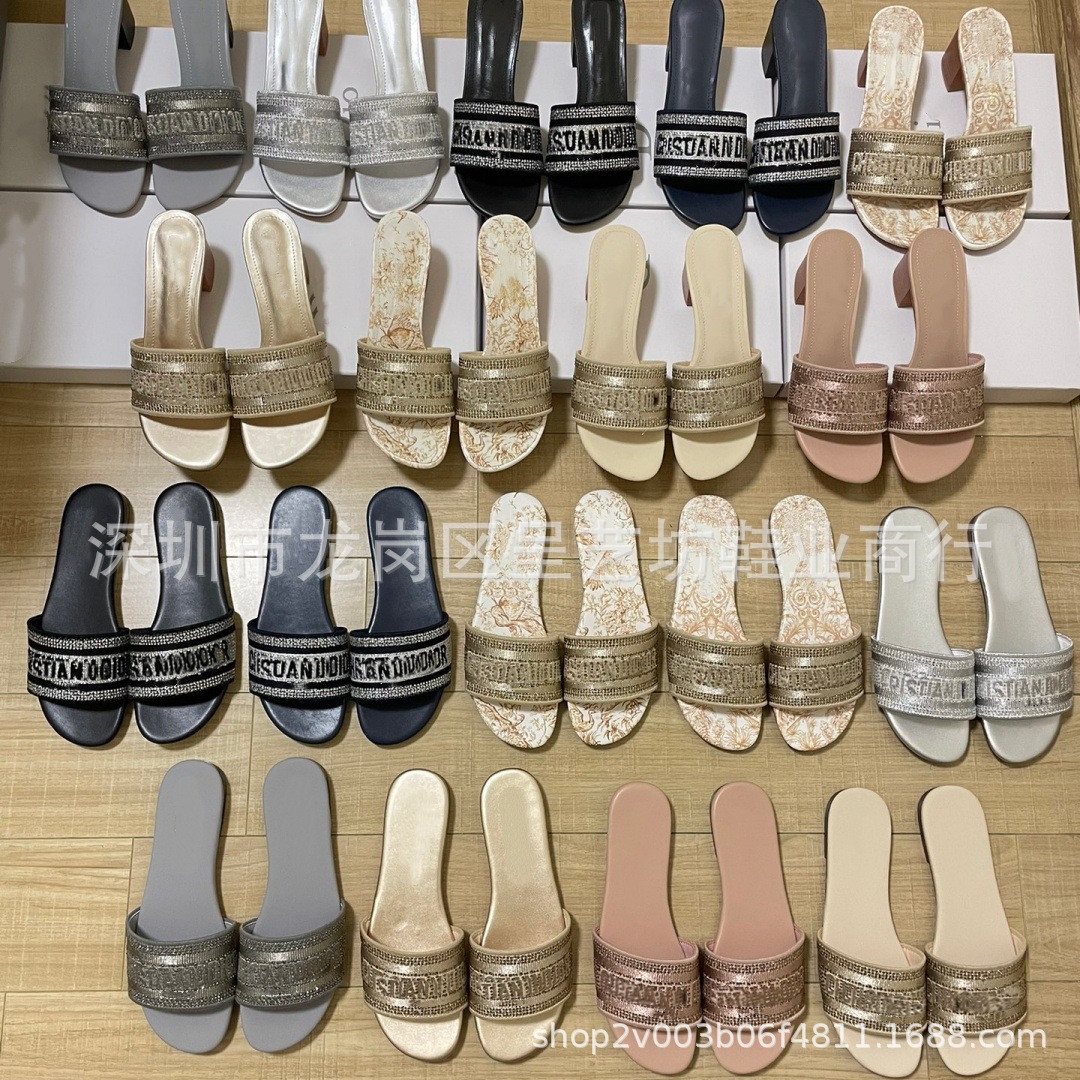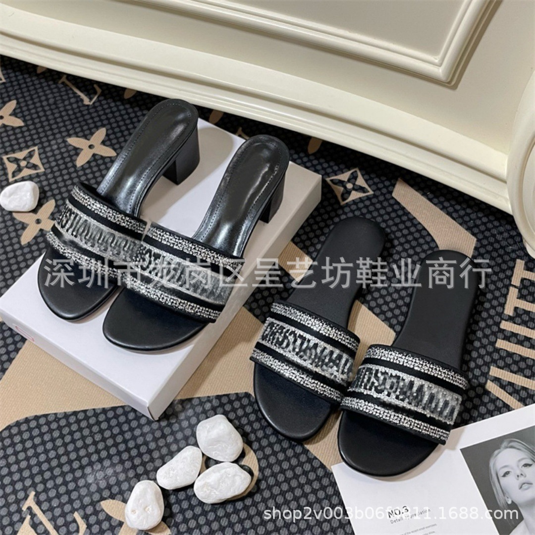 2026新款D家刺绣拖鞋女夏外穿粗跟水钻平底一字凉拖鞋外贸高跟鞋