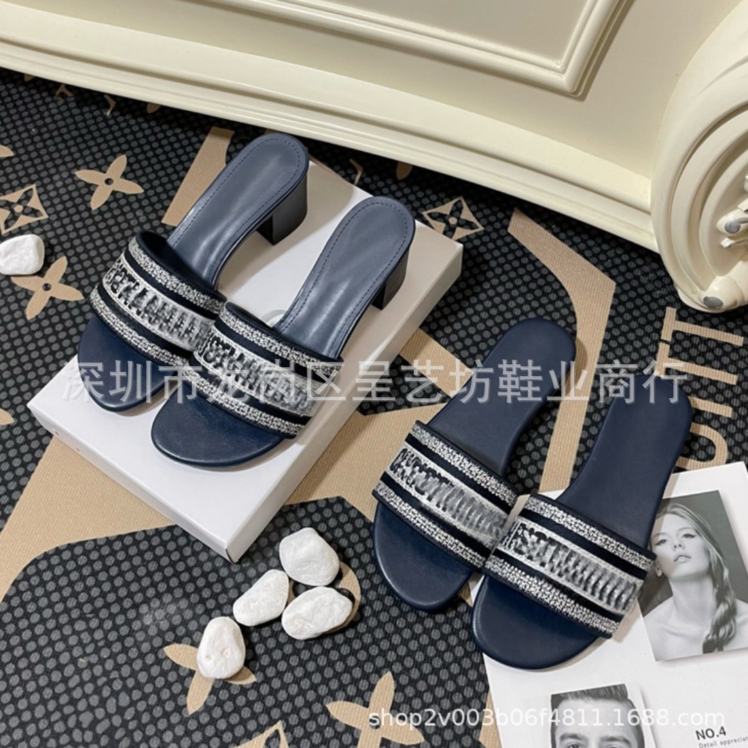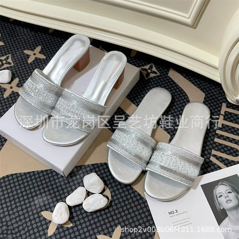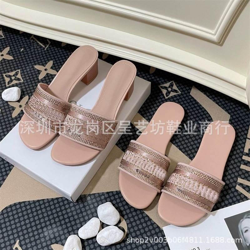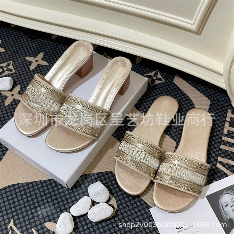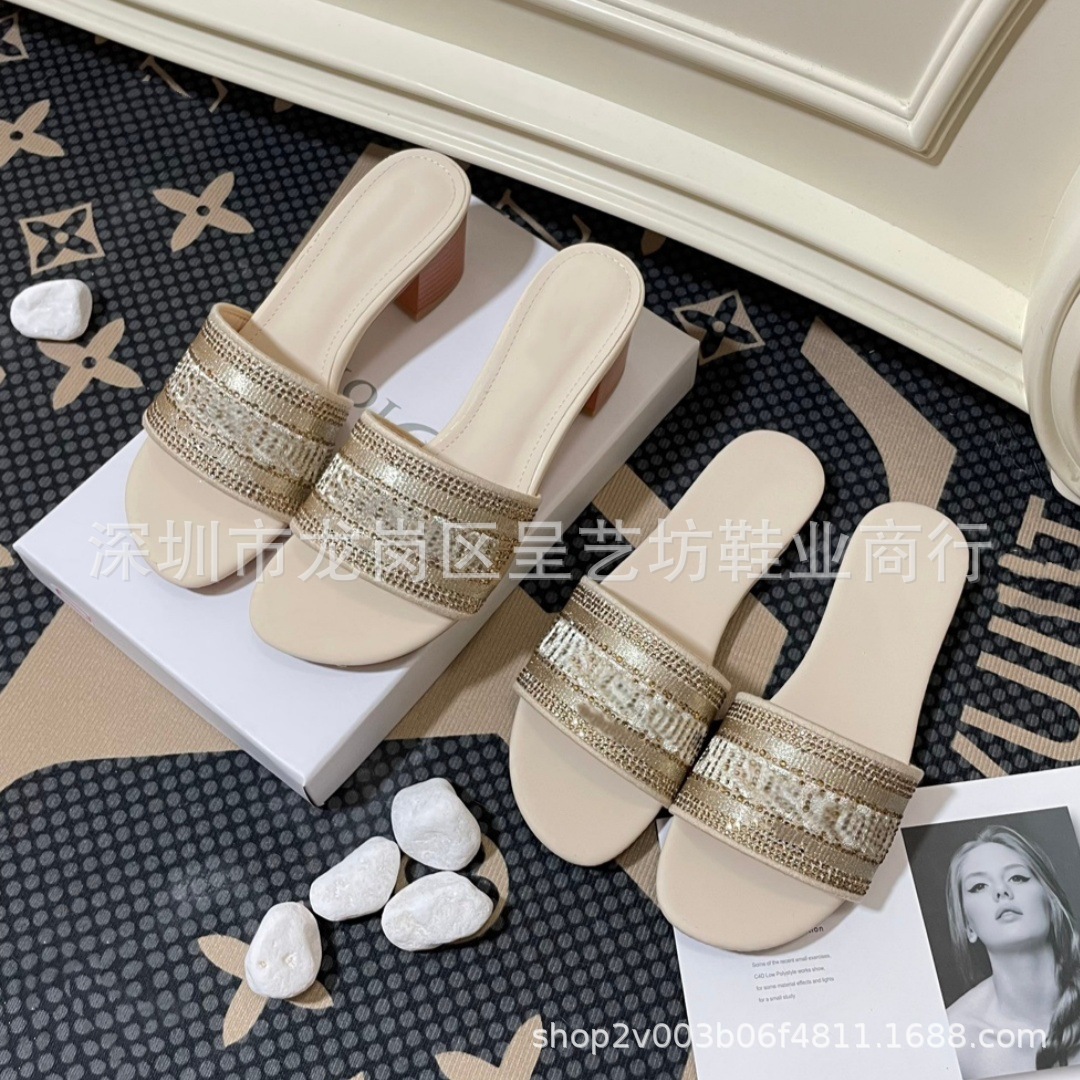 2026新款D家刺绣拖鞋女夏外穿粗跟水钻平底一字凉拖鞋外贸高跟鞋