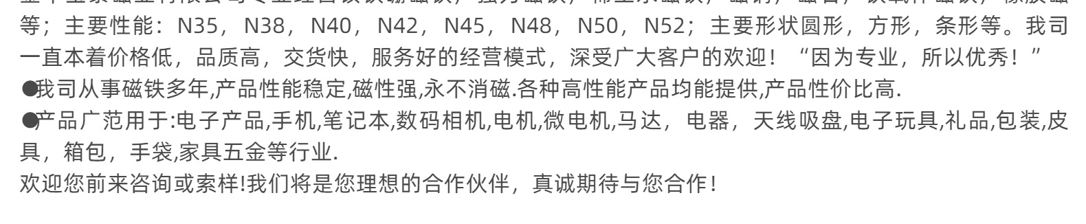 推荐理由:单面强磁包装盒磁铁钕铁硼强力磁铁圆形磁铁书本盒用磁单面强磁包装盒磁铁钕铁硼强力磁铁圆形磁铁书本盒用磁单面强磁包装盒磁铁钕铁硼强力磁铁圆形磁铁书本盒用磁单面强磁包装盒磁铁钕铁硼强力磁铁圆形磁铁书本盒用磁