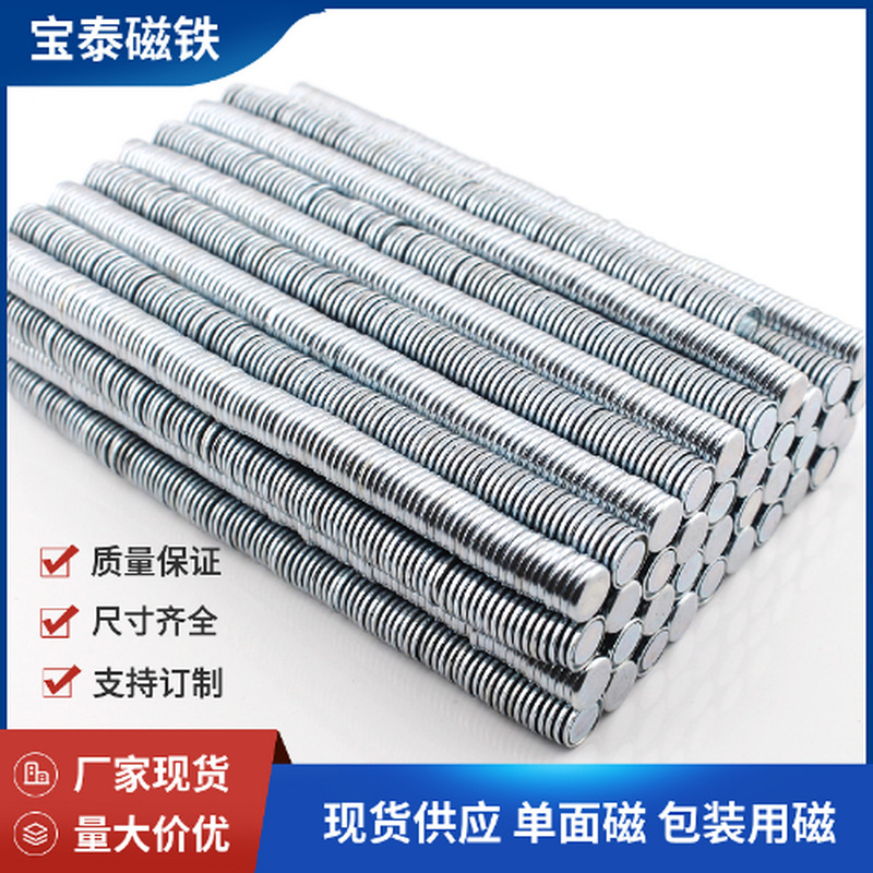 宝泰磁业从事生产圆形磁,单面包装磁铁, 长方形磁铁,圆形打孔磁铁,打捞磁铁等尺寸全部都有现货,价格实惠,量大从优。可按客户要求定制。