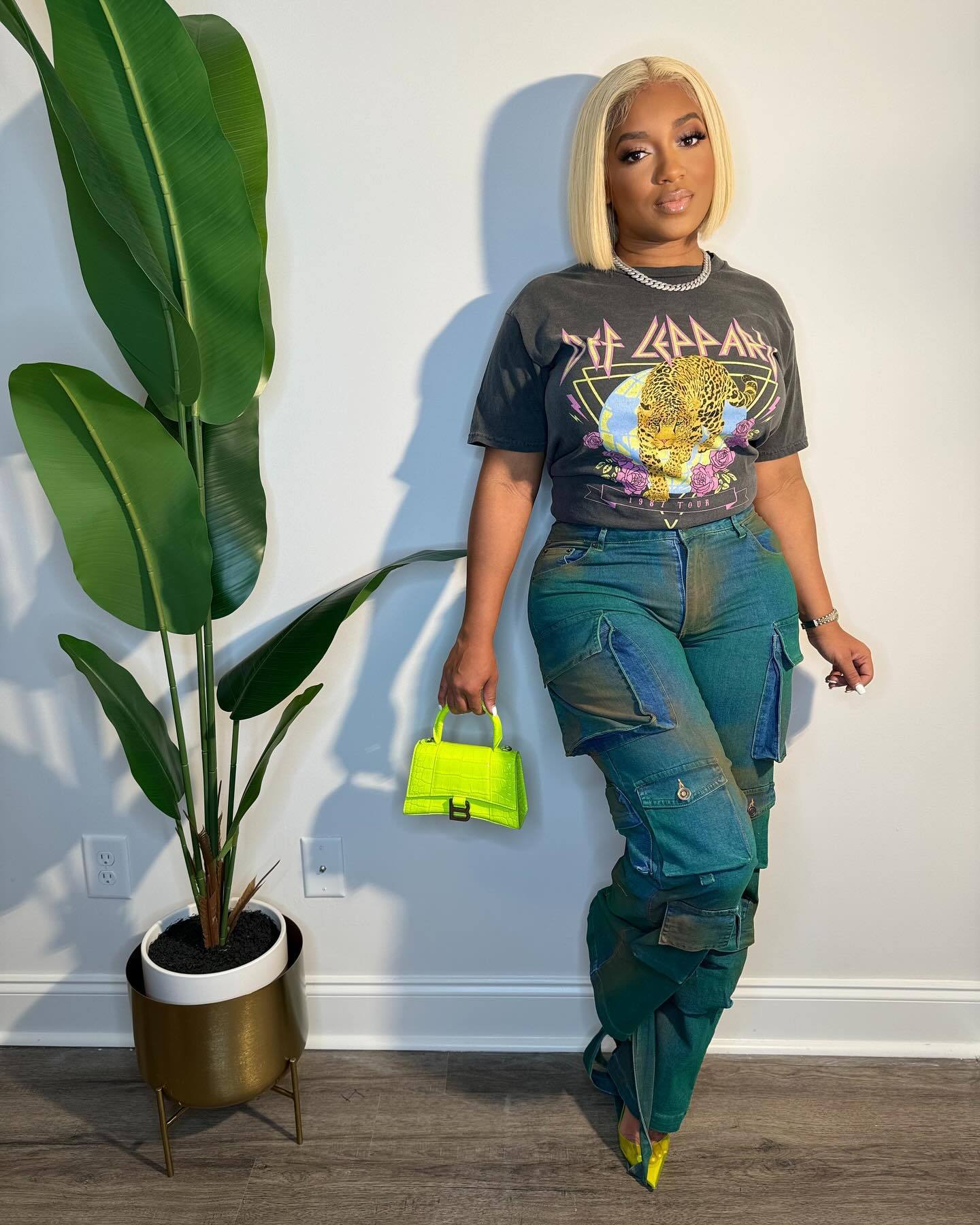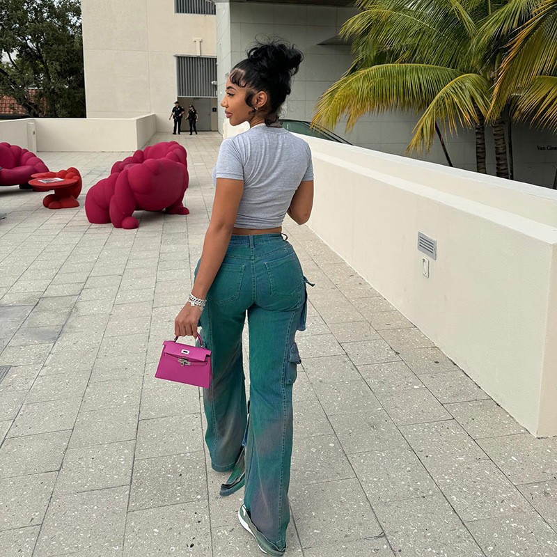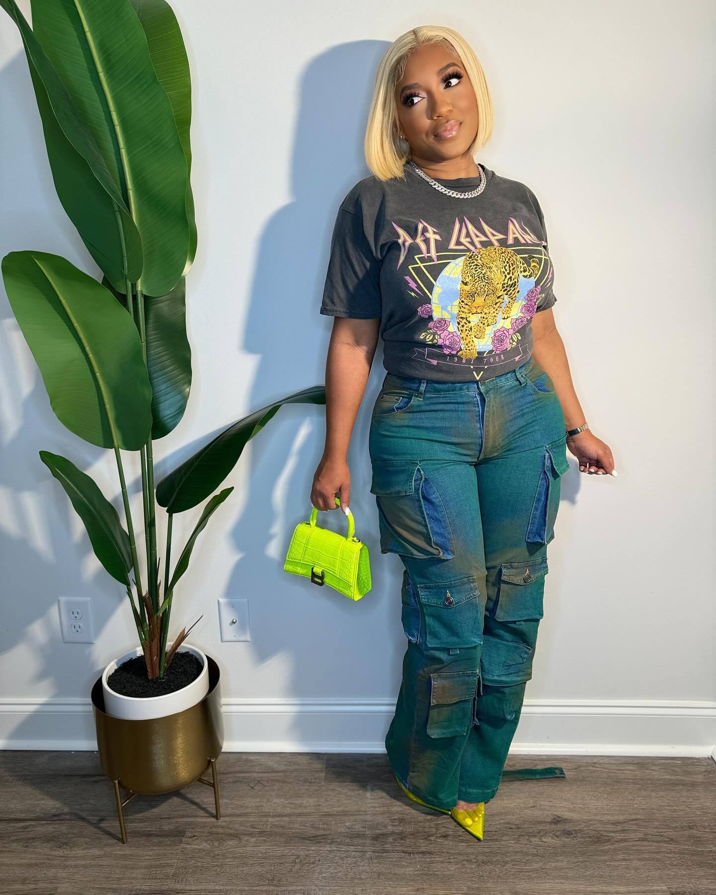 欧美女装弹力面料亚马逊潮流风多口袋宽松阔腿喷色牛仔直筒工装裤