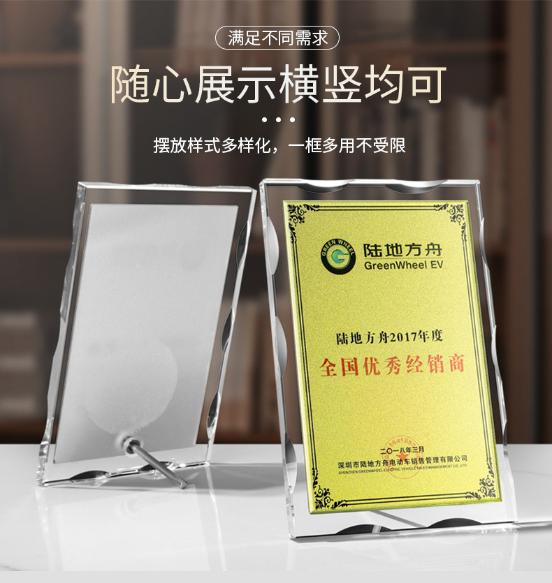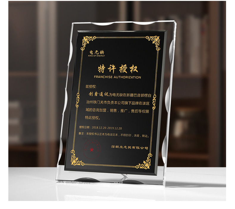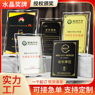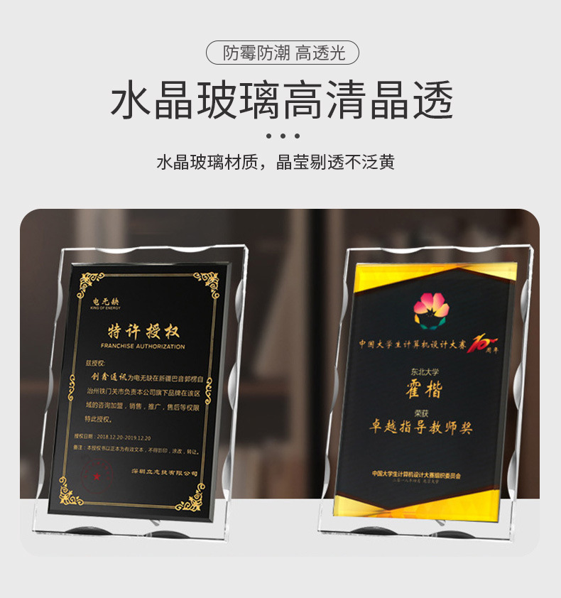 工厂直发水晶玻璃授权牌荣誉牌匾奖杯制作授权书证书打印奖牌定制