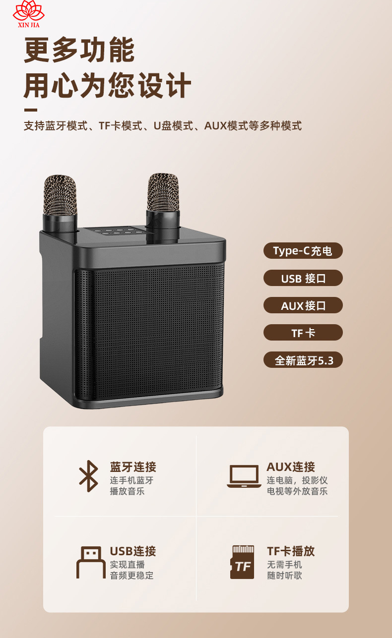 支持通过AUX音频口连接电视,在家就能唱KTV;