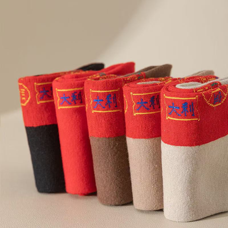 脚踏七星袜子大红色本命年男女中筒棉袜脚底连珠铜钱结婚吉祥转运