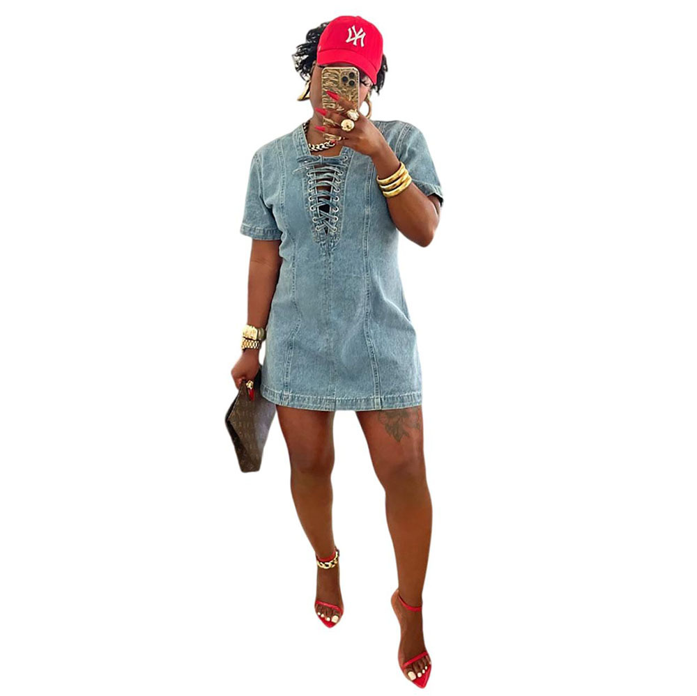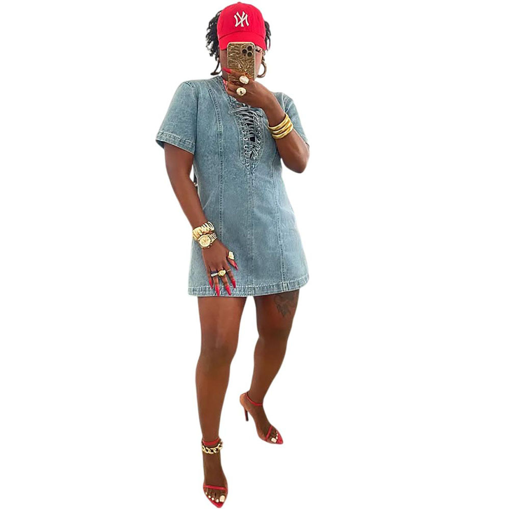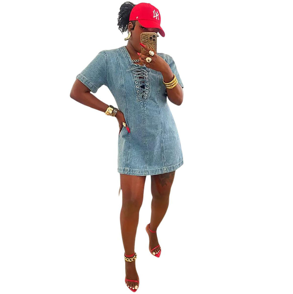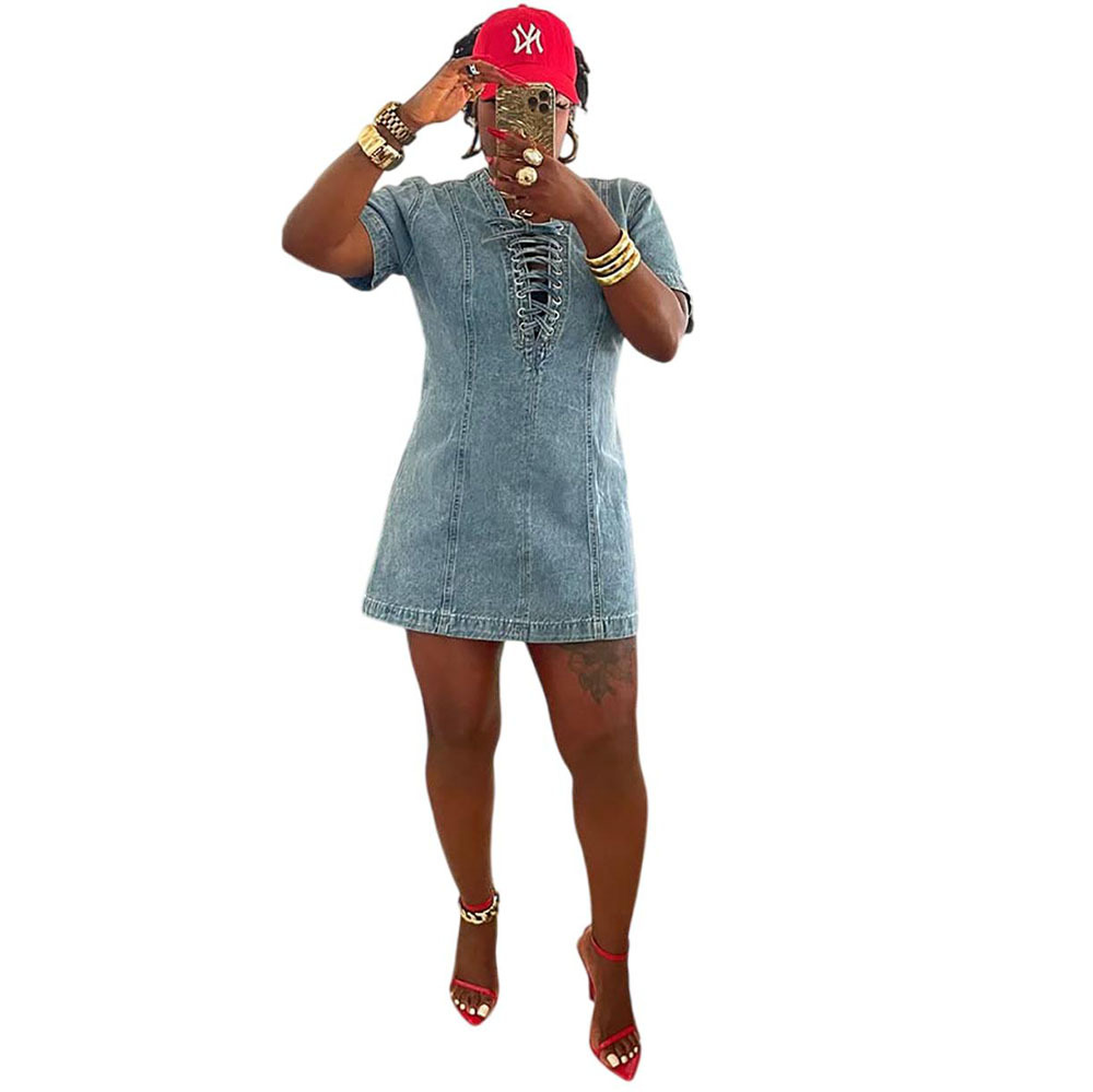 欧美女式牛仔连衣裙 亚马逊跨境女装夏季街头时尚系带短袖牛仔裙