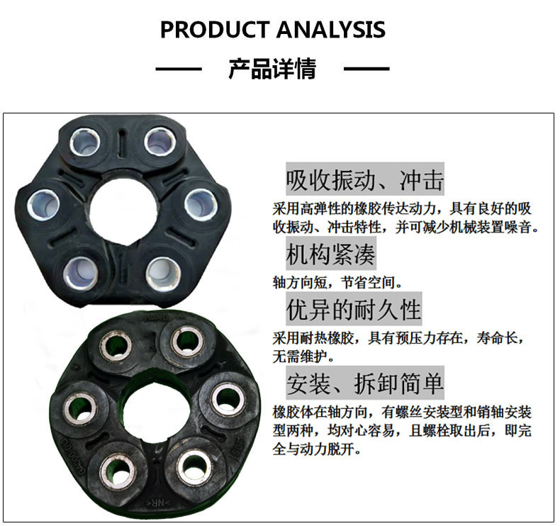 由富有弹性的橡胶传动。能出色地吸收振动和冲击,减少机械装置的噪音。弹性体的橡胶部分由多角形橡胶及填入其顶点的铝构成,各被坚固地硫化粘结在一起。将此橡胶体分别与圆筒衬套和法兰盘衬套用螺栓沿径向和轴向连接,通过橡胶体进行传动。特别是径向的螺栓连接,因是将预先变形的橡胶体与圆筒衬套连接,所以为预压缩结构,具有出色的柔性,可进行出色地吸收振动和冲击的传动。橡胶体有用螺栓固定安装在轴向上的O0 (O零)型和不固定,利用插入安装用的S螺栓进行传动的S0 (S零)型两种,可根据装卸要求选购。