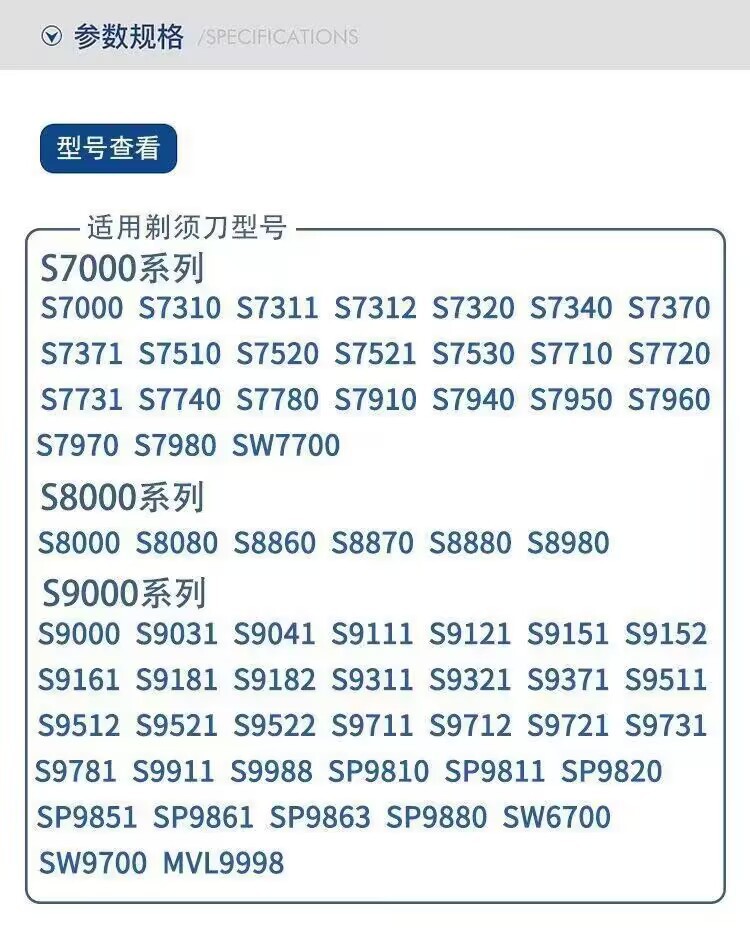 型号:SH90刀头 卡装3个装(包含3刀片+3刀网)适用于飞利浦剃须刀型号S9000 S8000 S7000 RQ10 RQ12等等,更多型号请咨询客服。