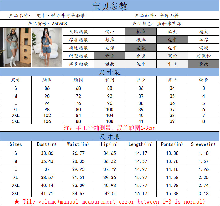欧美女式牛仔裤套装跨境女装休闲水洗拼色短袖上衣翻边高腰牛仔裤