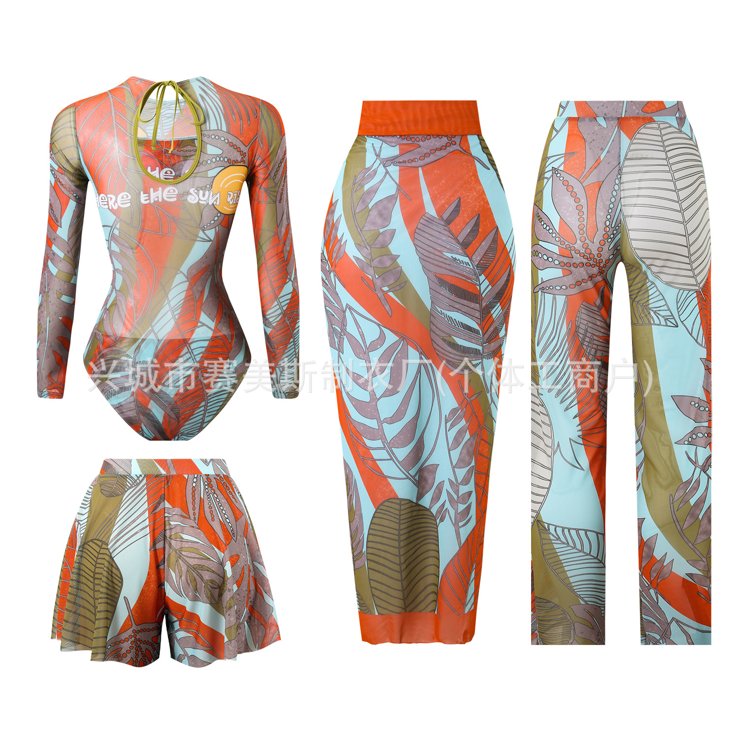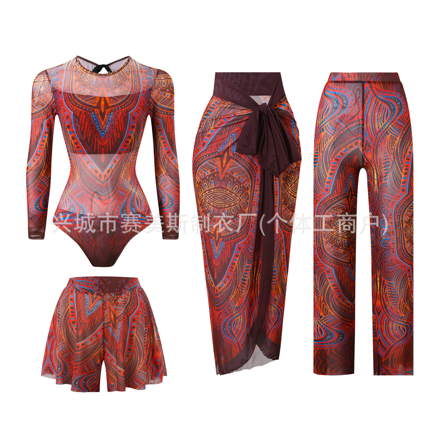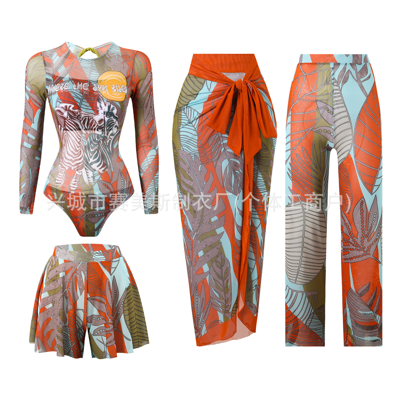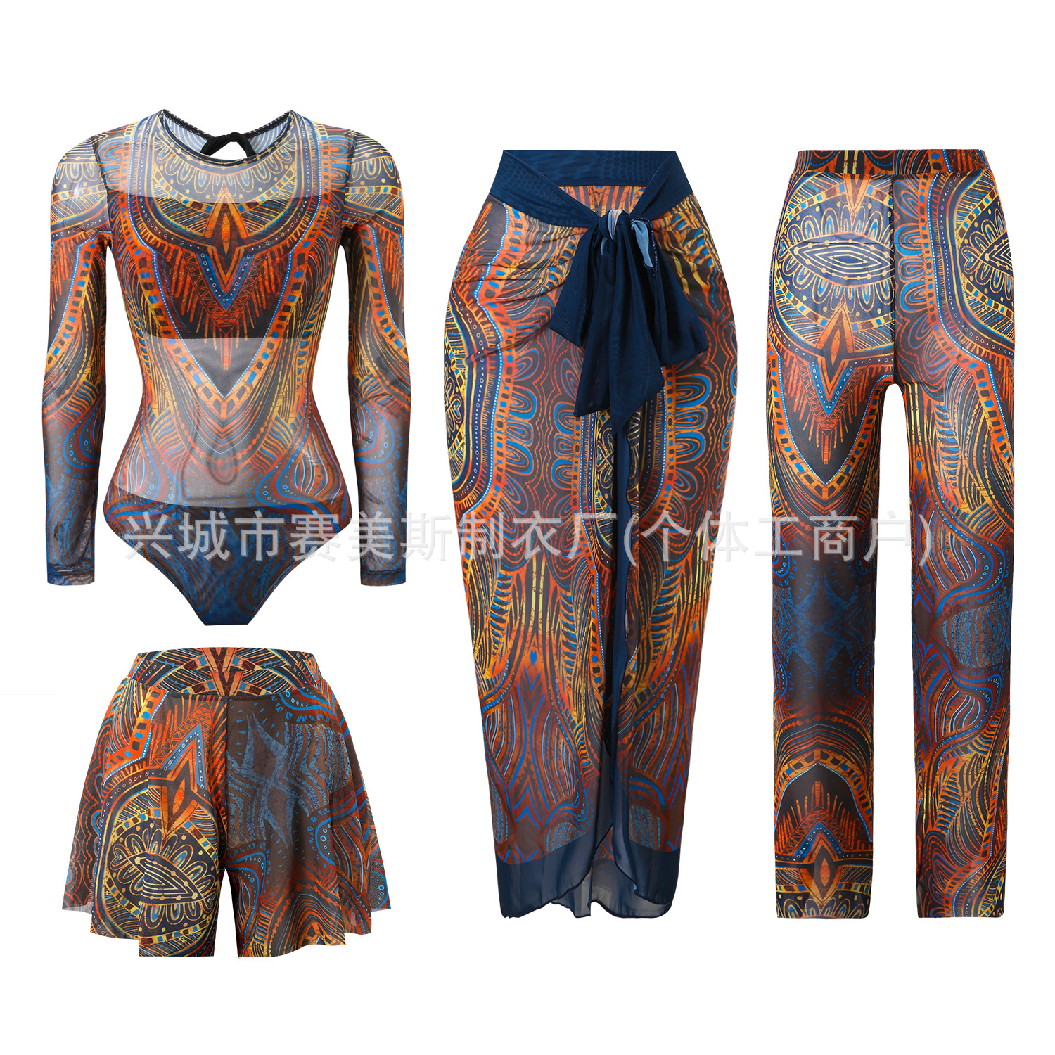 Купальник连体长袖防晒泳衣四件套网纱长裤俄罗斯泳衣女