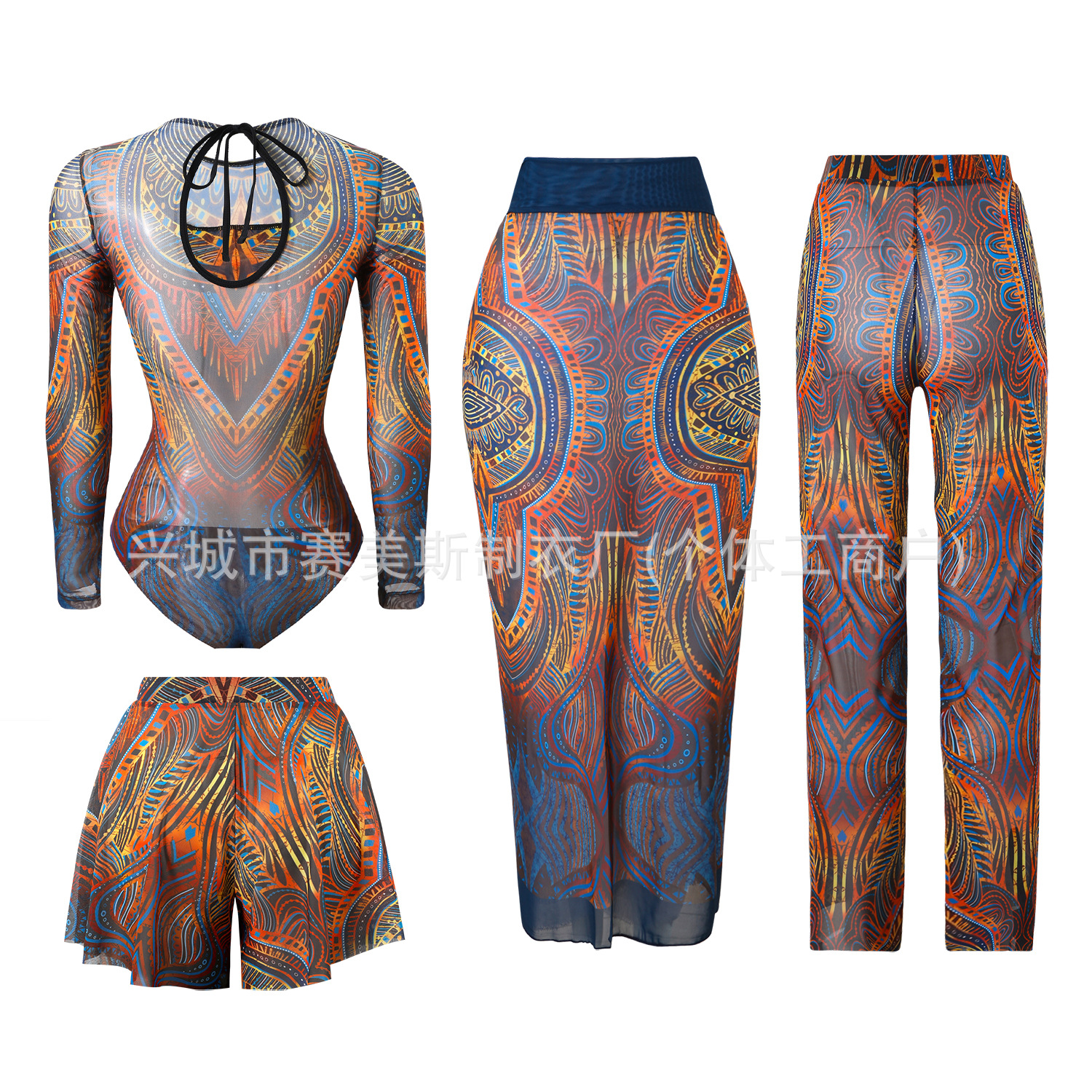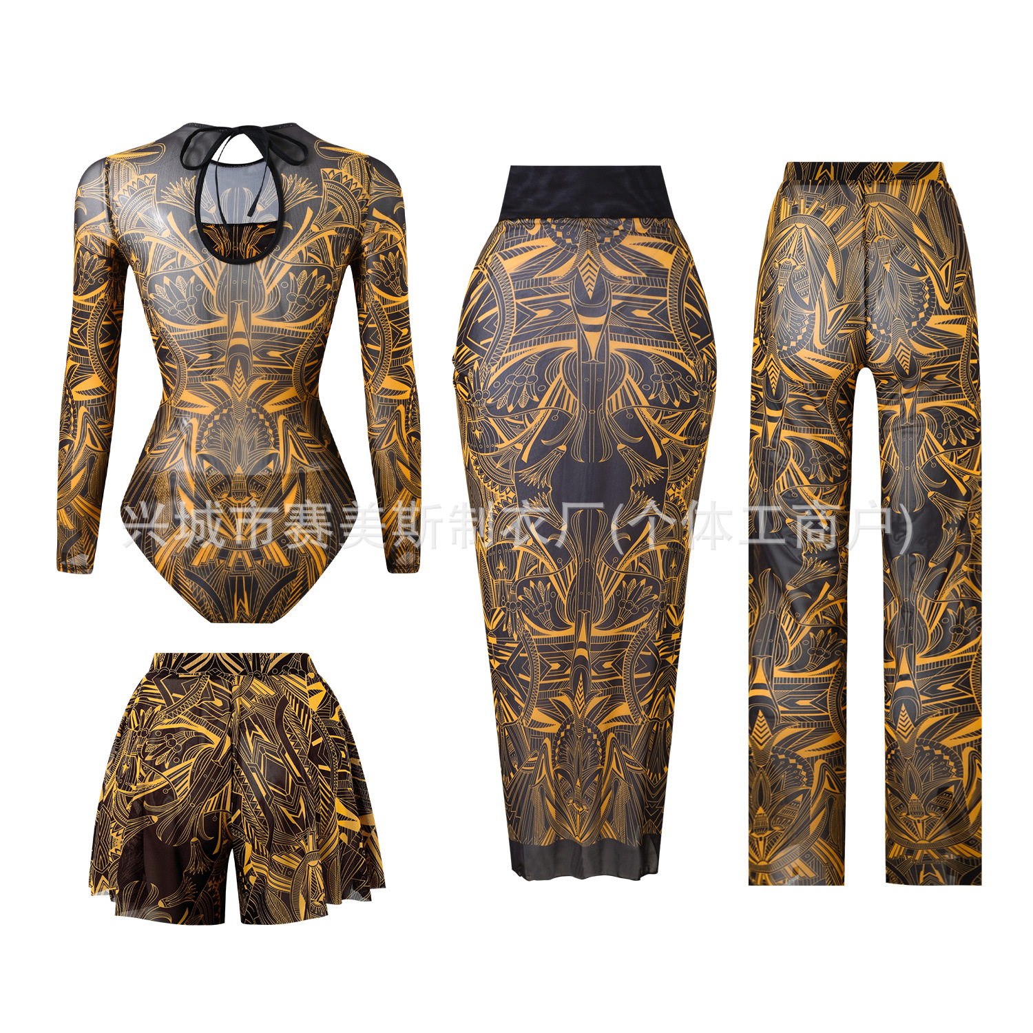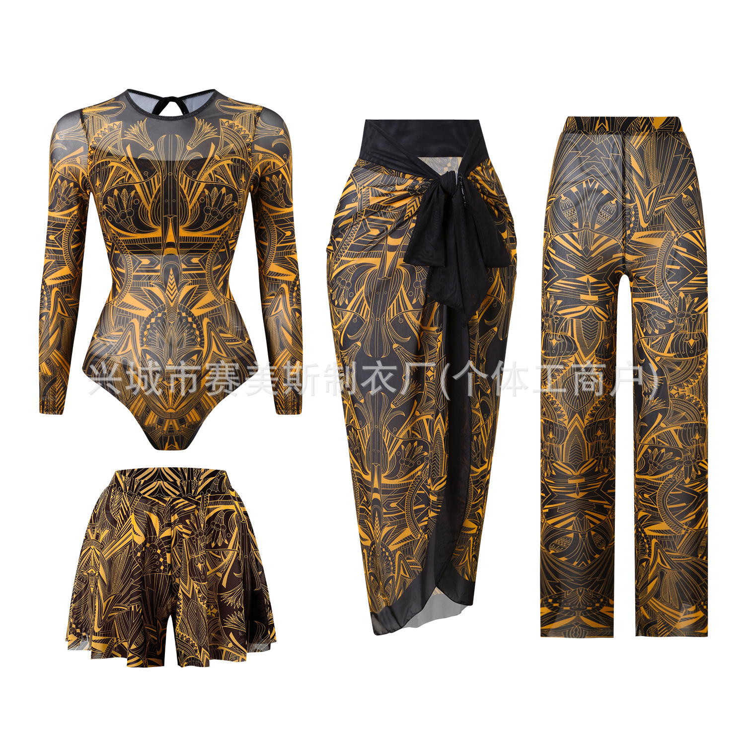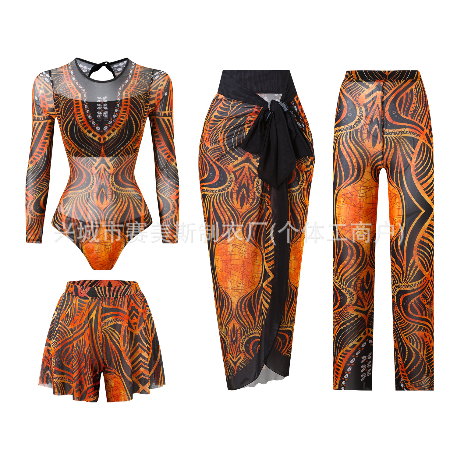 Купальник连体长袖防晒泳衣四件套网纱长裤俄罗斯泳衣女