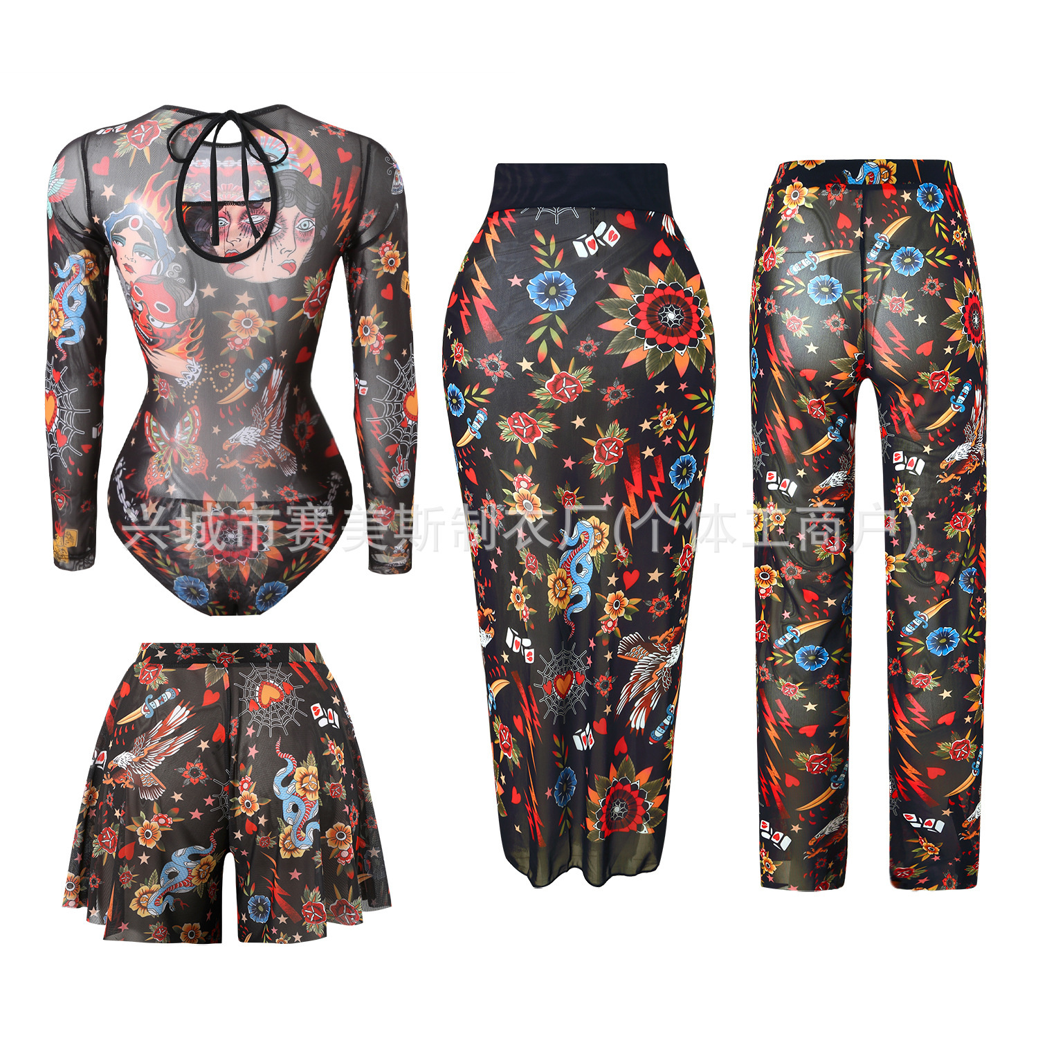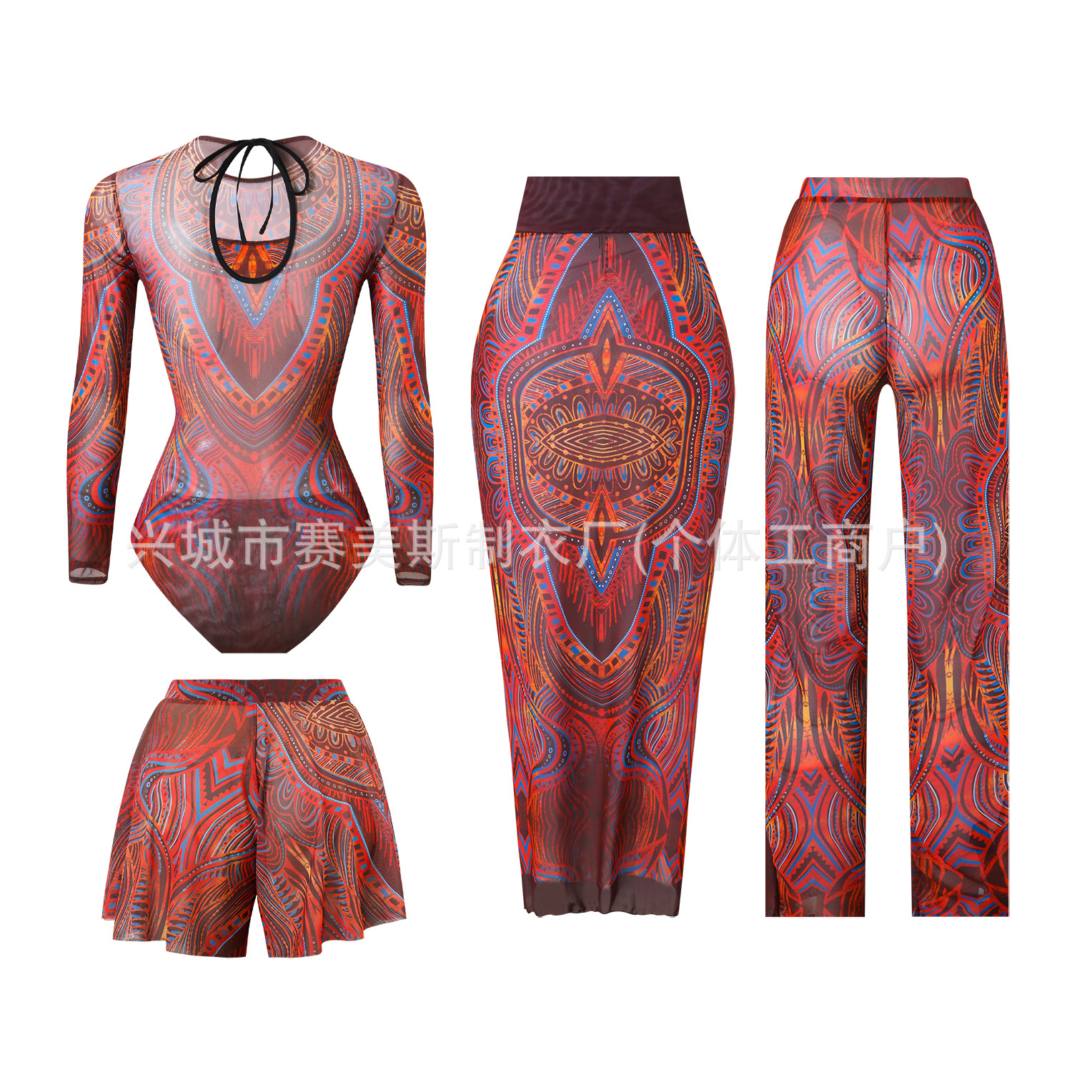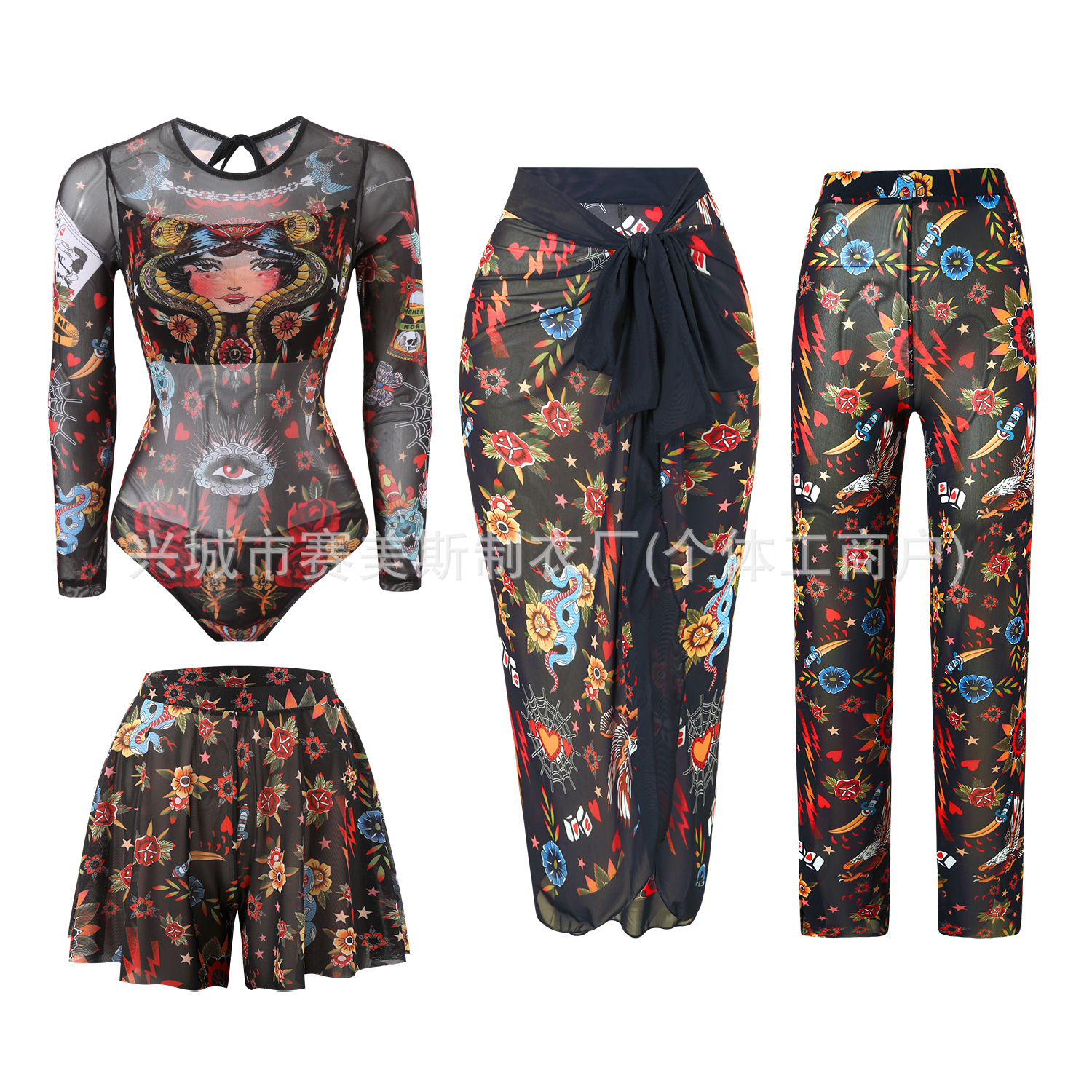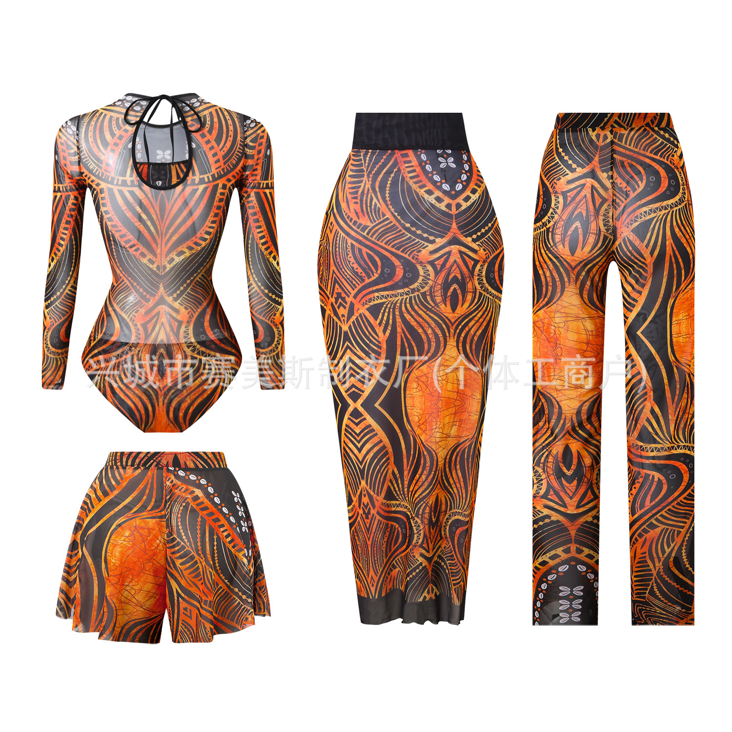 Купальник连体长袖防晒泳衣四件套网纱长裤俄罗斯泳衣女