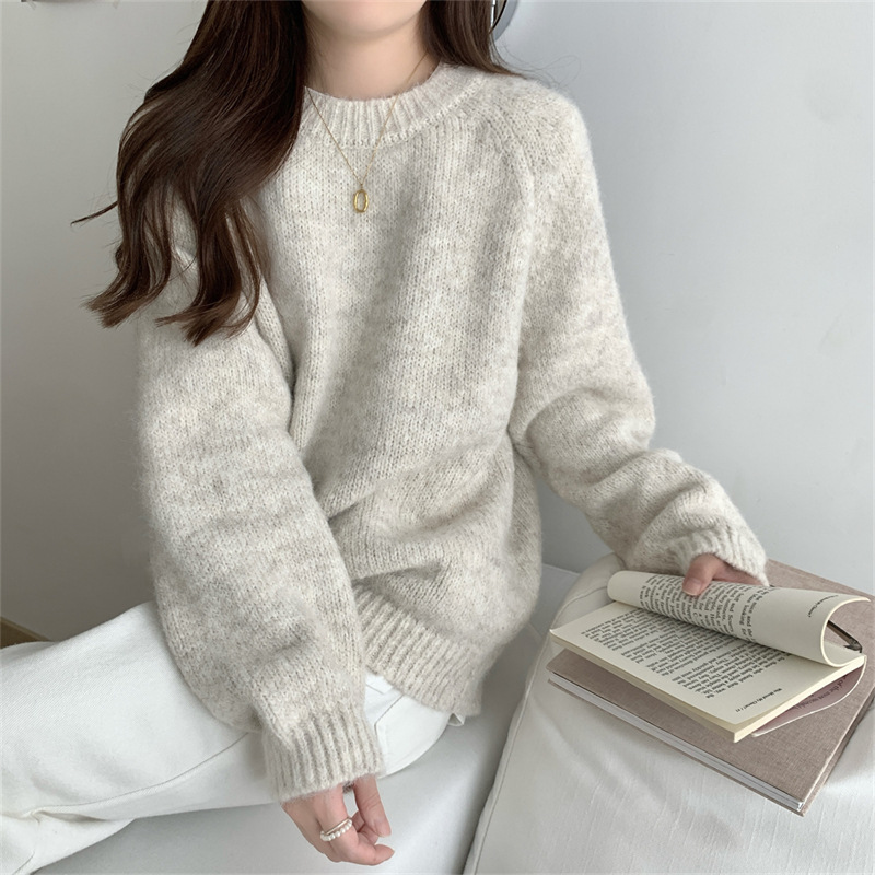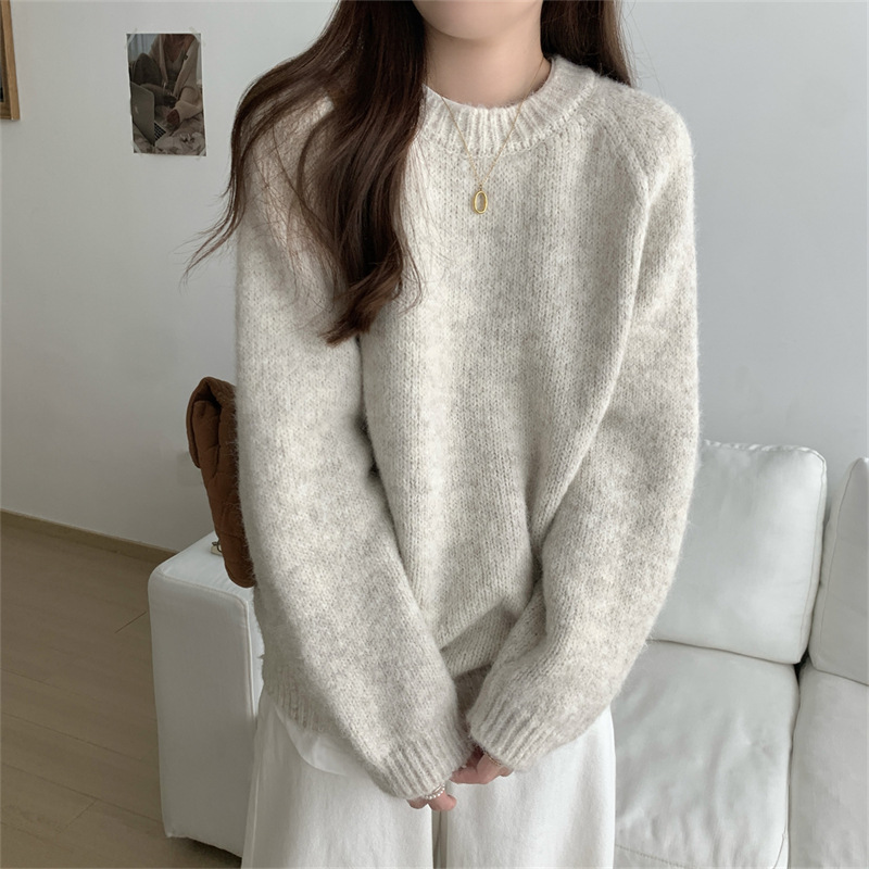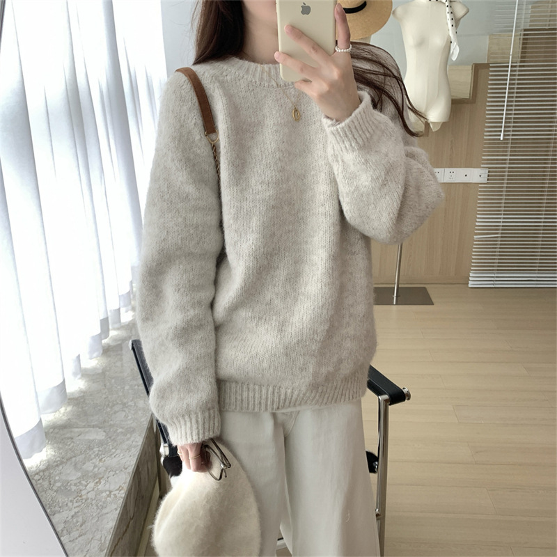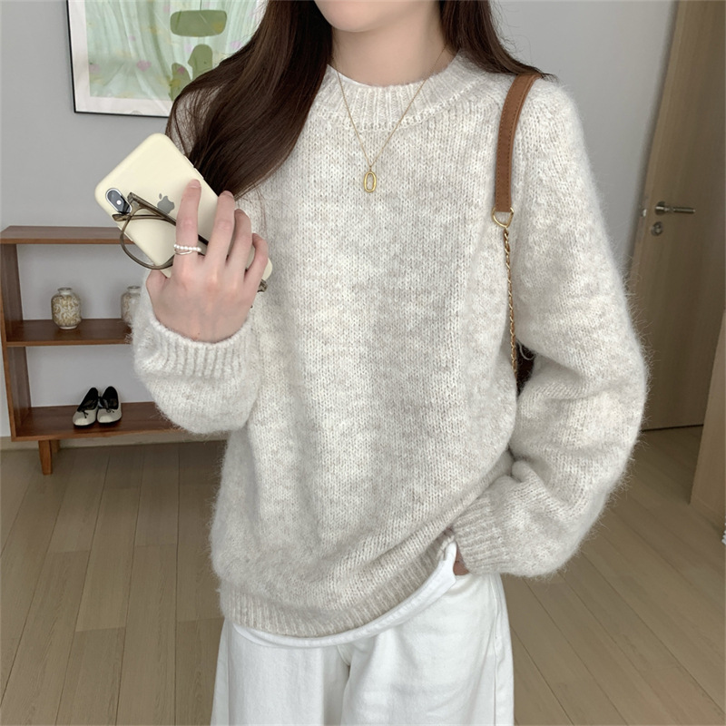 软糯温柔慵懒风毛衣女秋冬季新款韩系宽松内搭圆领套头针织衫上衣