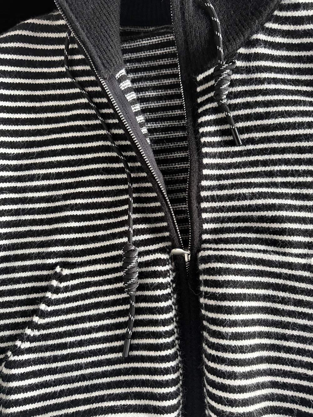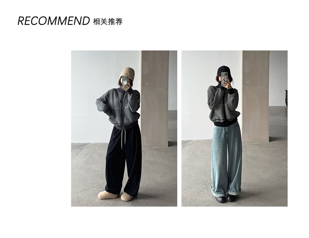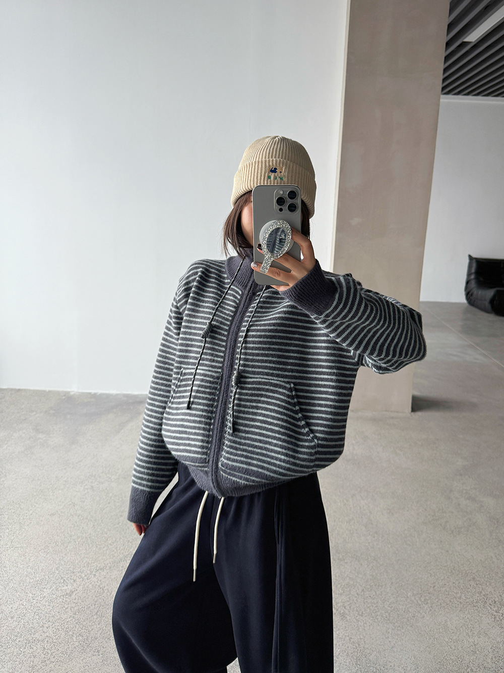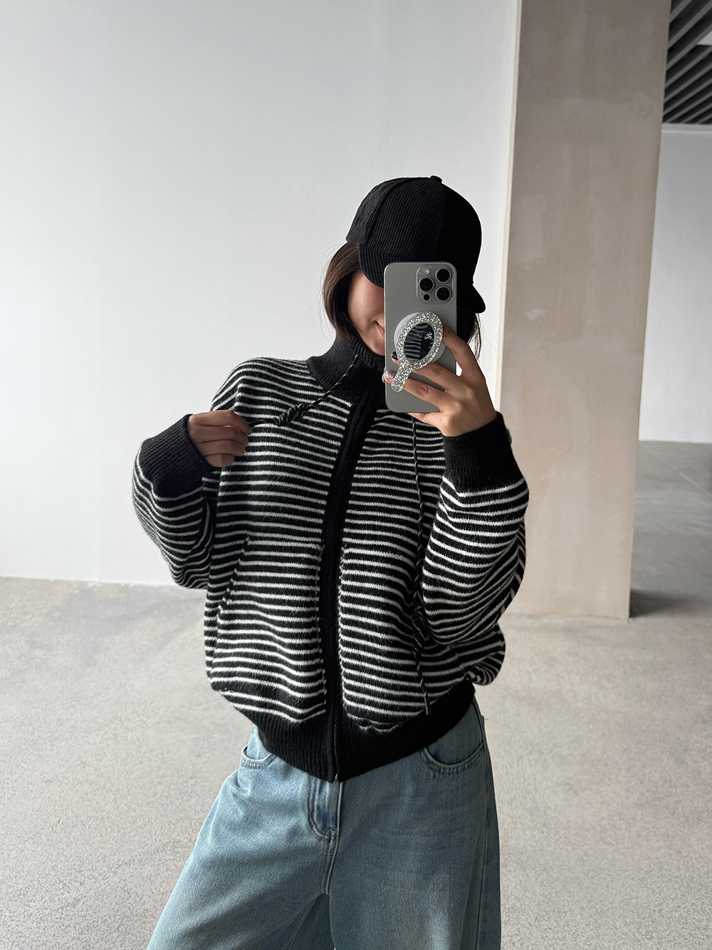 【王琪芝】条纹宽松拉链毛衣女慵懒风针织外套休闲通勤开衫WQ053