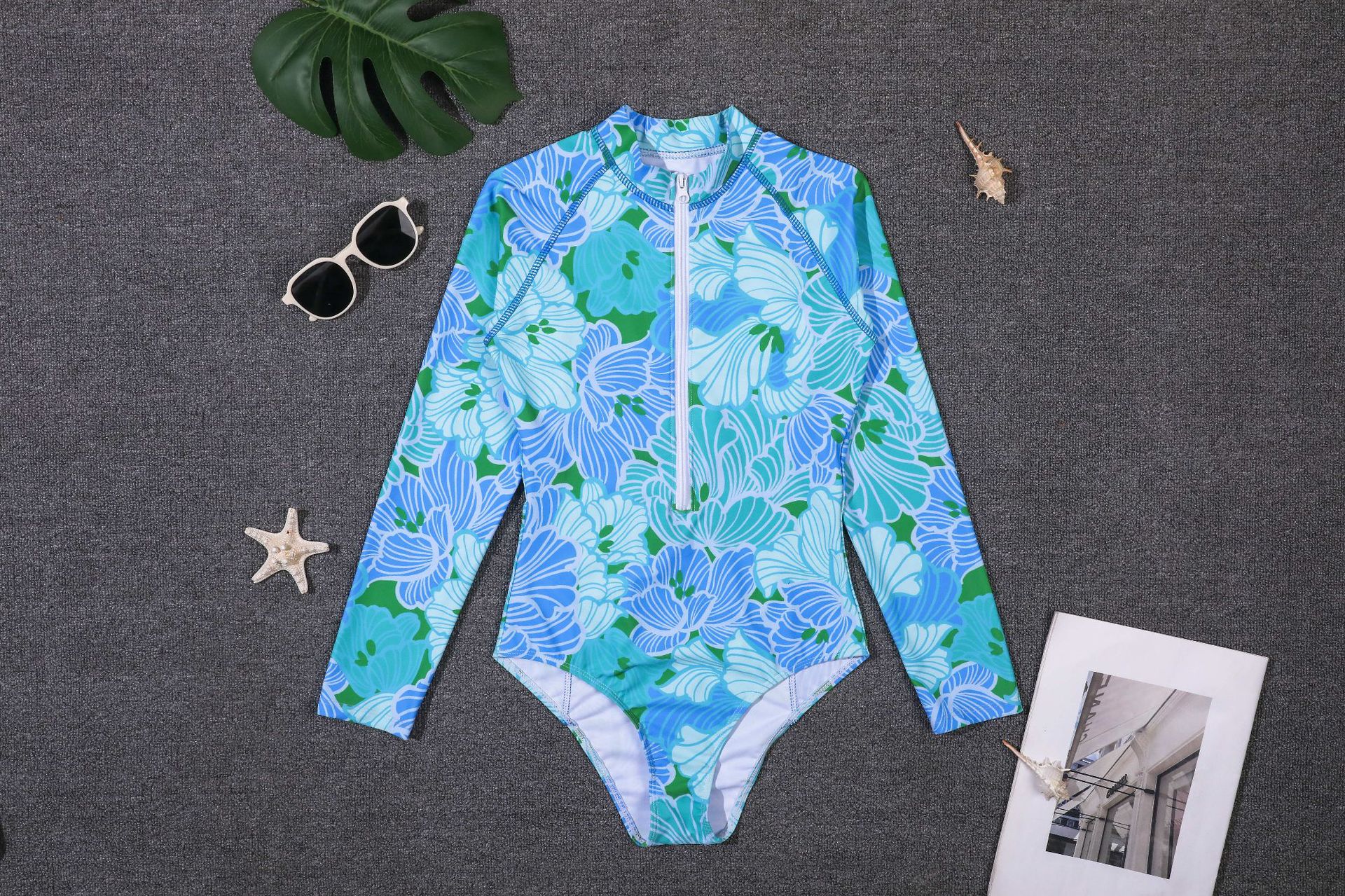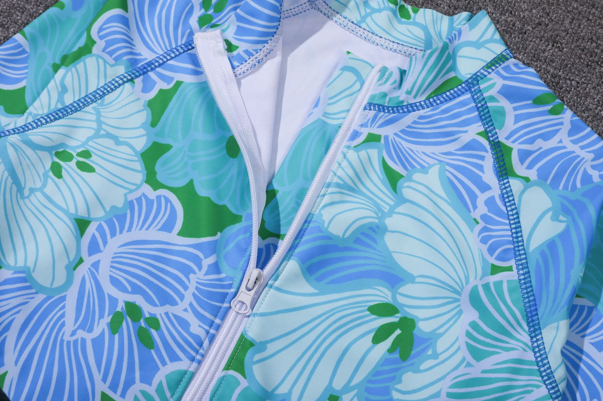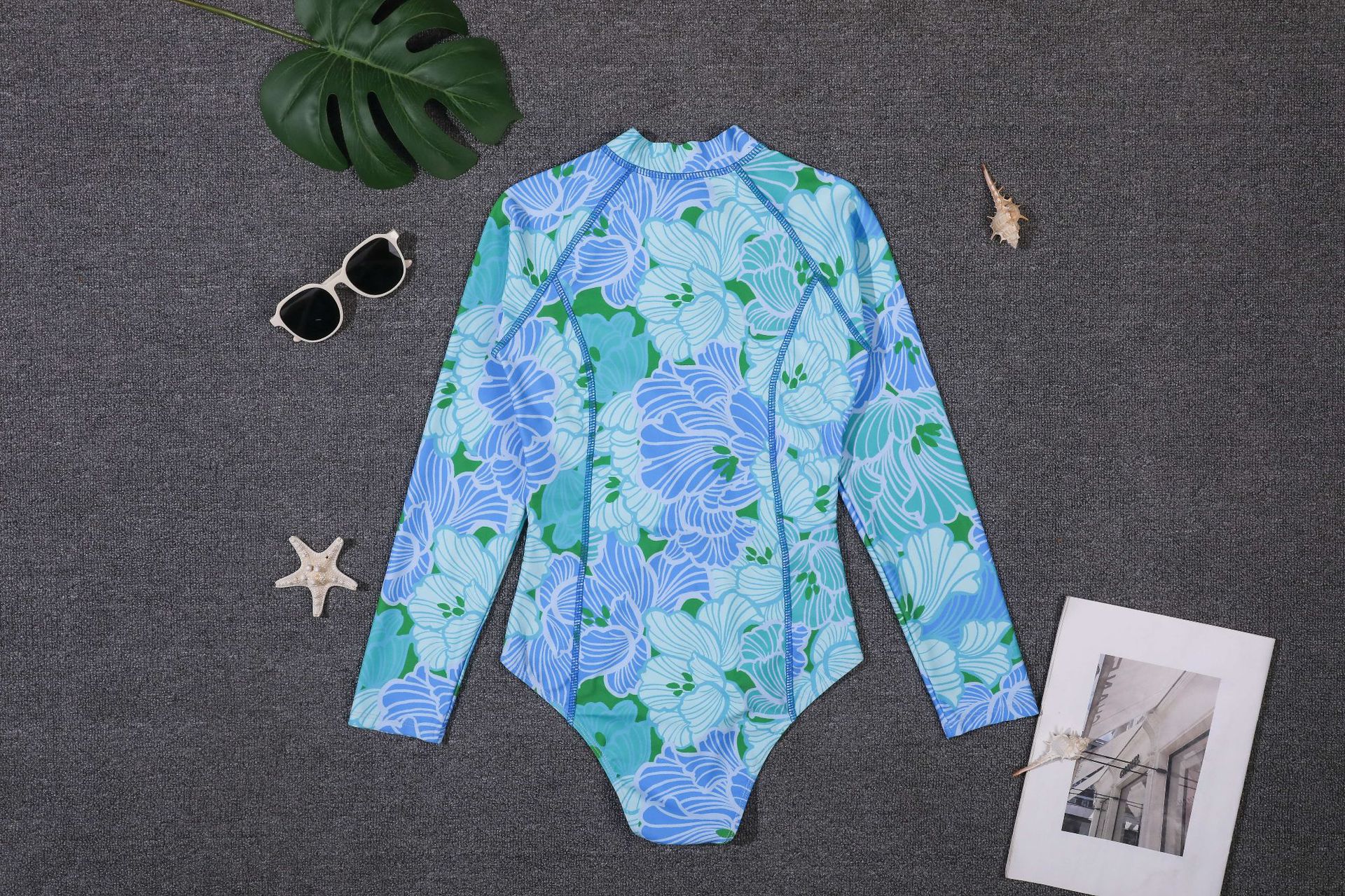 欧美冲浪潜水服多色连体泳衣花卉印花修身泳装长袖温泉派对泳池女