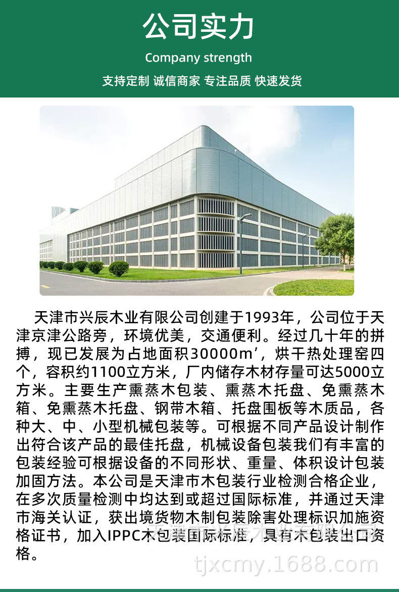 推荐理由:天津市兴辰木业有限公司创建于1993年,公司位于天津京津公路旁,环境优美,交通便利。经过几十年的拼搏,现已发展为占地面积30000㎡,烘干热处理窑三个,容积约1100立方米,厂内储存木材存量可达500