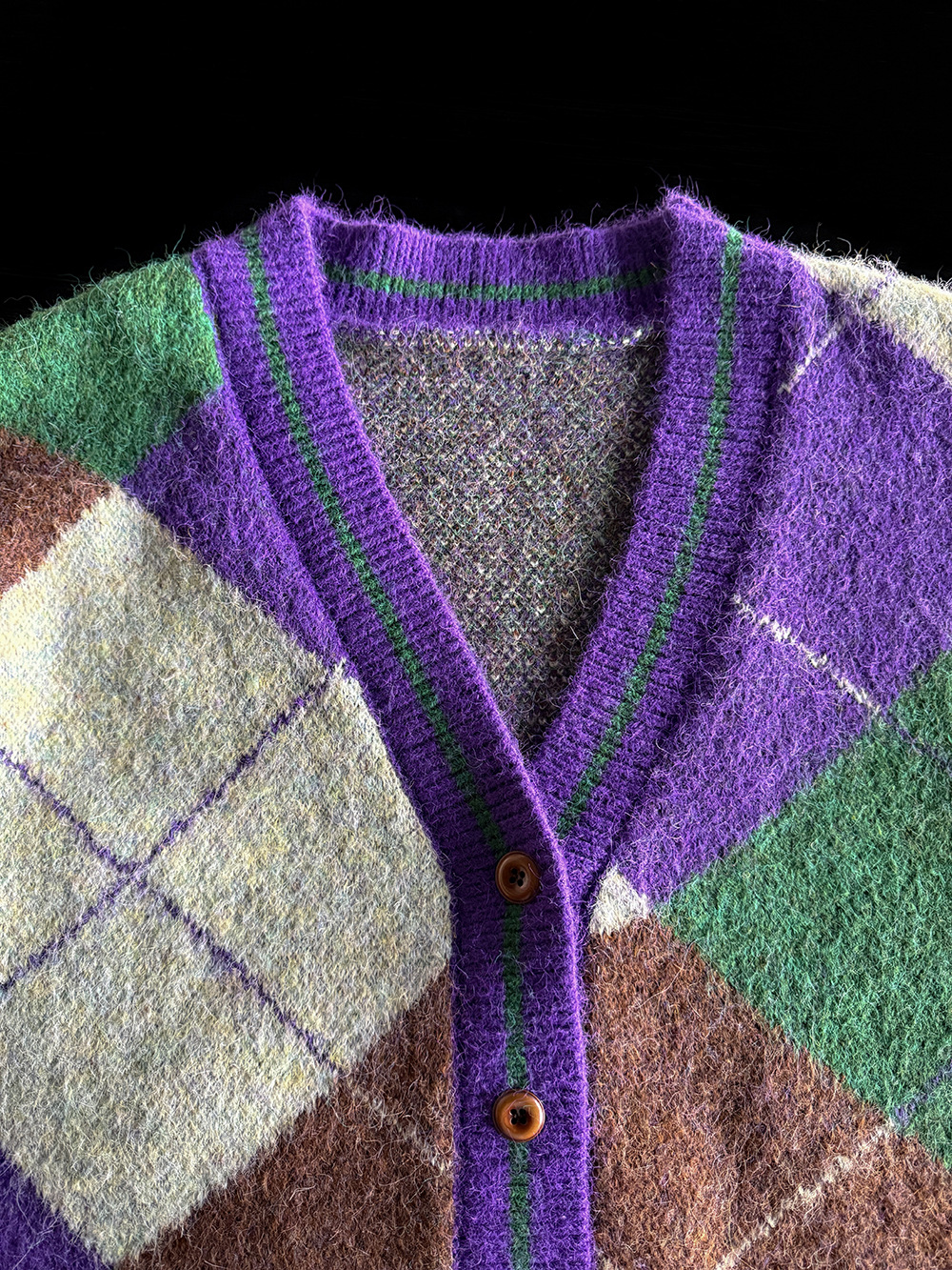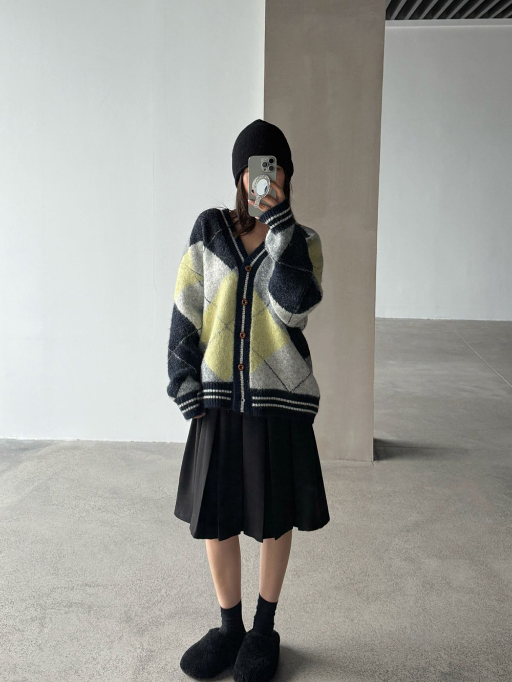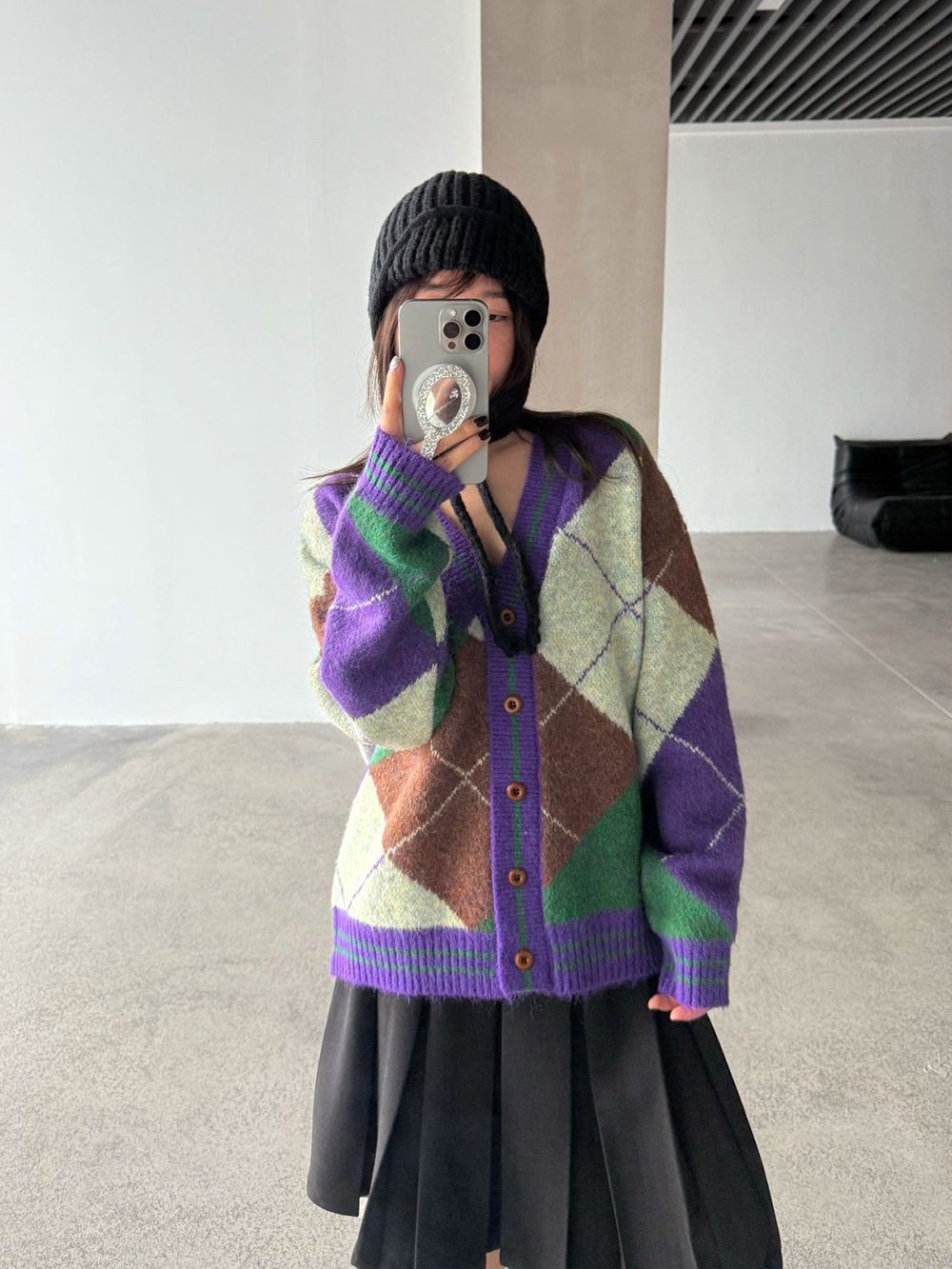 【王琪芝】韩系撞色羊毛菱格针织开衫女冬宽松显瘦毛衣外套WQ063