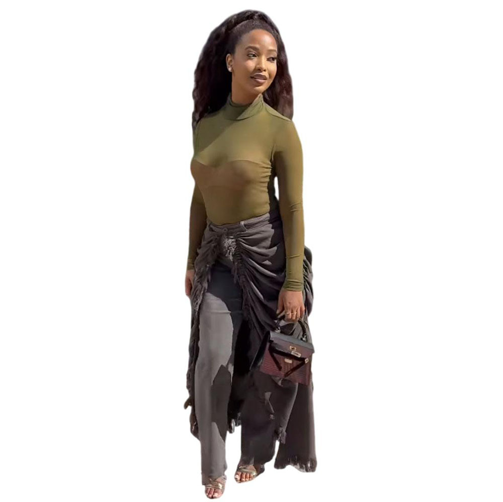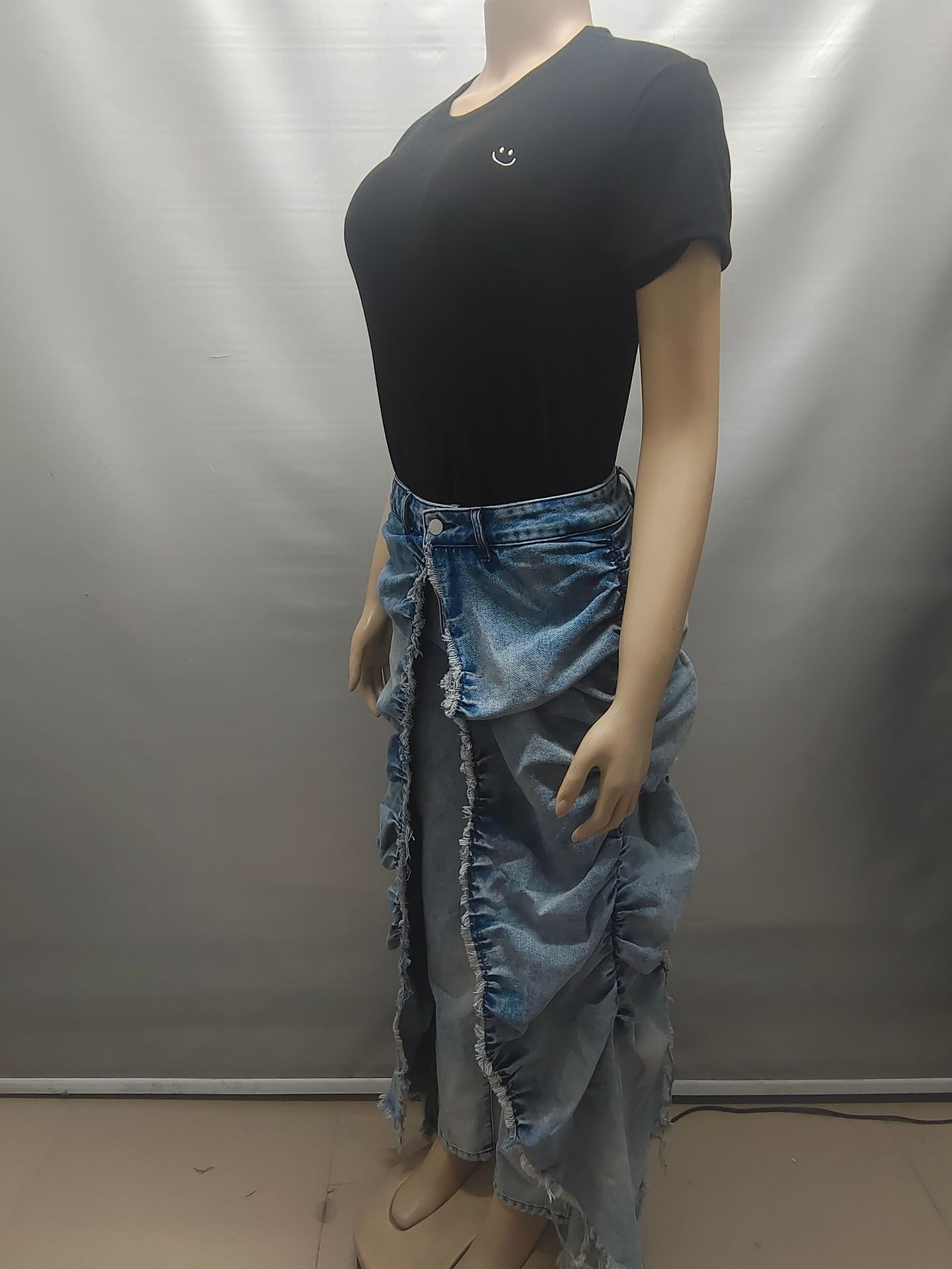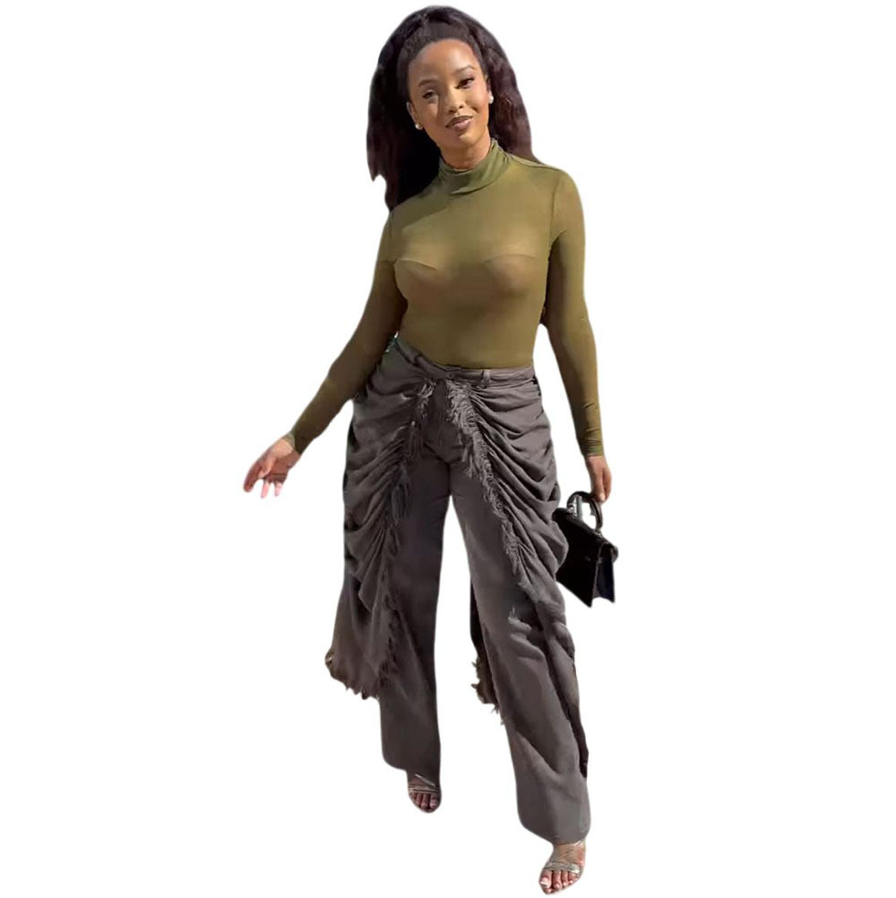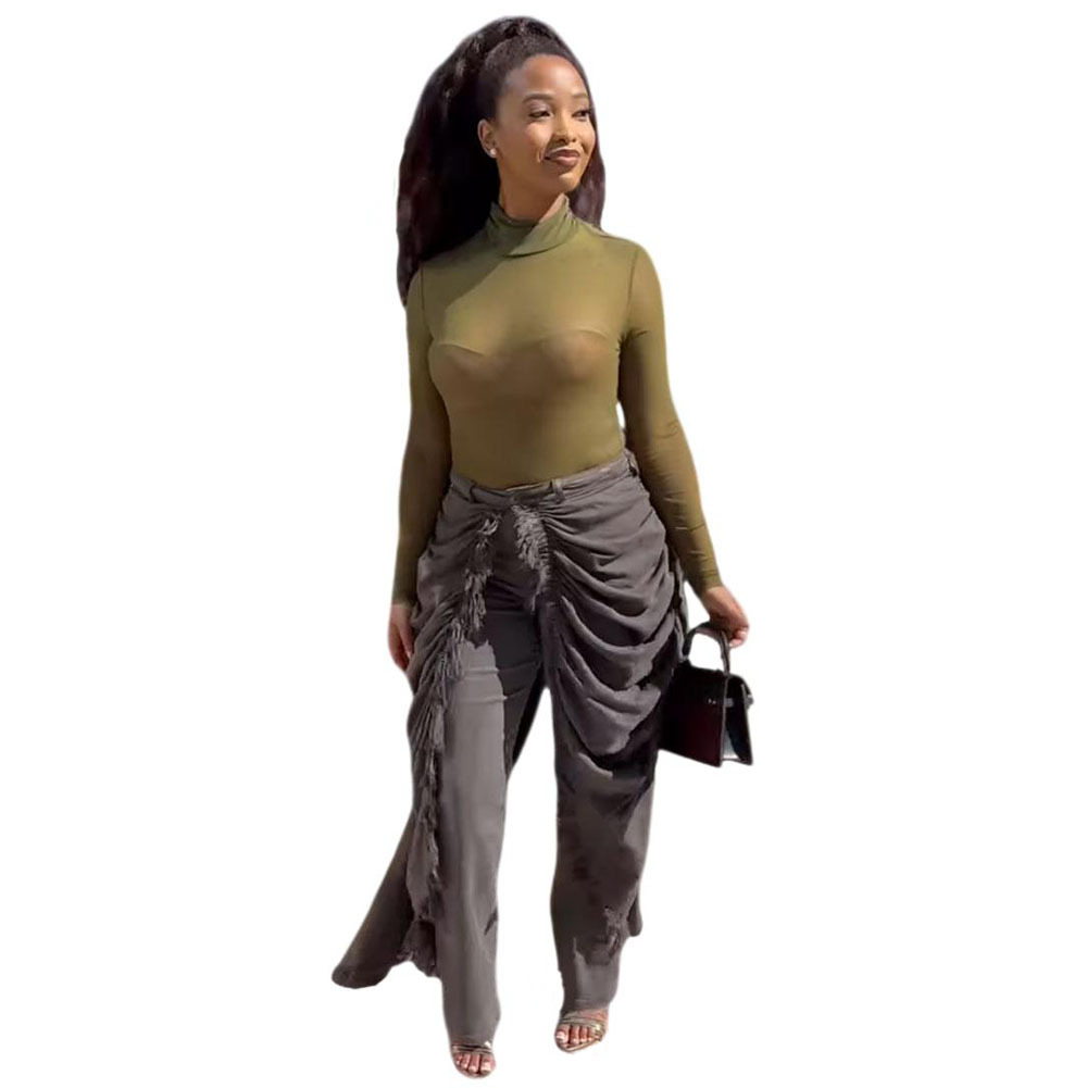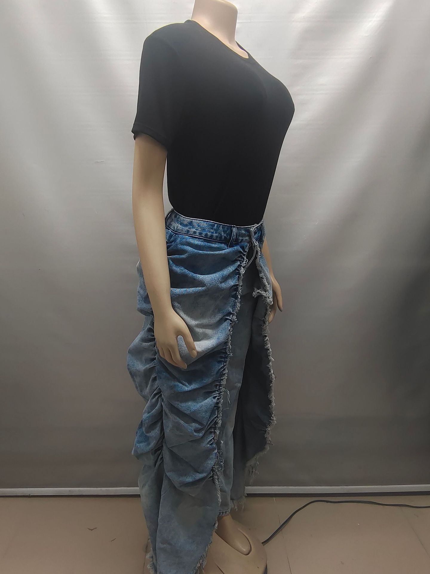 欧美女式高腰牛仔裤亚马逊跨境新款女装时尚个性褶皱磨毛边直筒裤