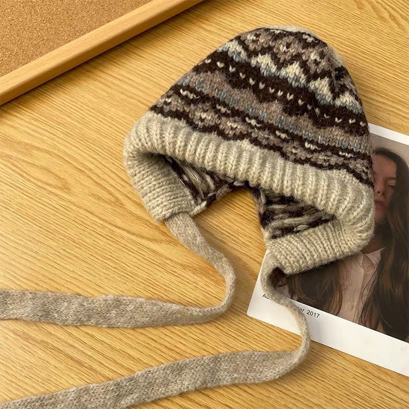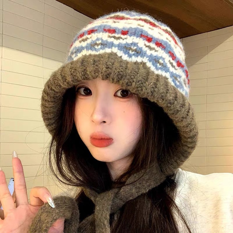 帽子女冬季针织加厚保暖韩版抽绳堆堆帽费尔岛风复古百搭毛线帽女