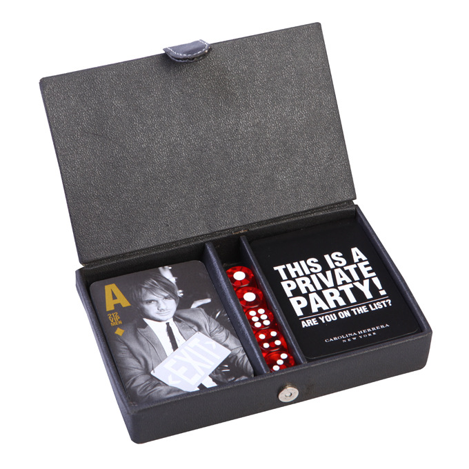 可定制生产各种扑克牌套装,采用铁盒/硬纸盒/铝箱/皮盒等包装,搭配扑克牌、筹码、骰子、记录本、圆珠笔等配件。特别高档的包装盒最好是客户自己提供。