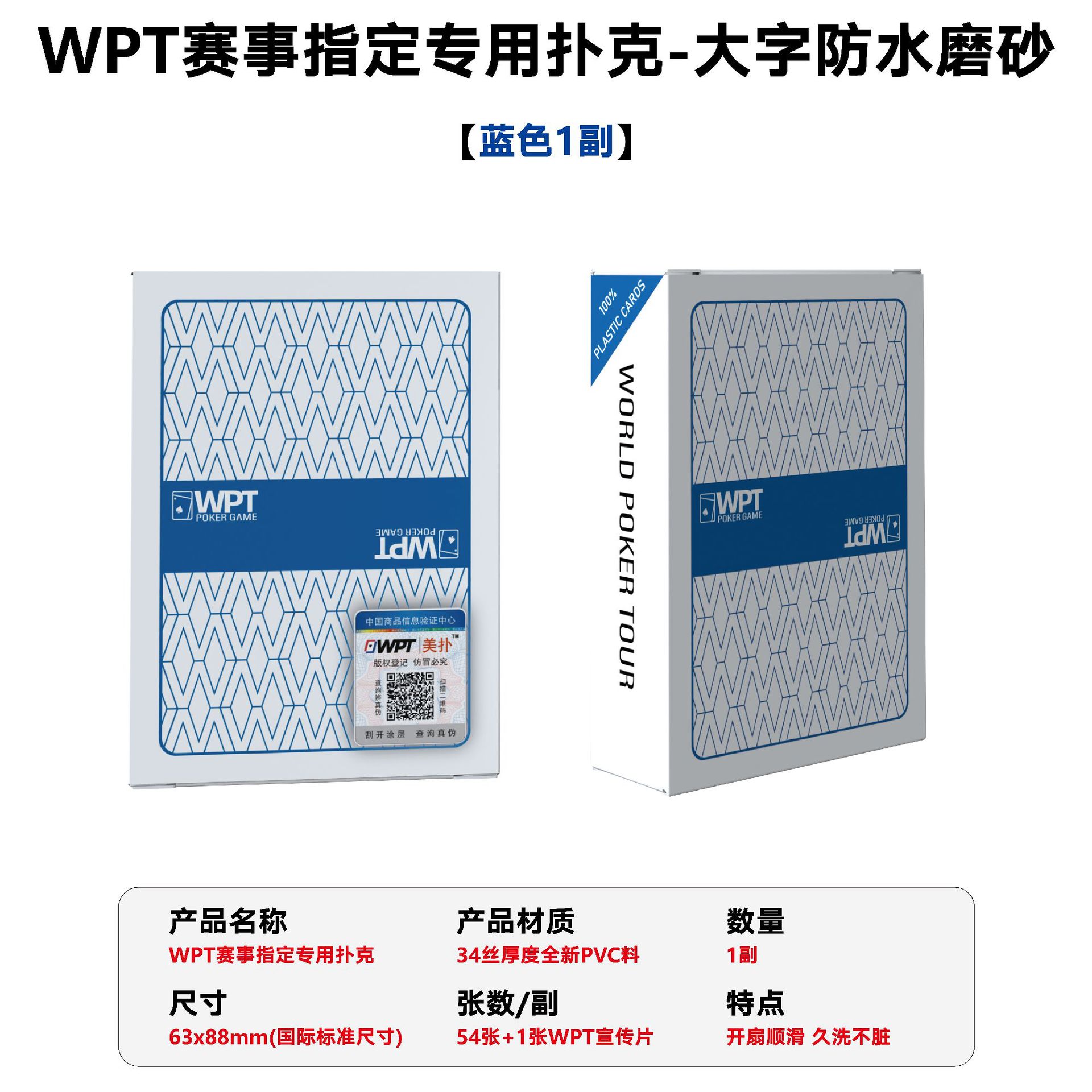 推荐理由:WPT赛用德州扑克牌,专业高品质,防水耐磨大字磨砂高遮光,耐洗一百遍,开扇顺滑适合发牌机使用!带溯源防伪标签