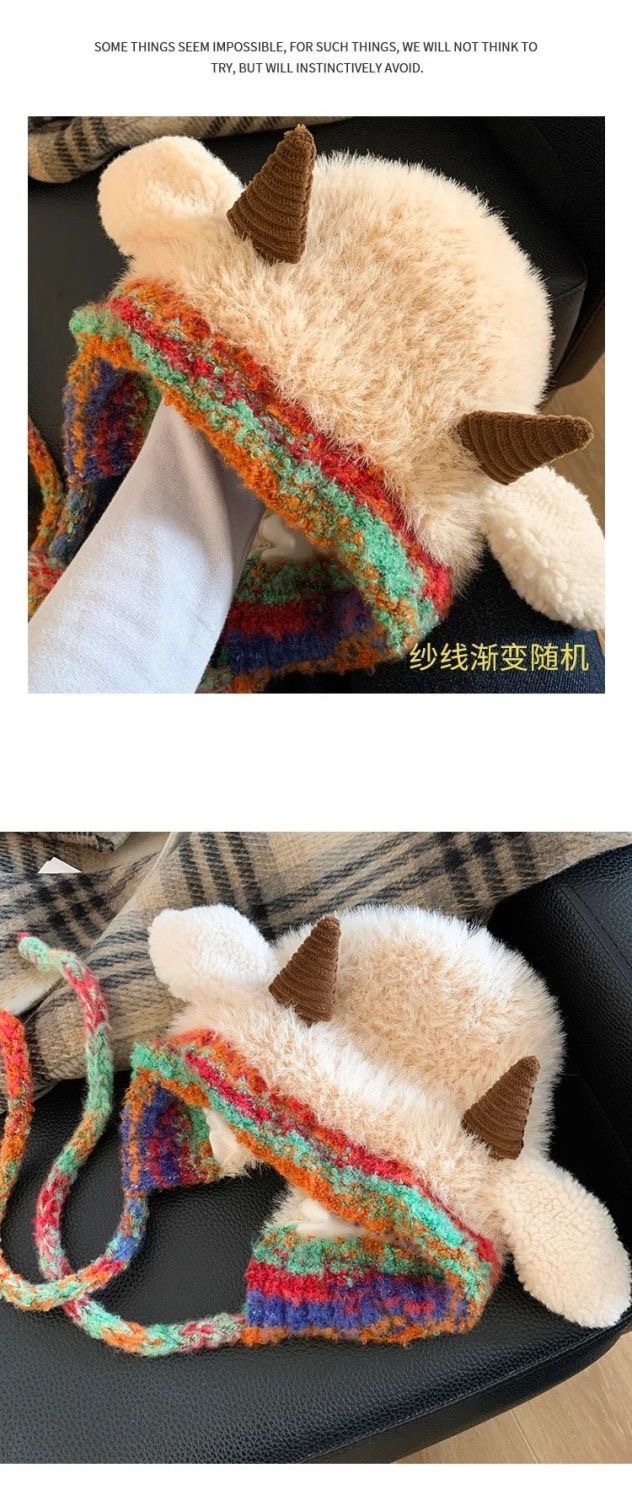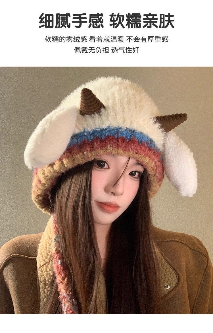 韩版可爱小羊毛绒帽子女秋冬季保暖绑带针织护耳帽网红户外套头帽