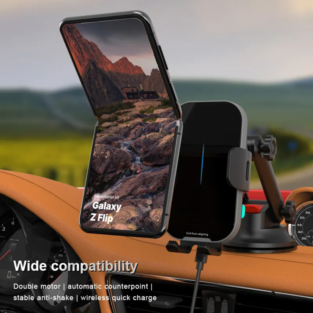 FOD线圈感应夹紧,自动对准无线快速充电,双静音步进电机,带电容器,支持QC/PD快速充电适配器。(大线圈行程,支持三星翻盖手机无线充电)