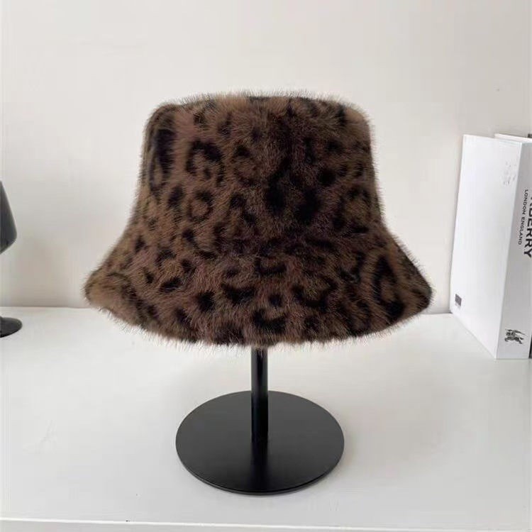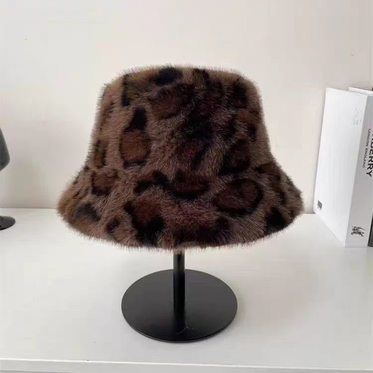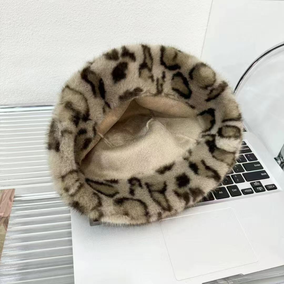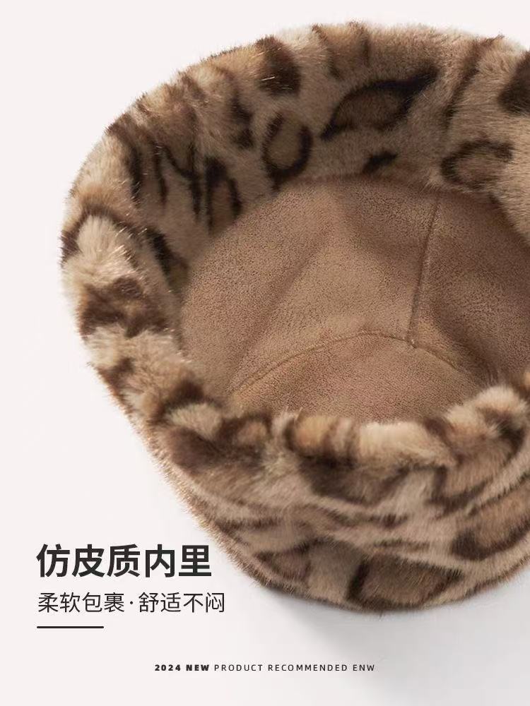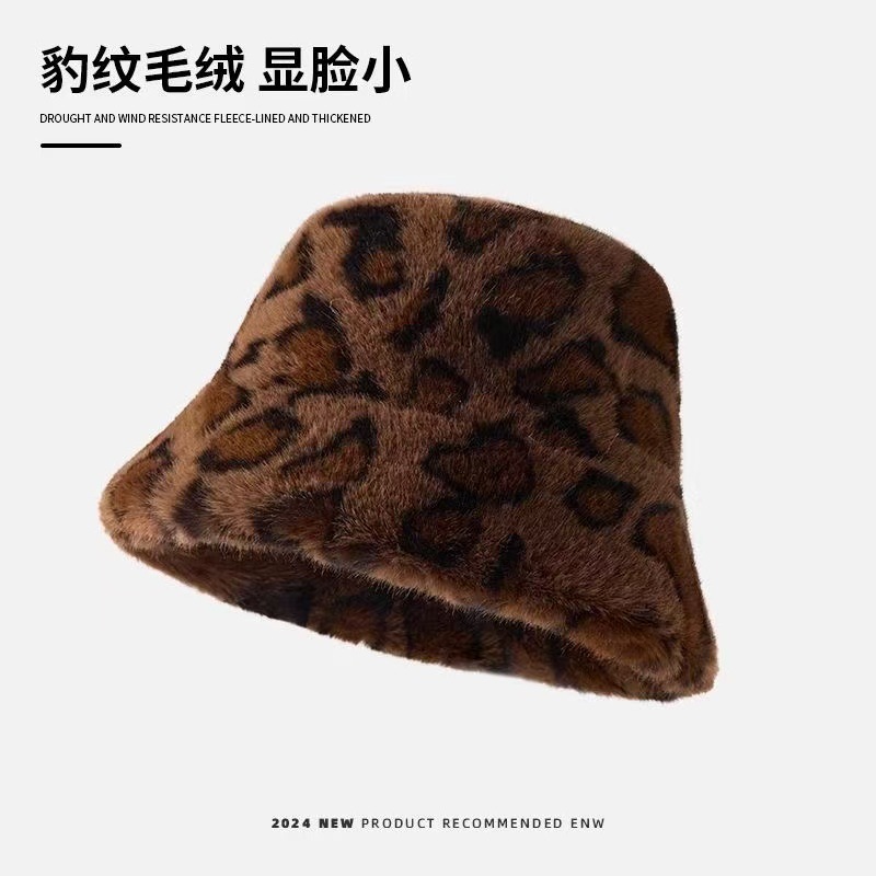秋冬新款潮流豹纹渔夫帽女百搭仿貂绒保暖防寒防风显脸小毛绒盆帽