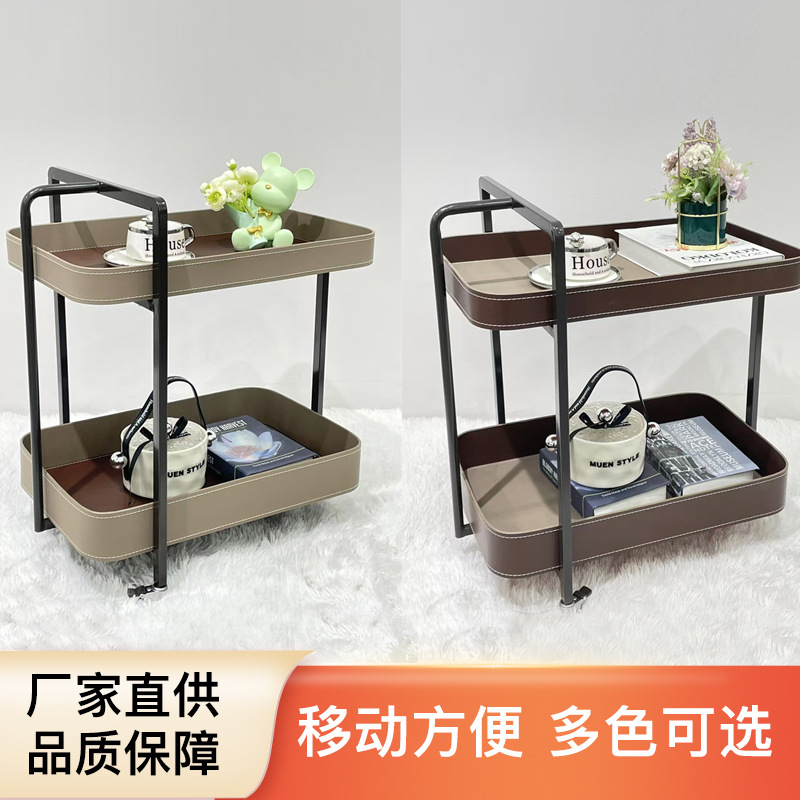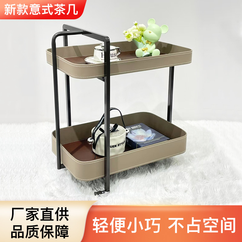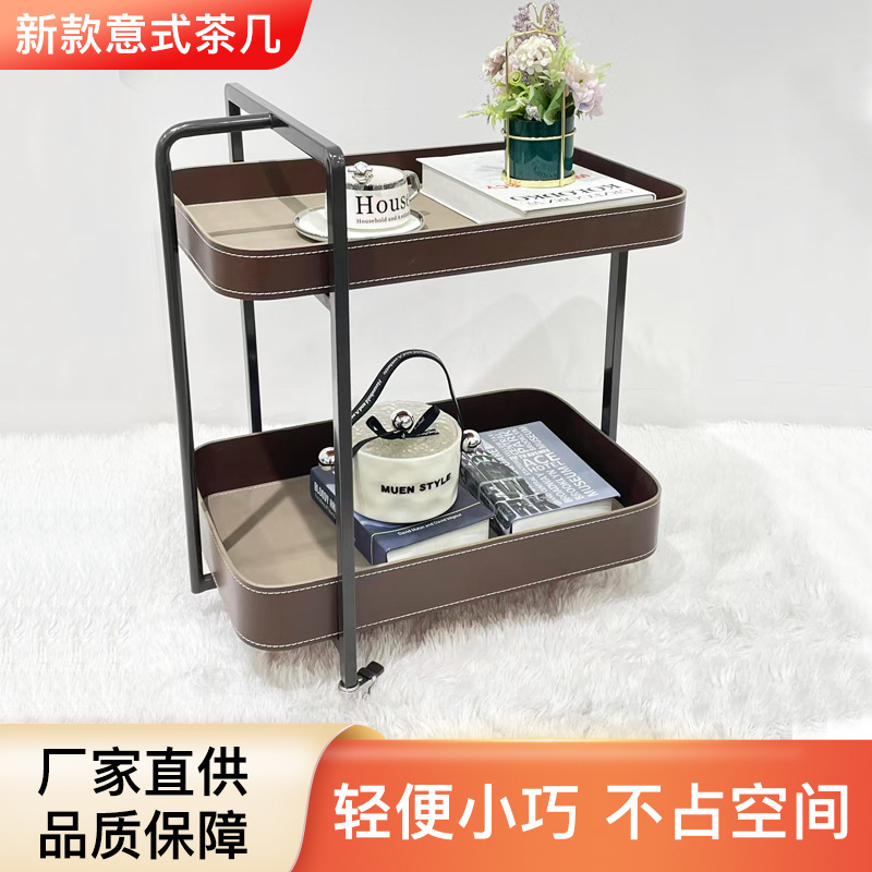 新款意式极简双层小茶几简约轻奢高级马鞍皮可移动边几小推车
