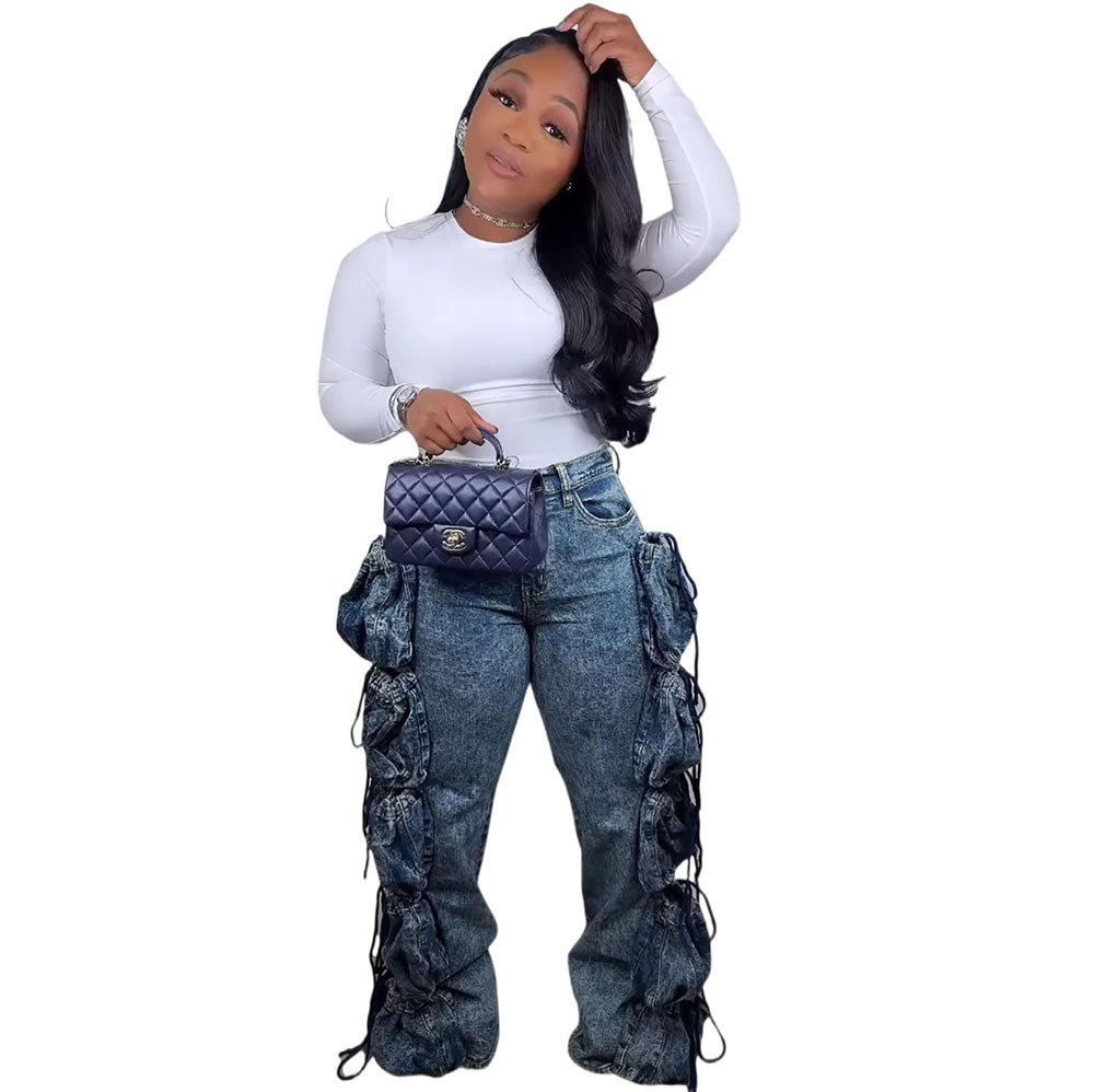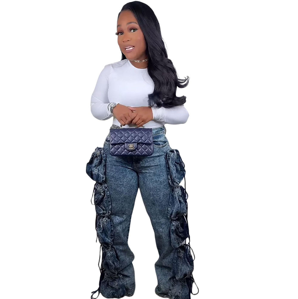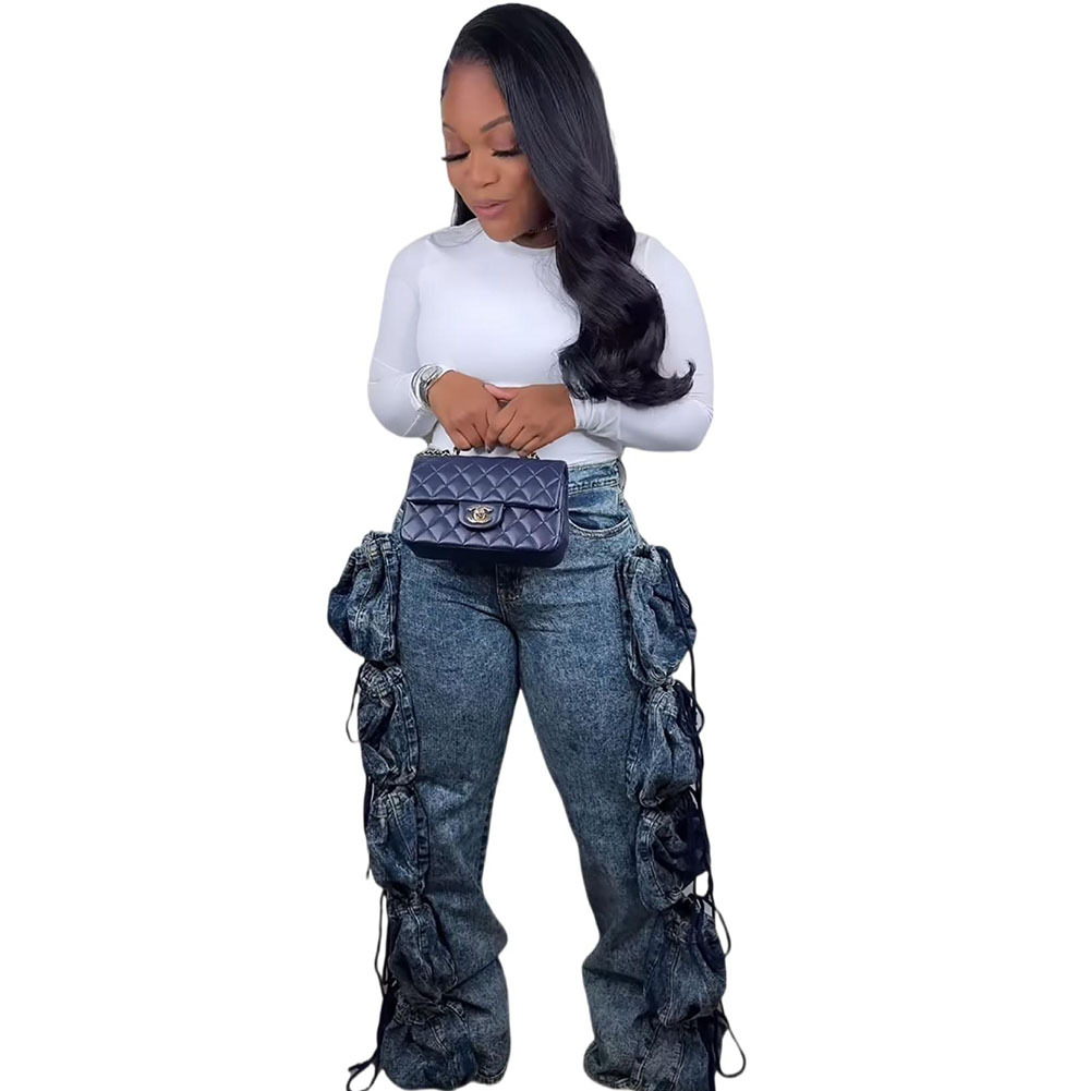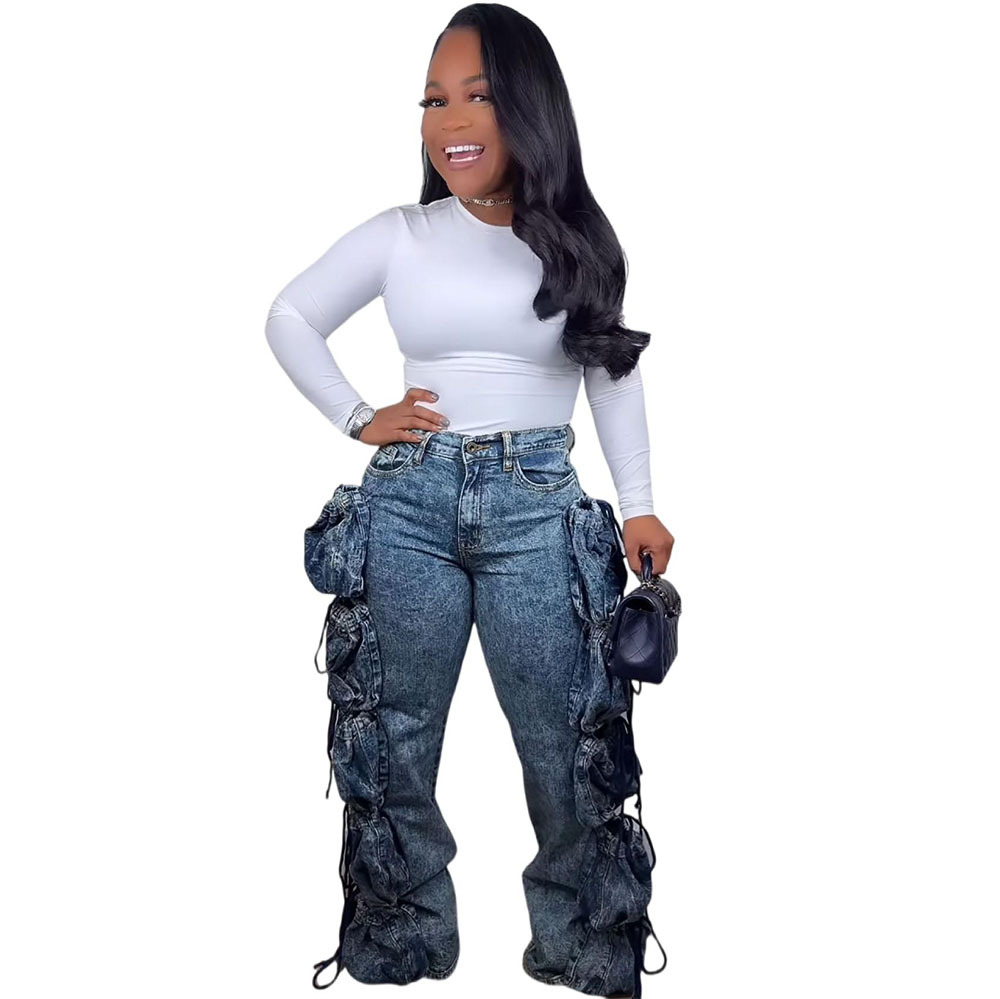 欧美女式牛仔裤 多口袋 布袋 抽绳 工装裤 高腰 直筒裤