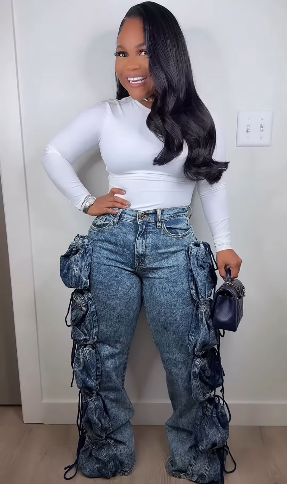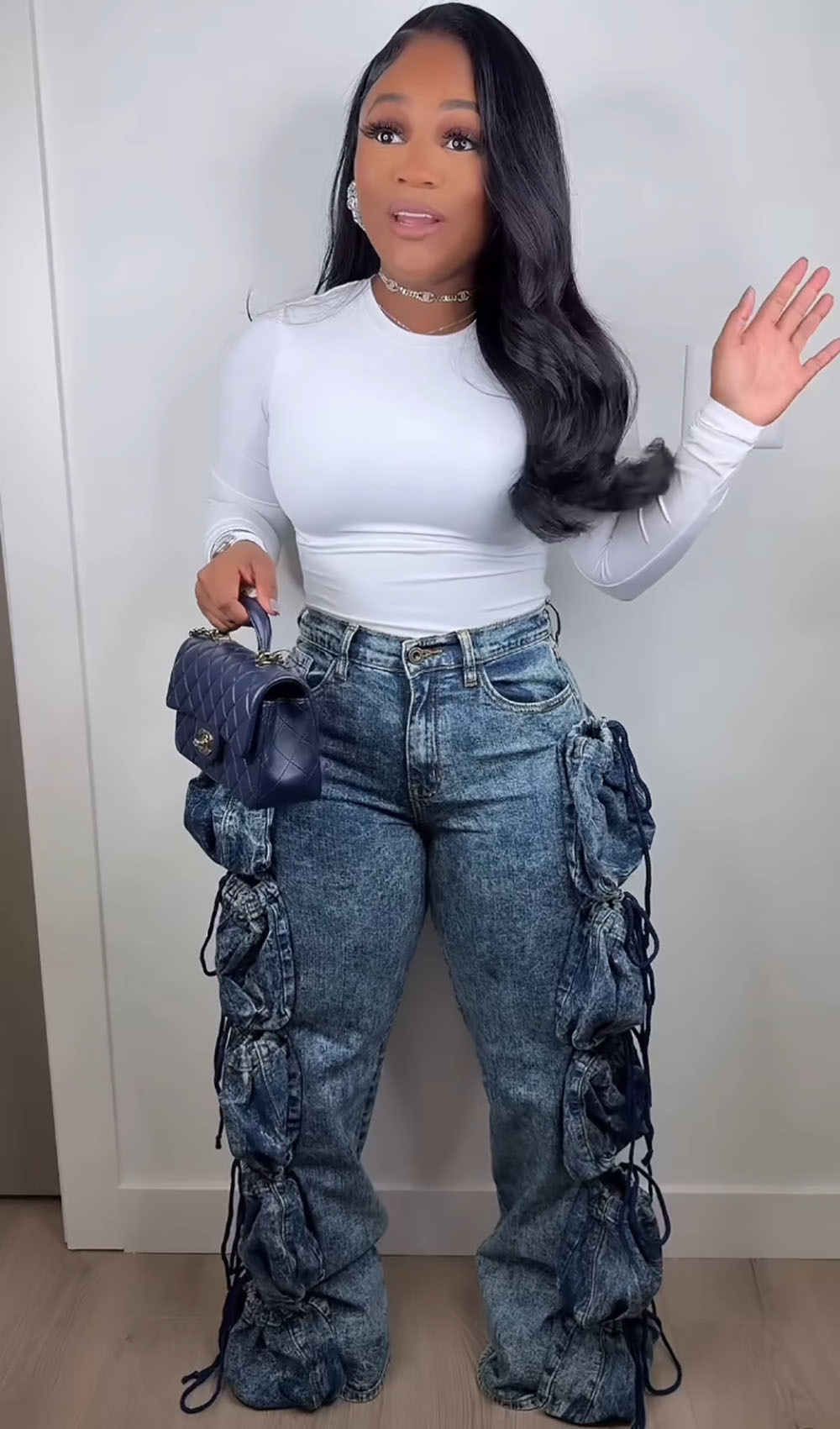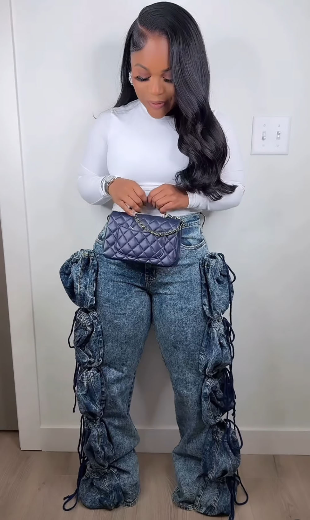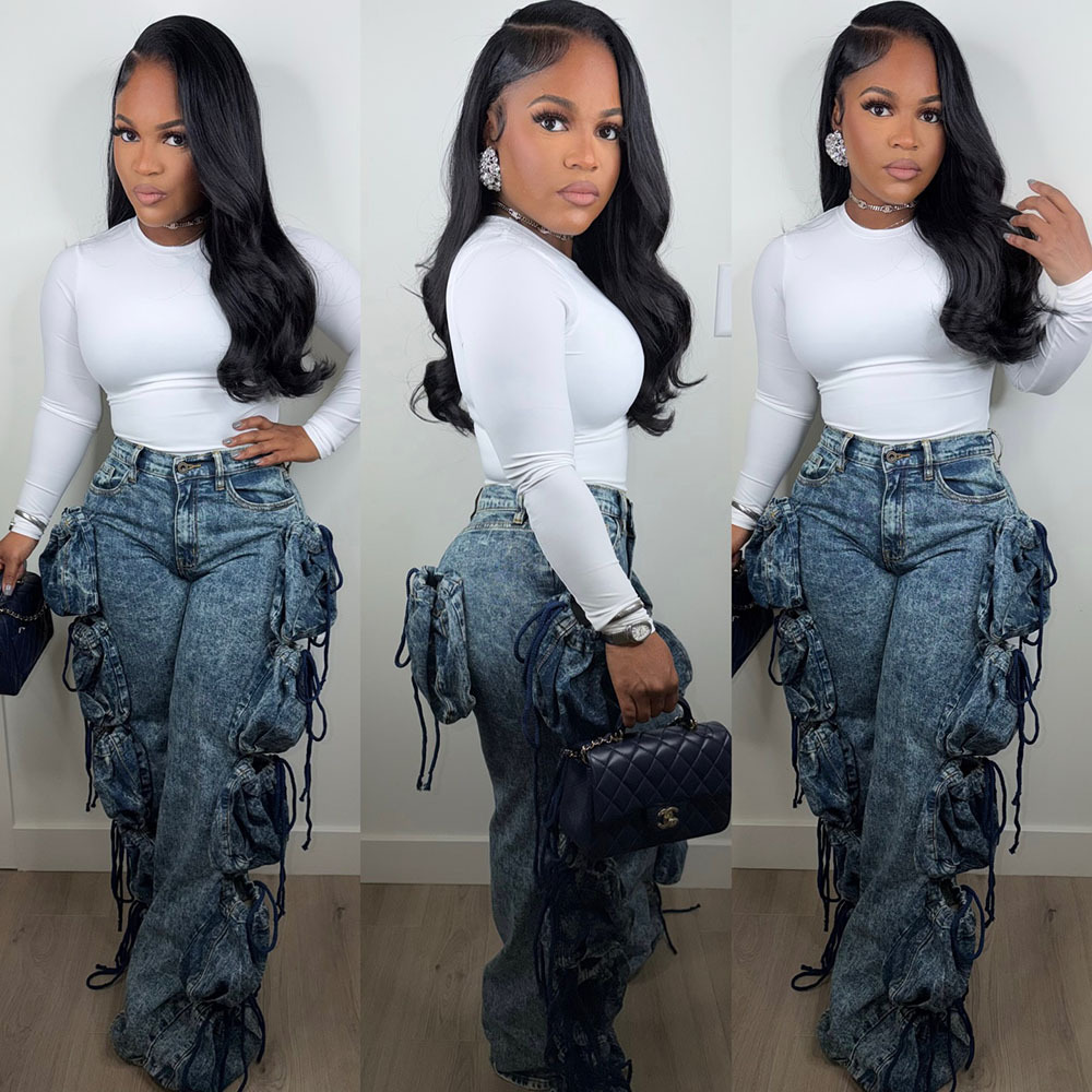欧美女式牛仔裤 多口袋 布袋 抽绳 工装裤 高腰 直筒裤