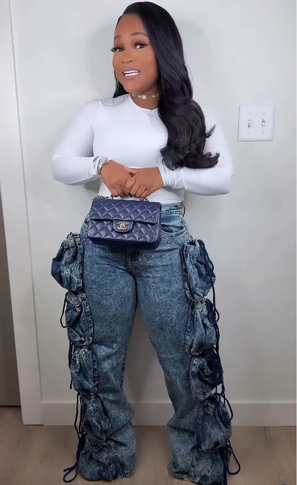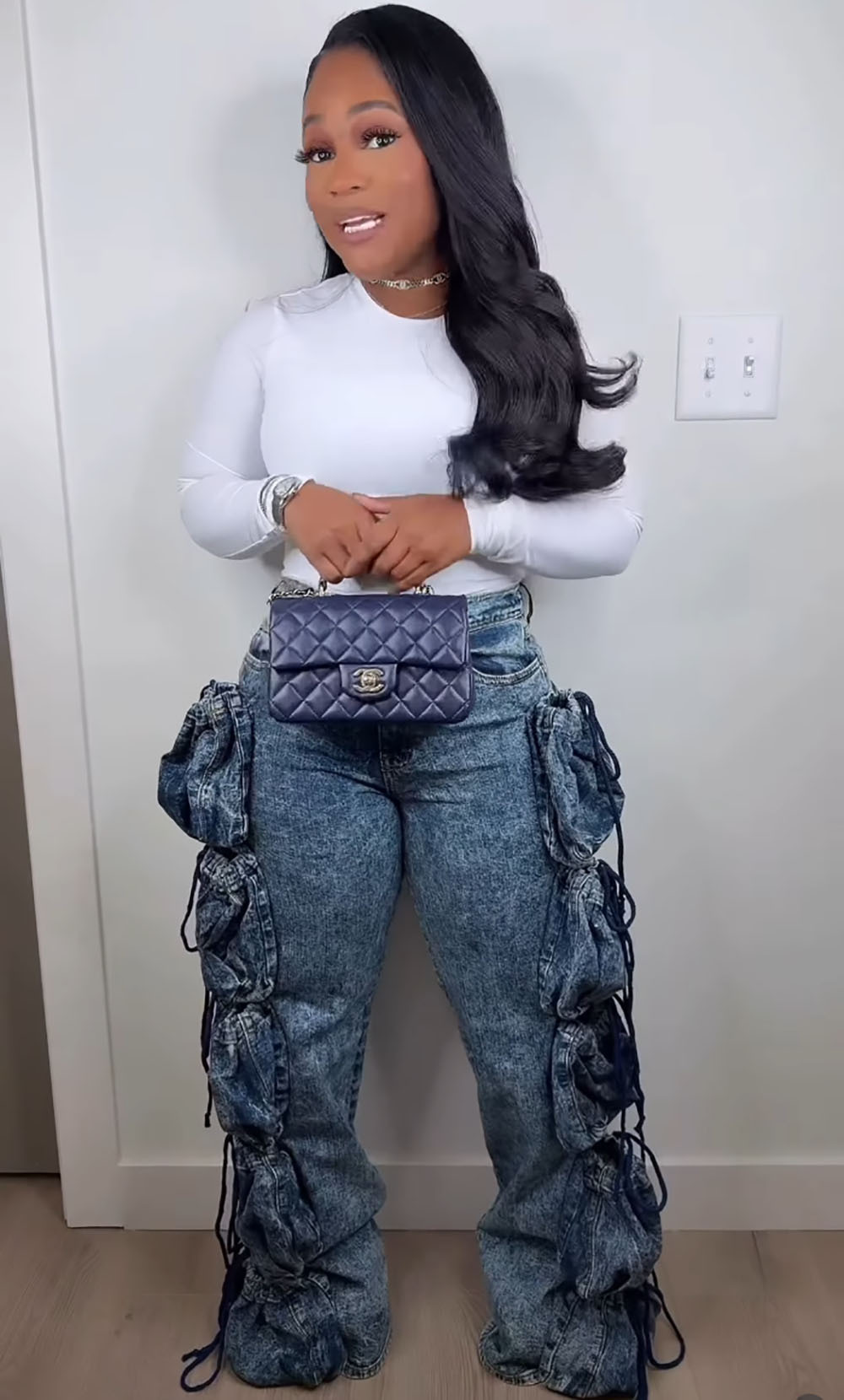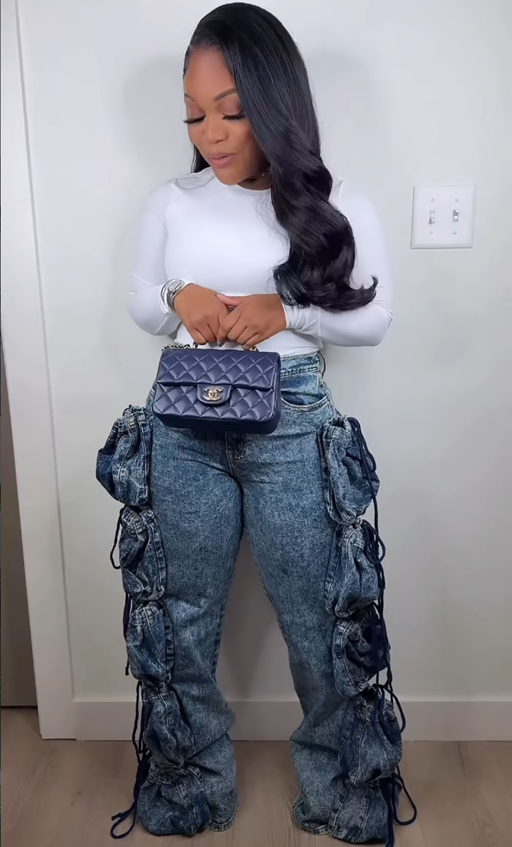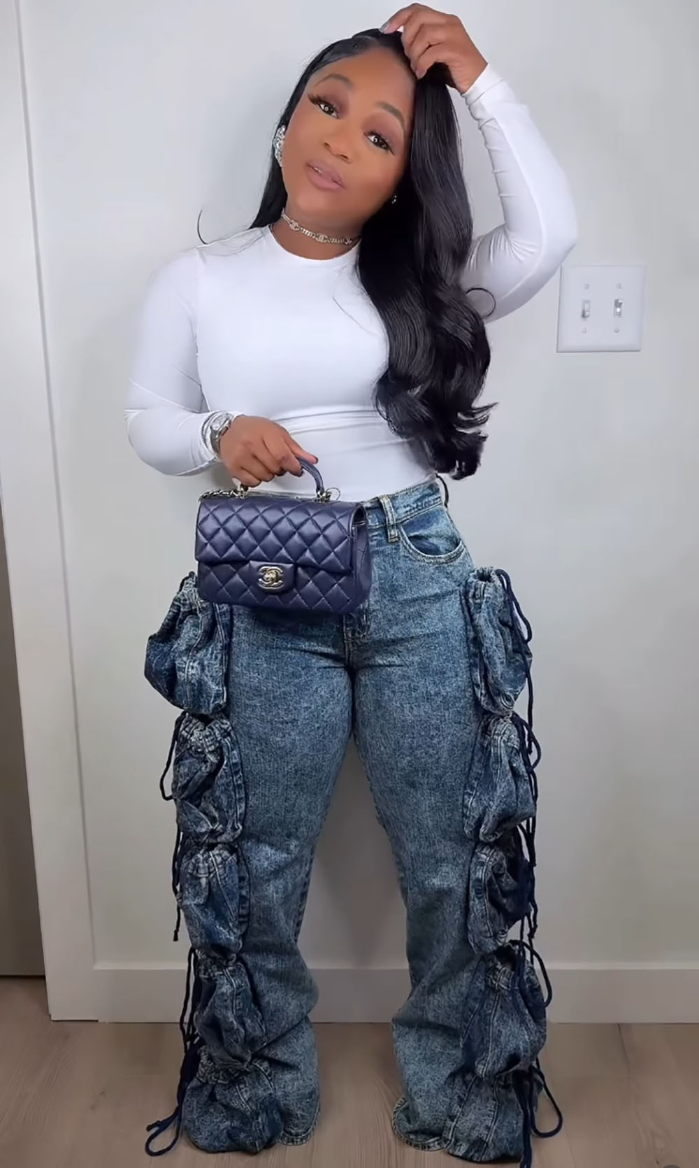 欧美女式牛仔裤 多口袋 布袋 抽绳 工装裤 高腰 直筒裤