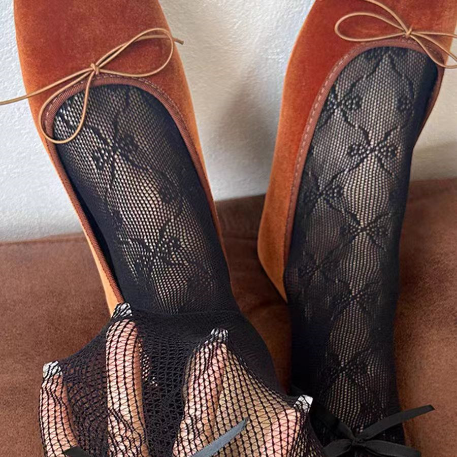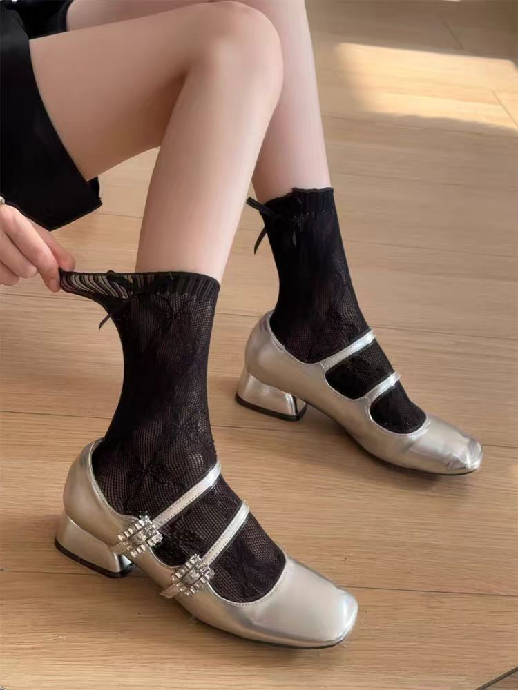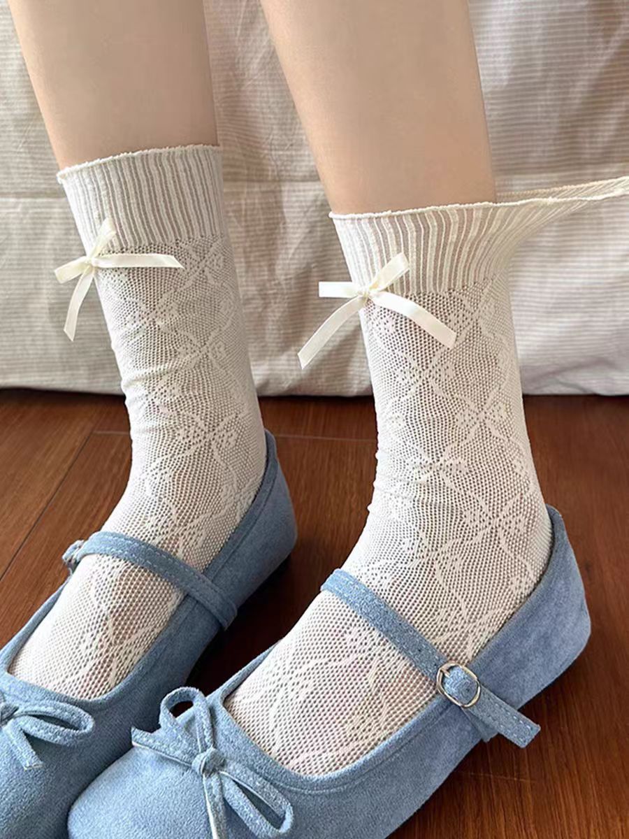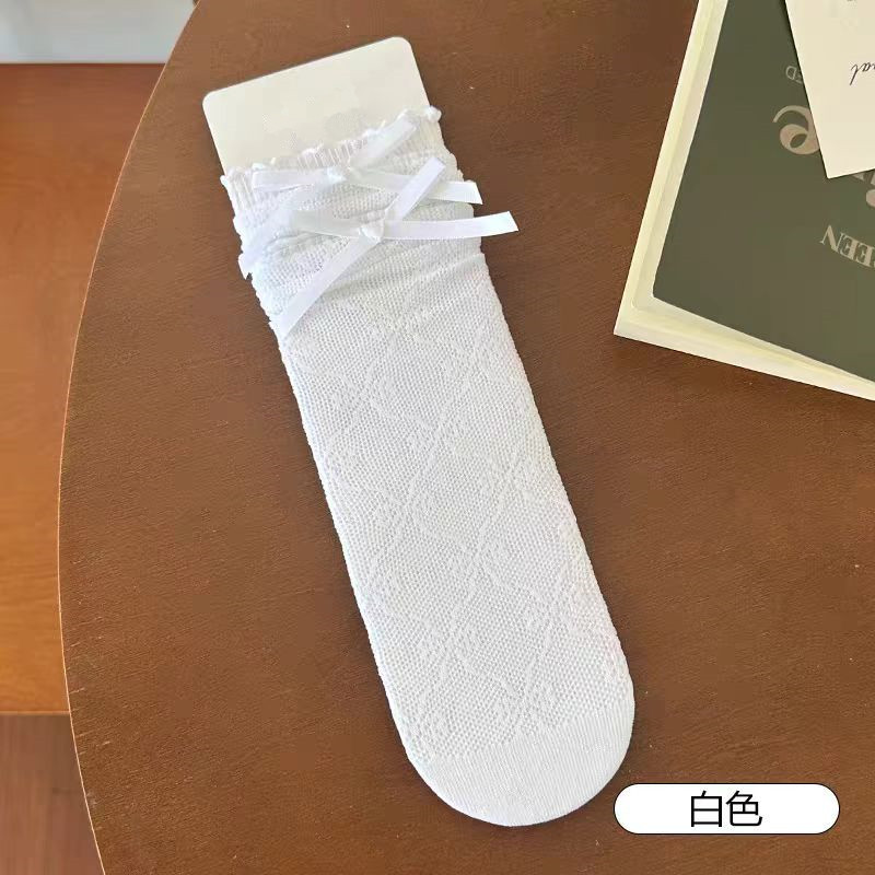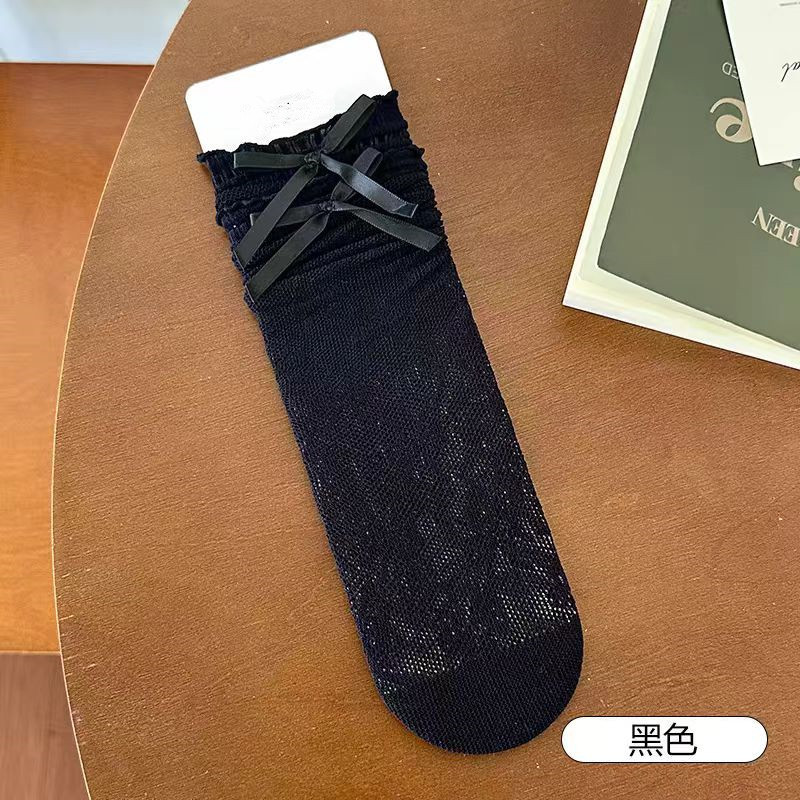 夏薄款奶白透气木耳边花边袜镂空蝴蝶结中筒袜甜美芭蕾风网眼黑色
