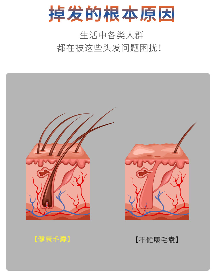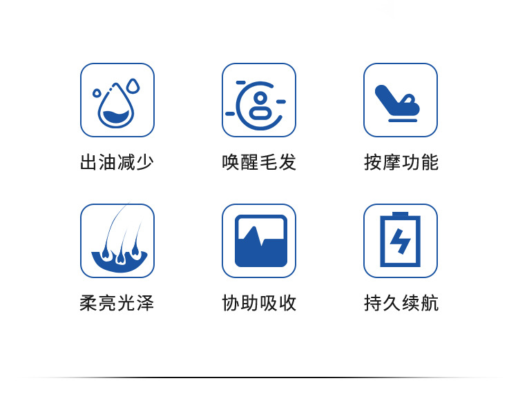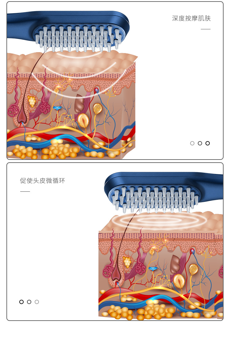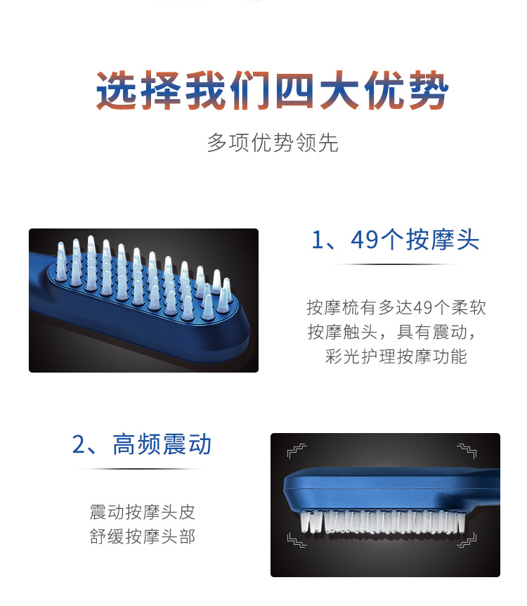 1,头部护理,助力毛发吸收,震动按摩功能(49颗按摩头)高频震动按摩头皮,多档位可调节。