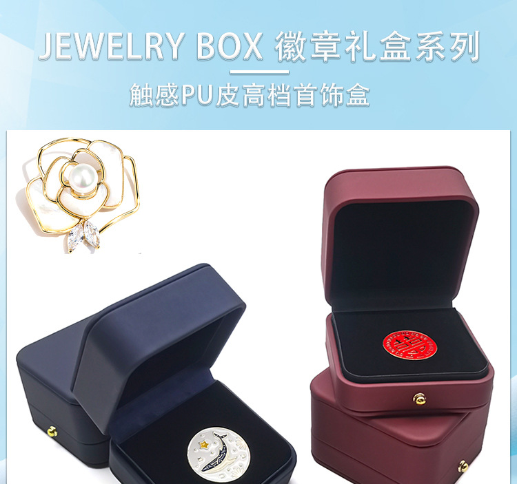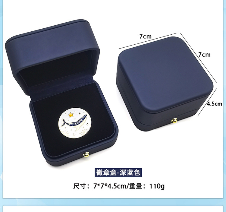 高档触感蓝色pu皮徽章盒勋章展示盒可印logo奖牌收藏盒胸针礼盒