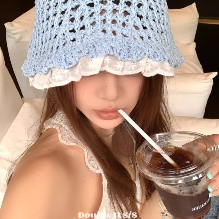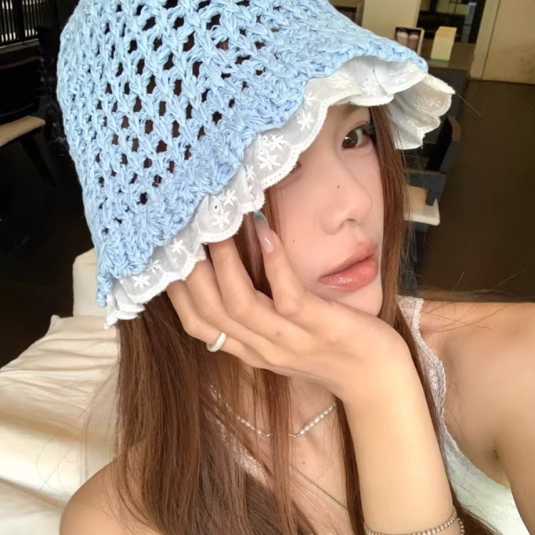 草编大沿甜美蕾丝花边草帽女出游镂空防晒遮阳沙滩折叠透气太阳帽