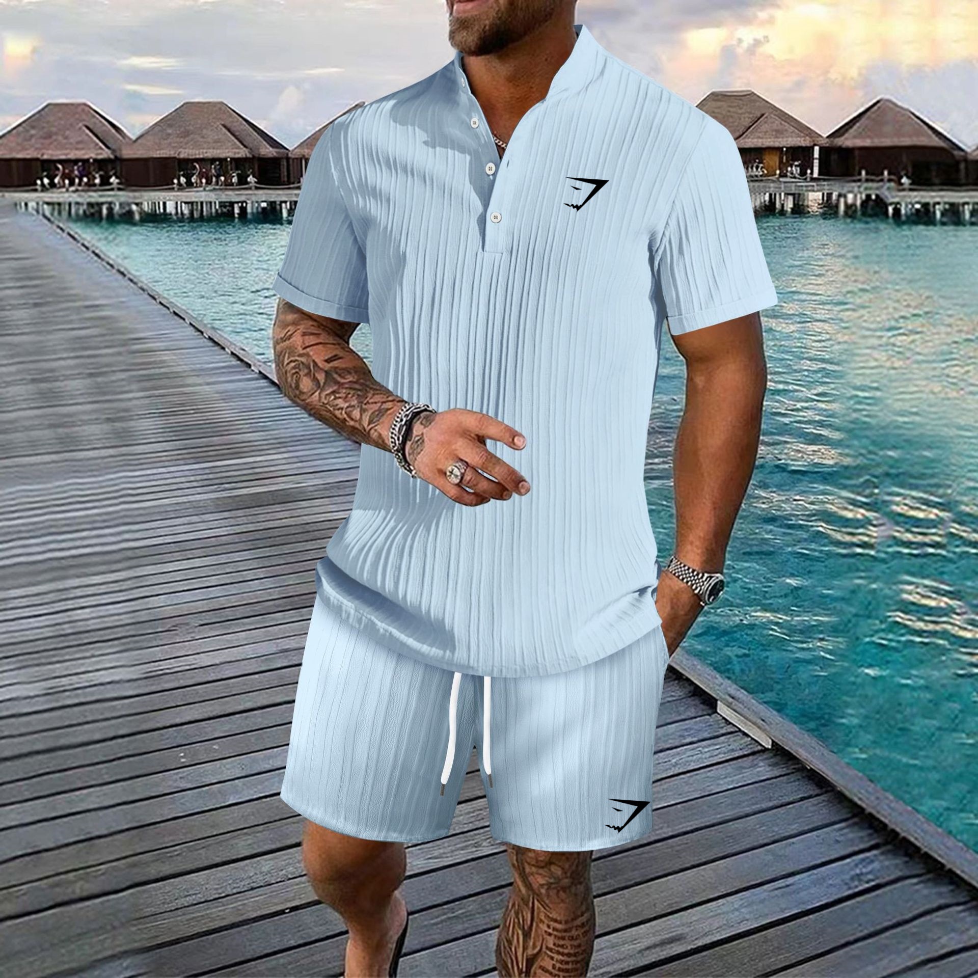 GYMSHARK男士复古棉麻条纹亨利衫休闲宽松短袖短裤沙滩套装,批发价,价格:80.88,厂家直销,GYMSHARK男士复古棉麻条纹亨利衫休闲宽松短袖短裤沙滩套装,免费拿样。