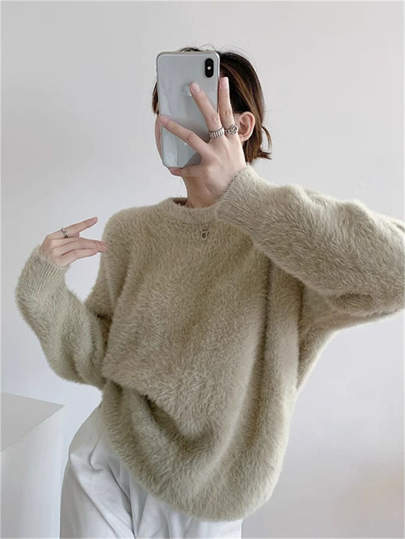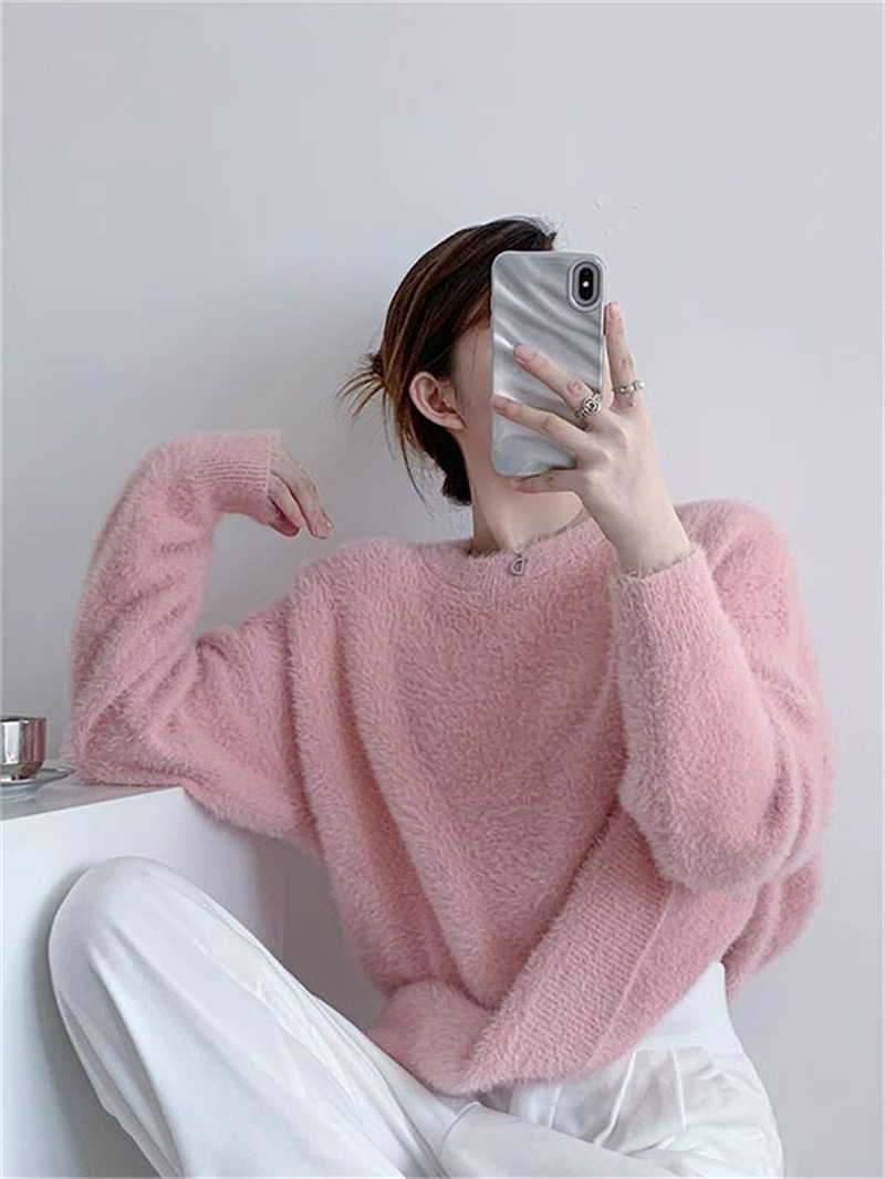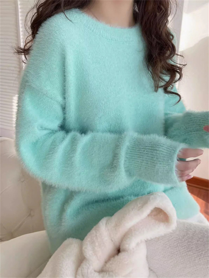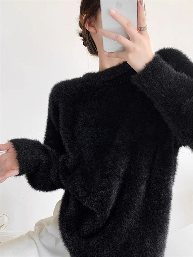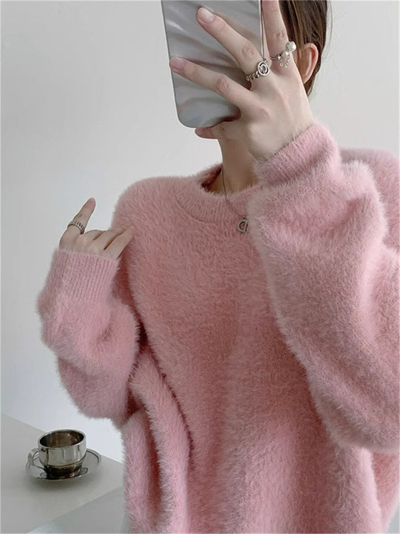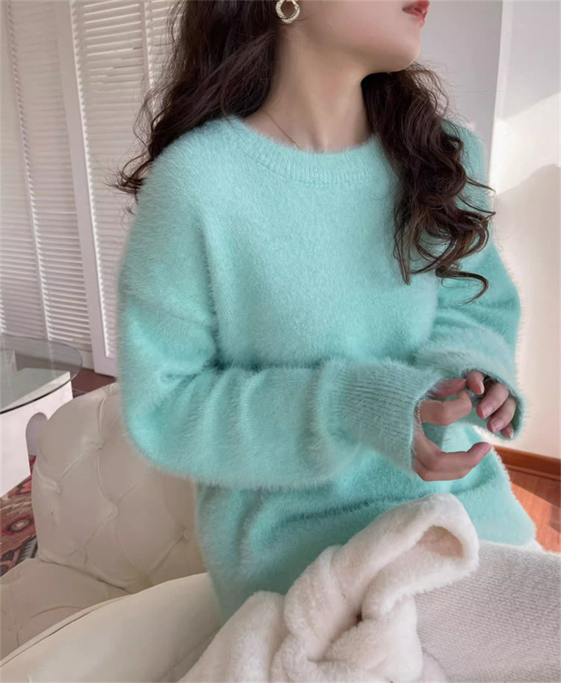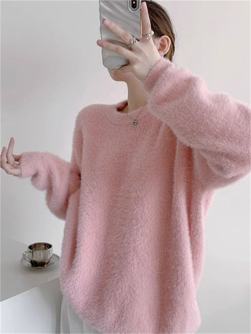 秋冬新款慵懒风圆领仿貂绒长袖套头毛衣女宽松加厚纯色软糯针织衫