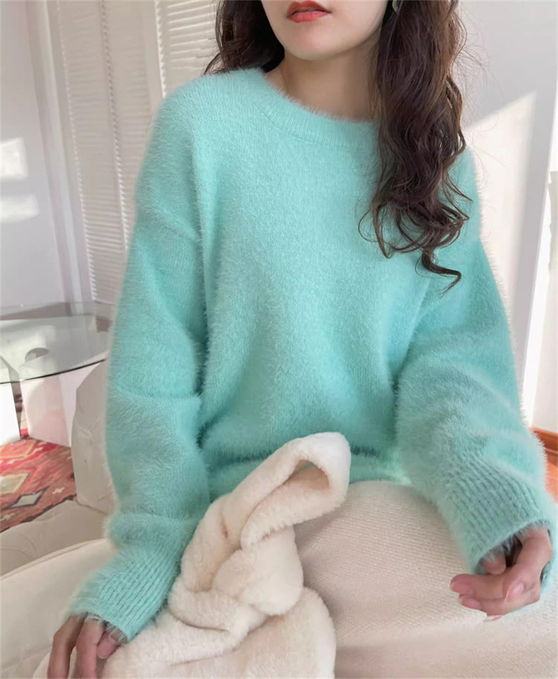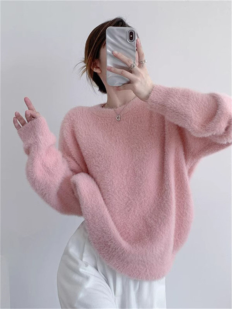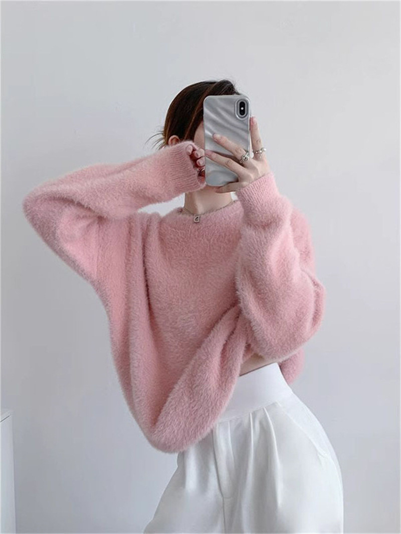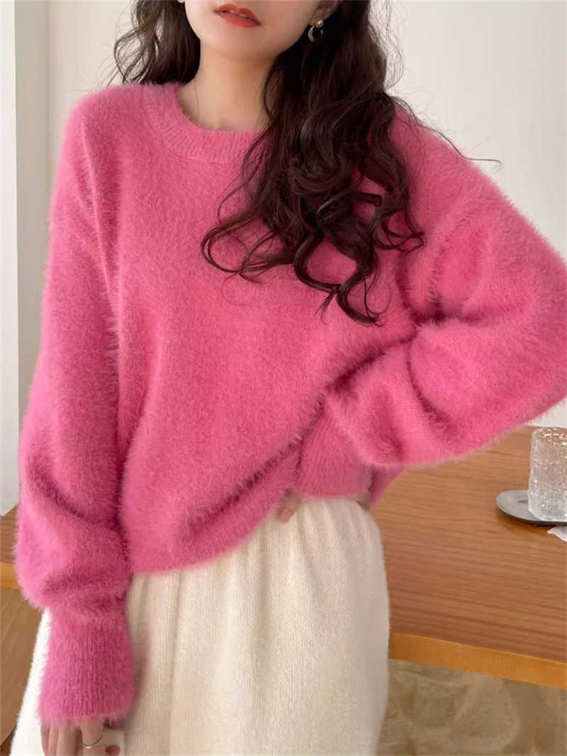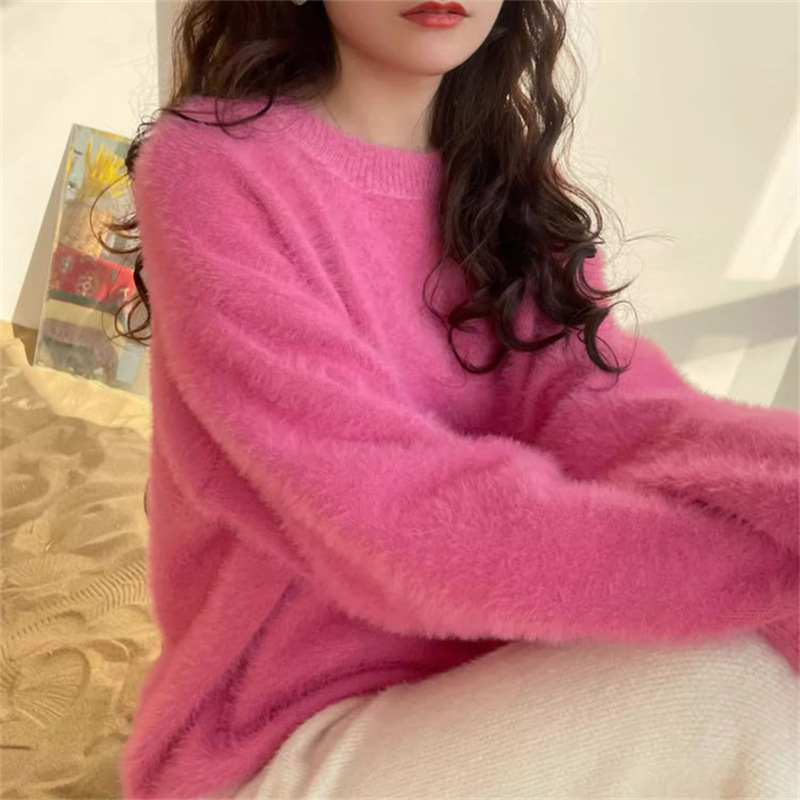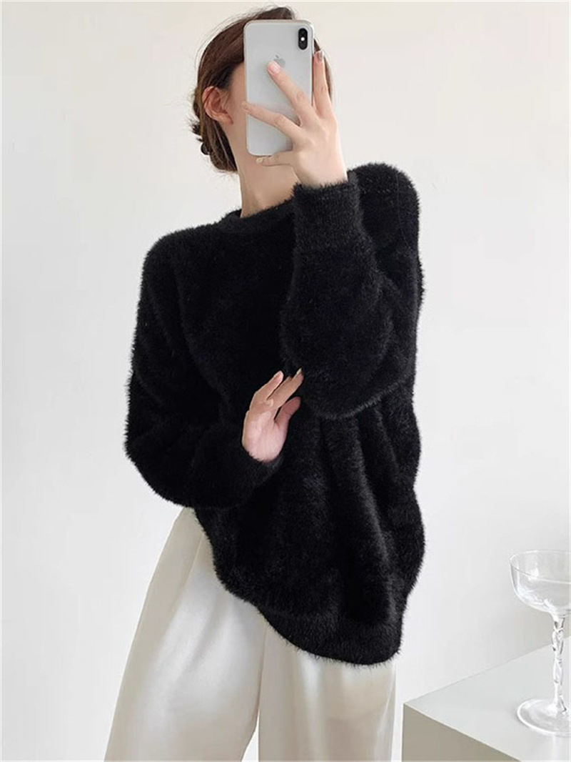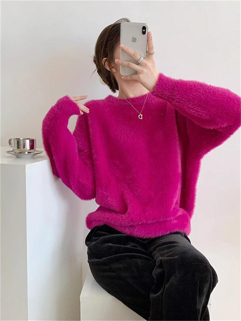 秋冬新款慵懒风圆领仿貂绒长袖套头毛衣女宽松加厚纯色软糯针织衫