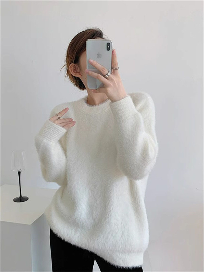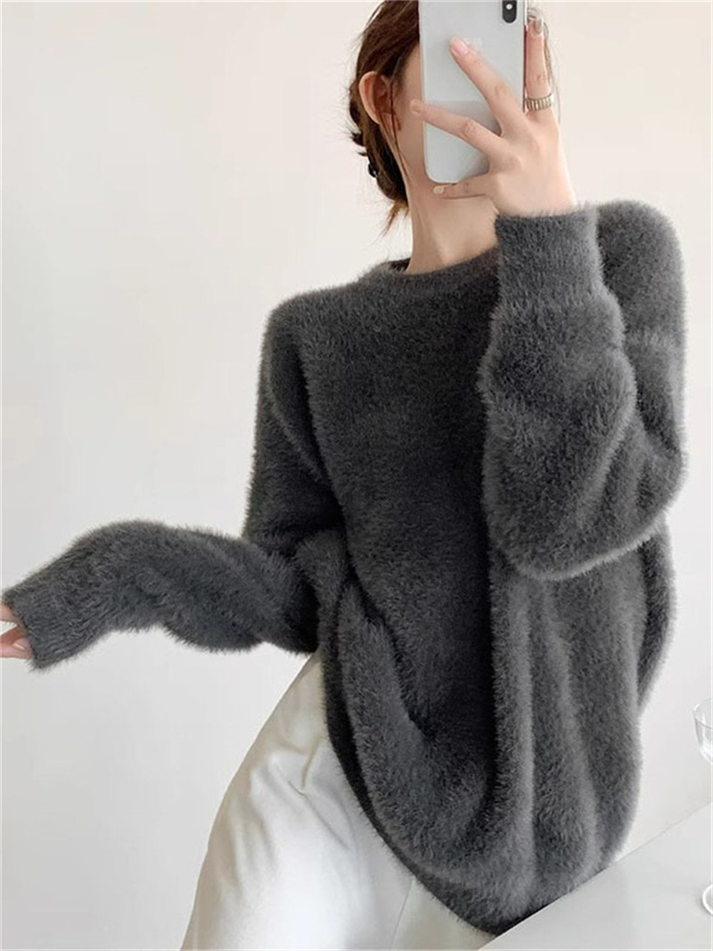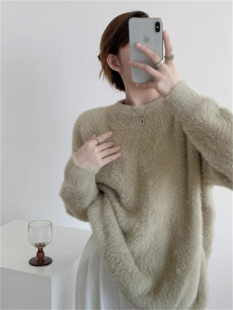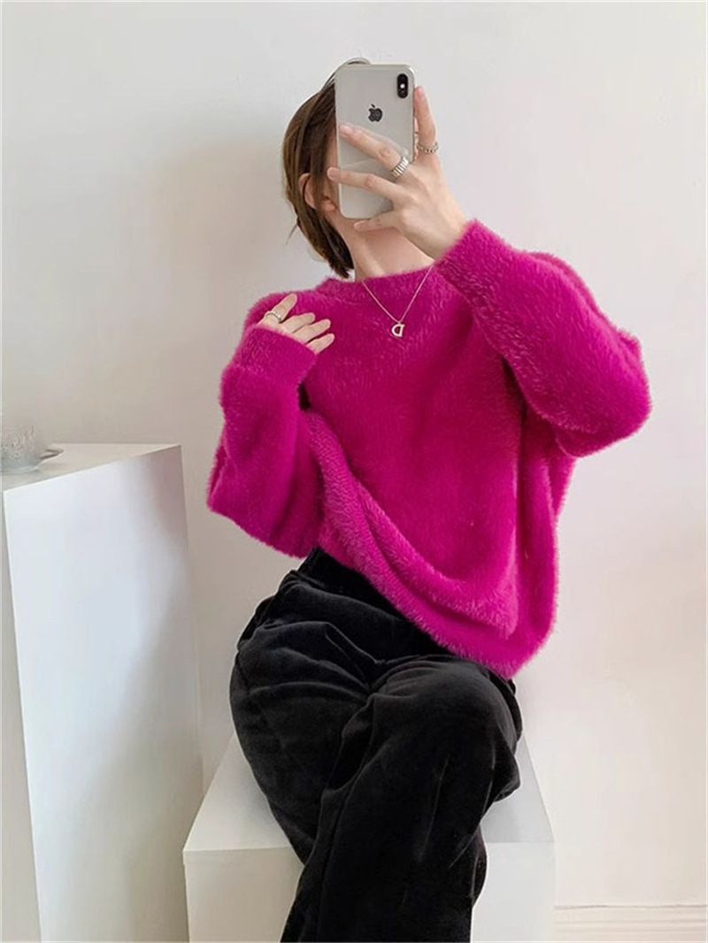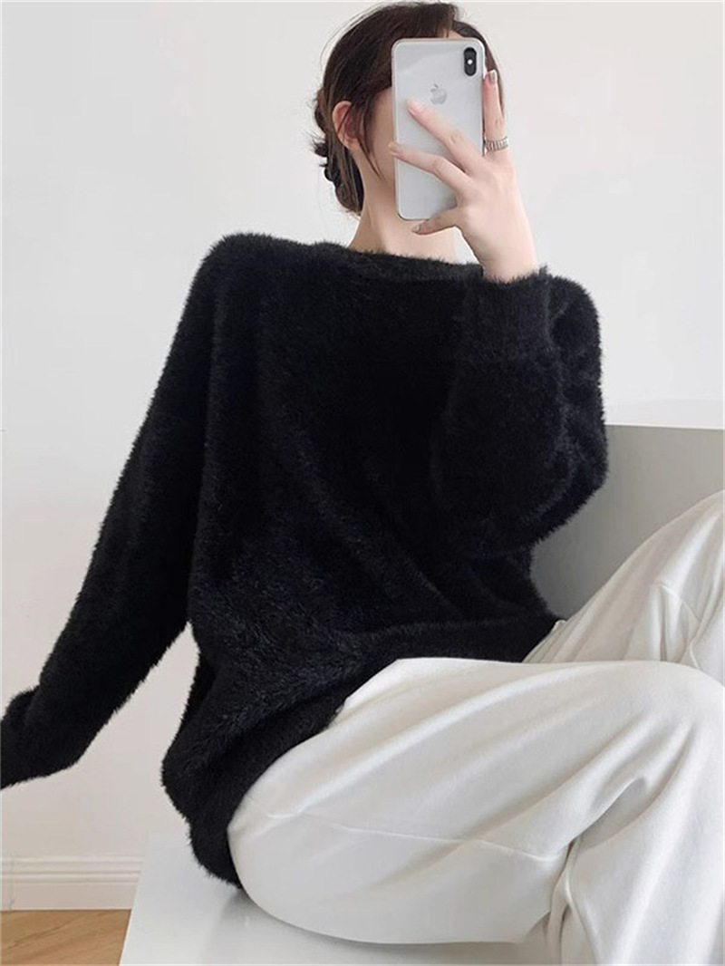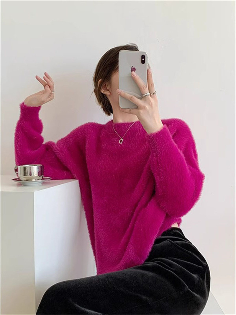 秋冬新款慵懒风圆领仿貂绒长袖套头毛衣女宽松加厚纯色软糯针织衫