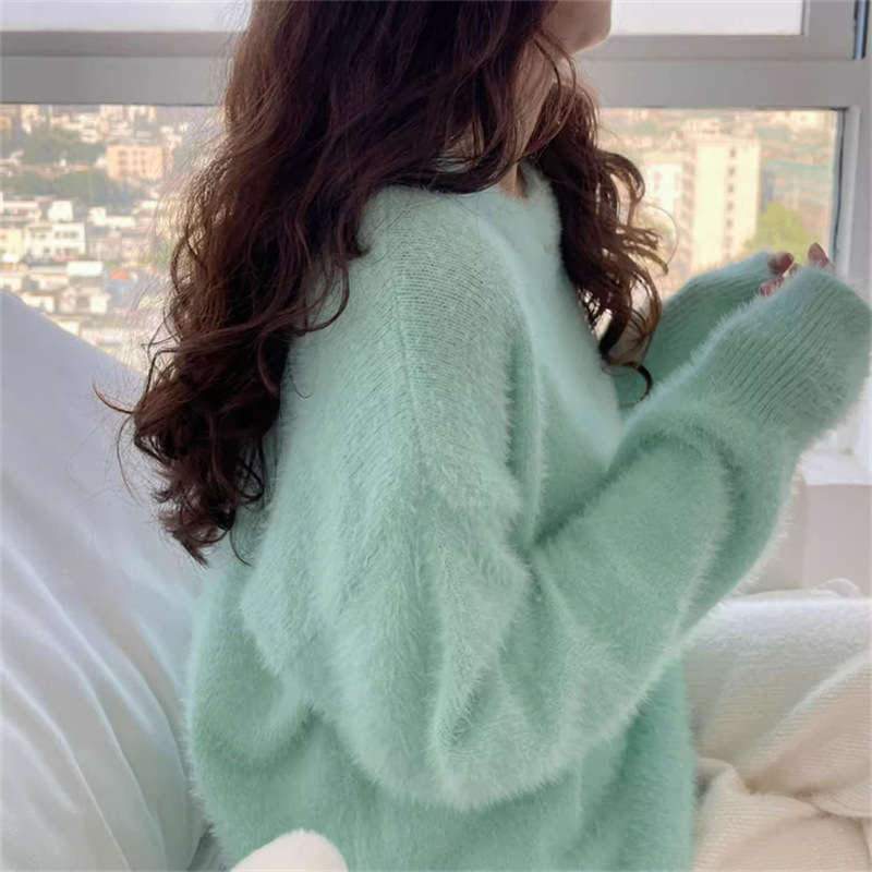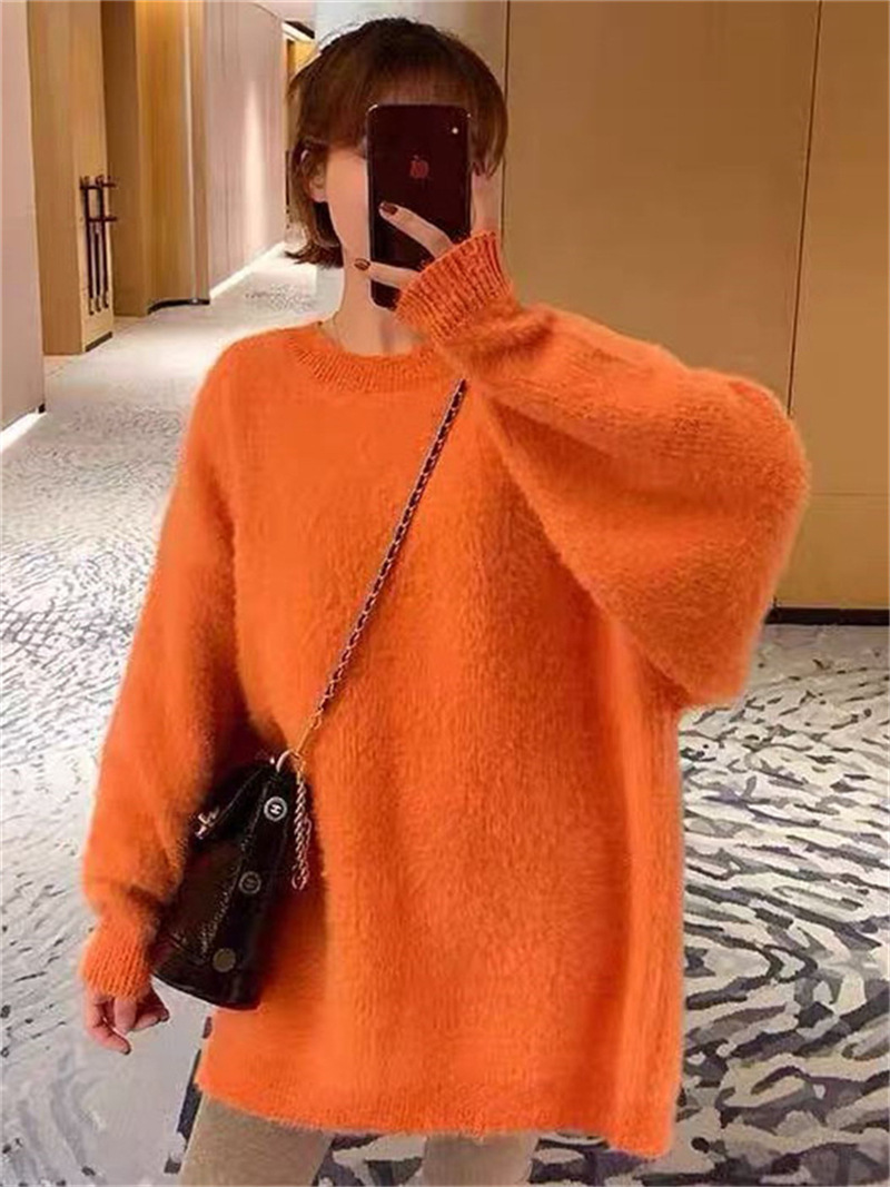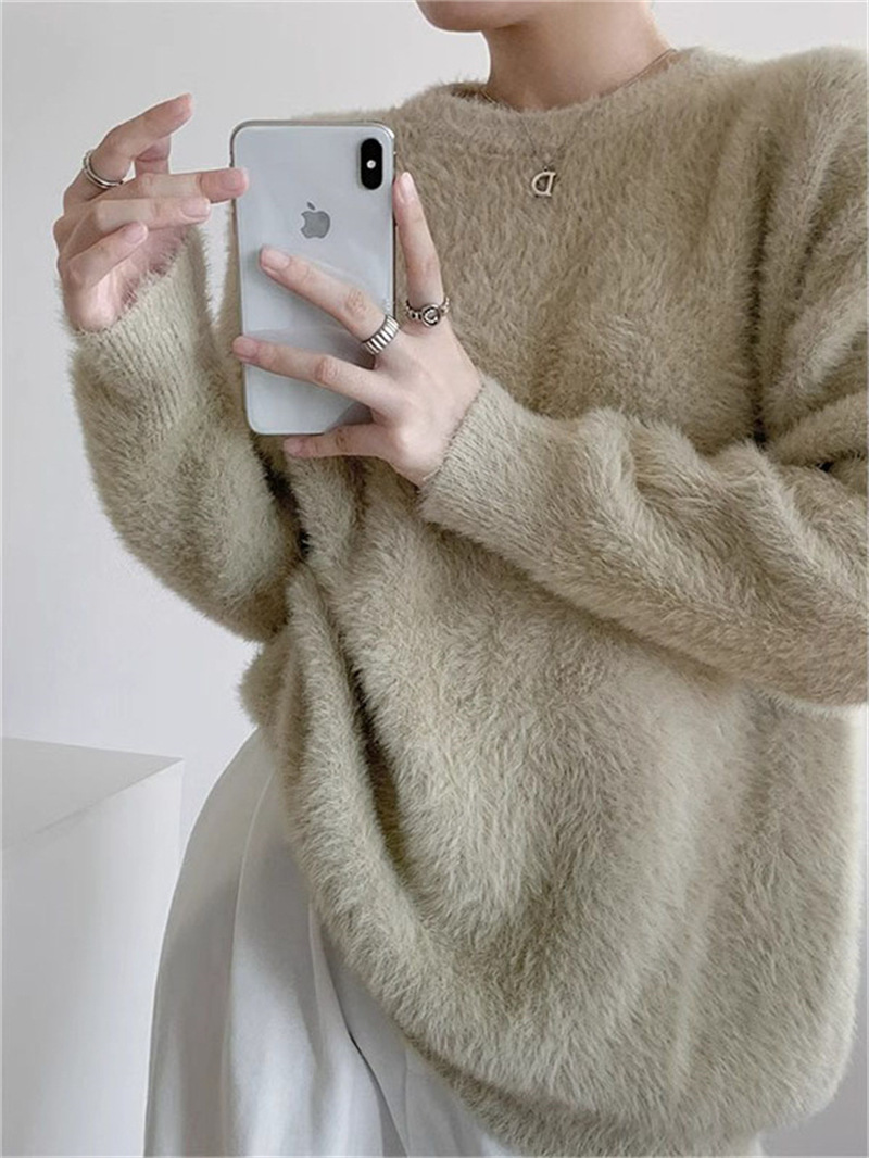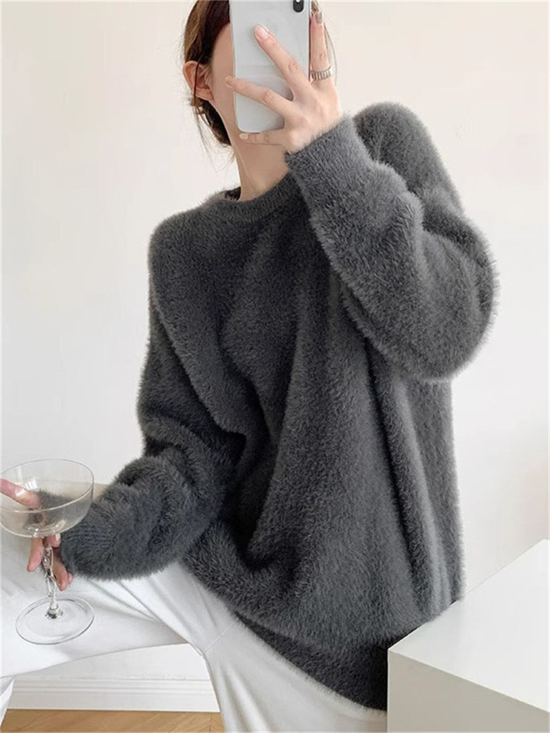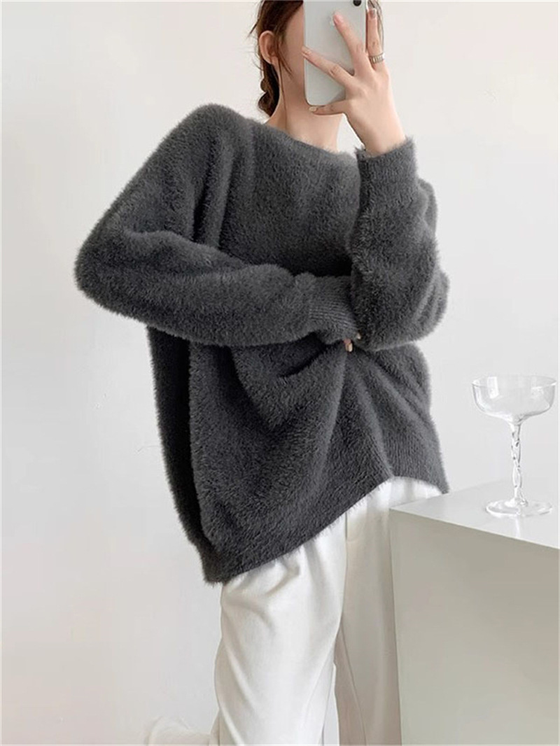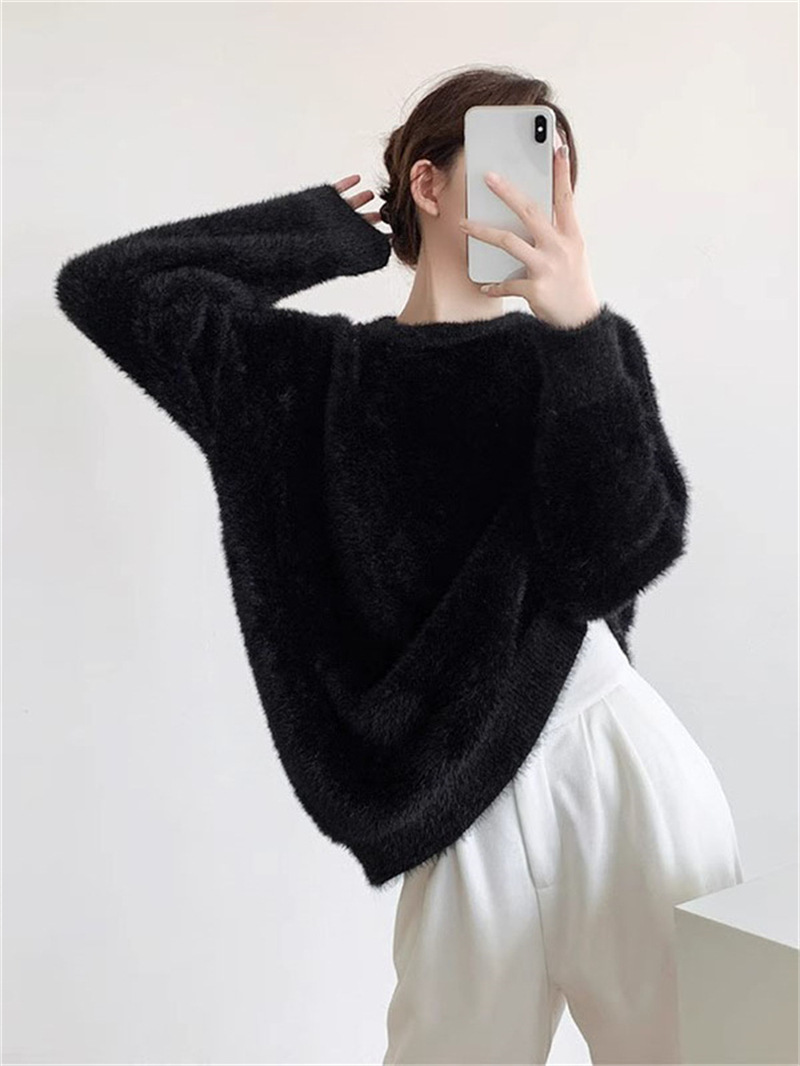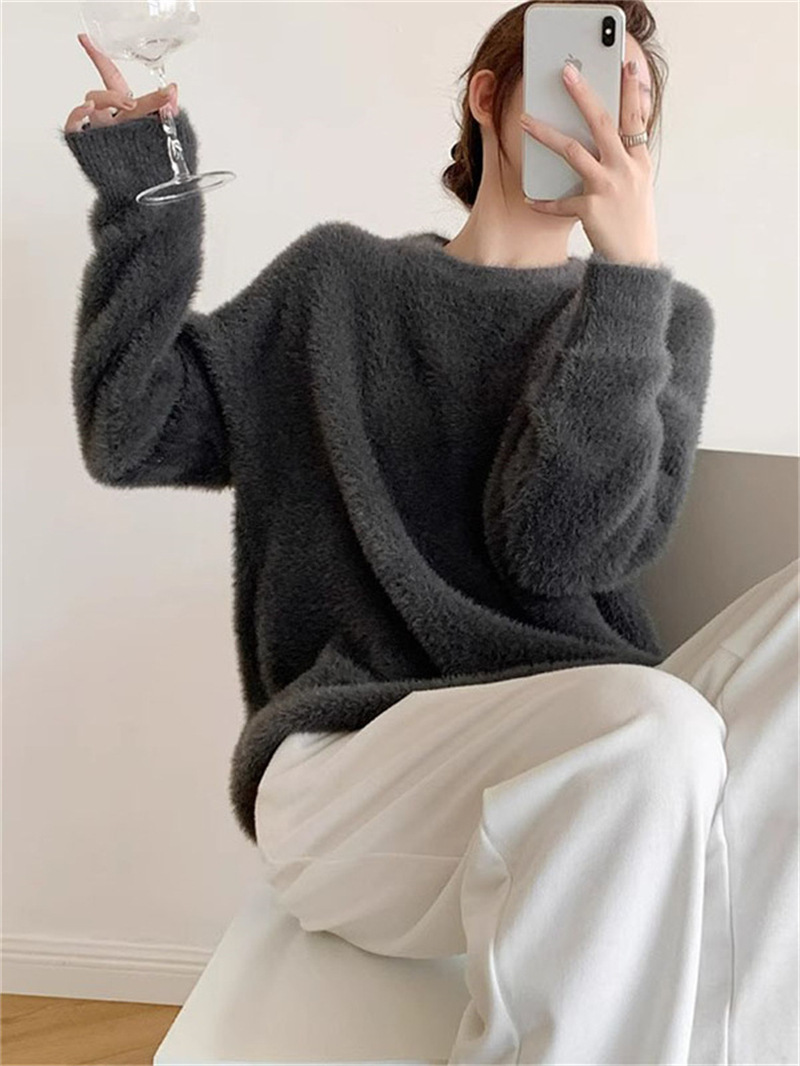 秋冬新款慵懒风圆领仿貂绒长袖套头毛衣女宽松加厚纯色软糯针织衫