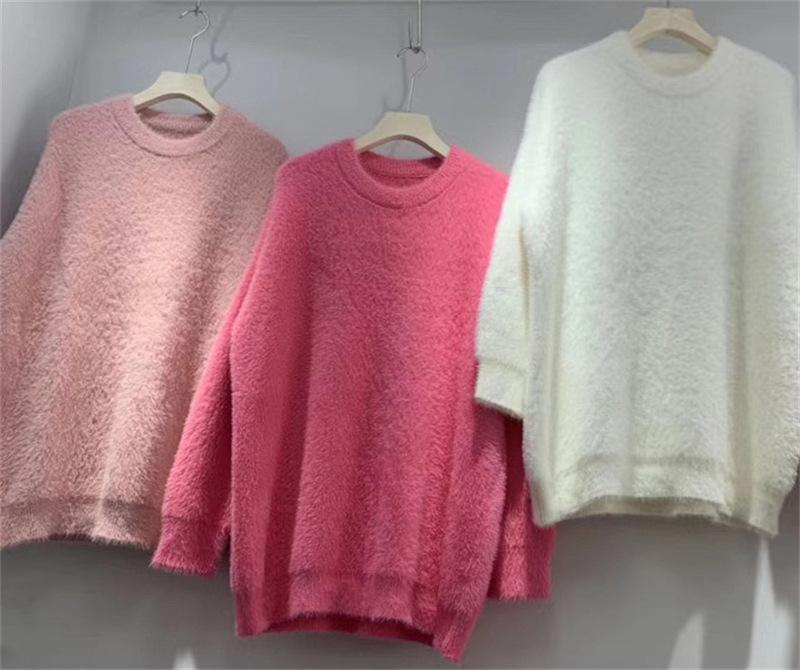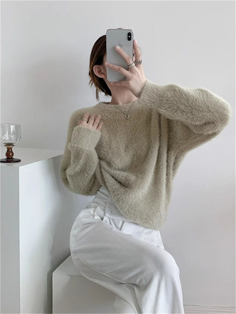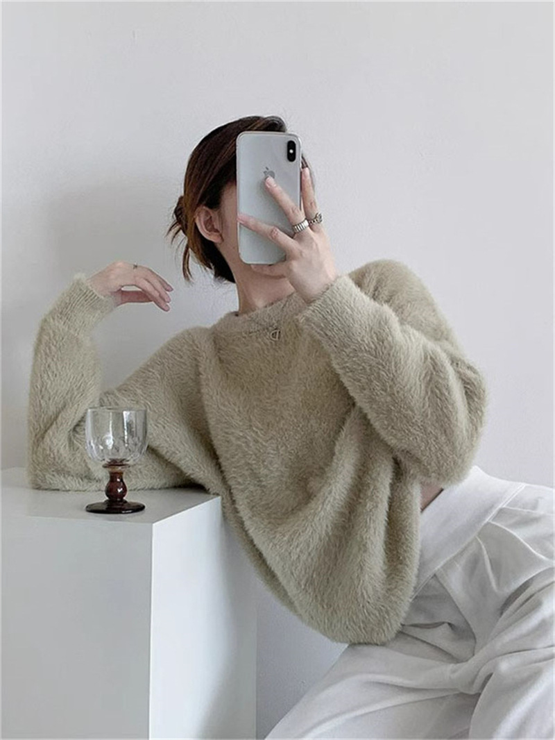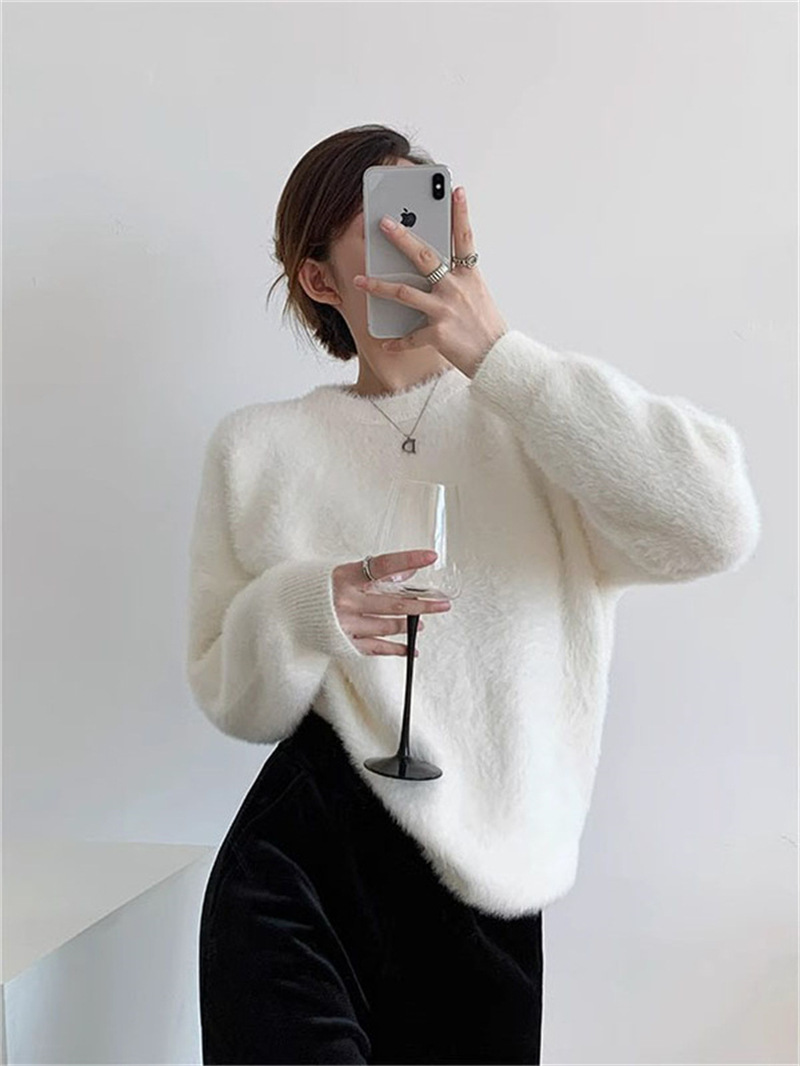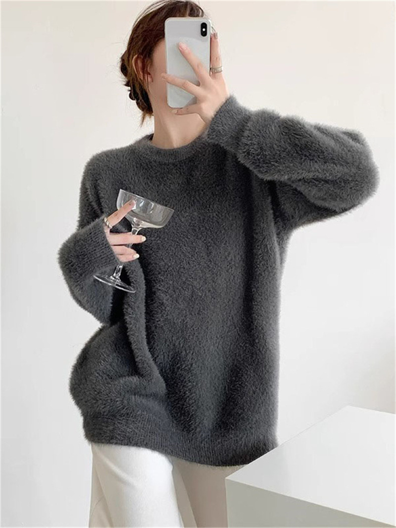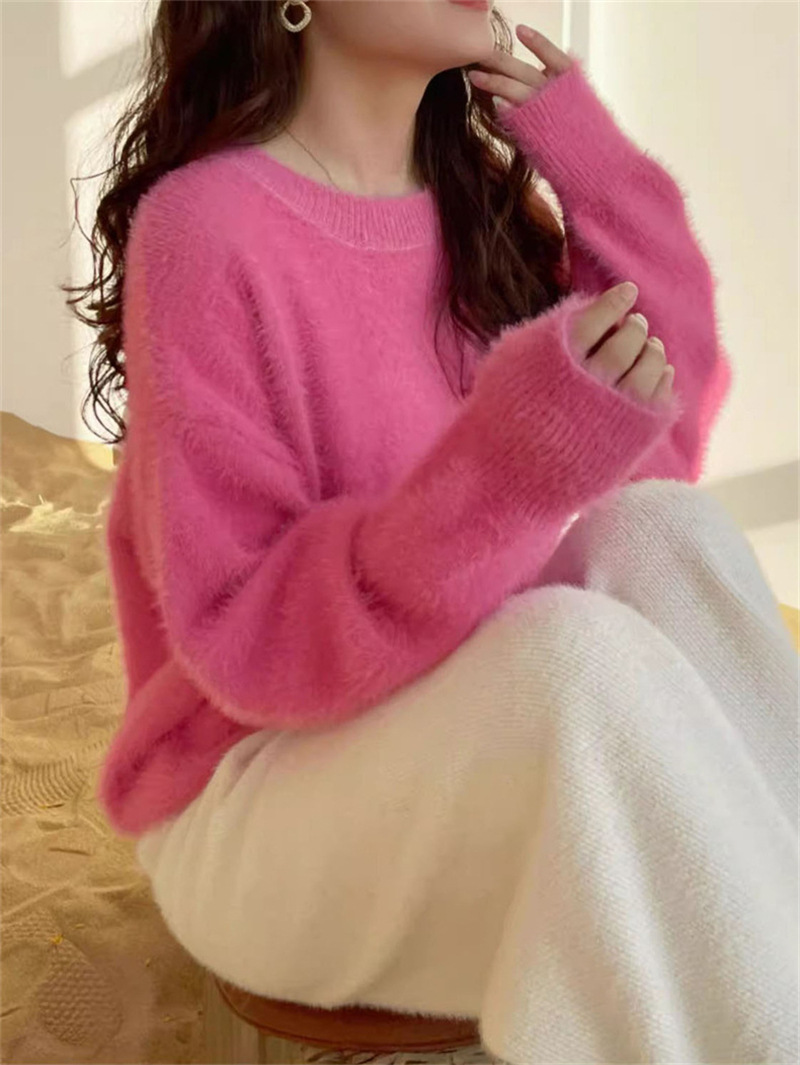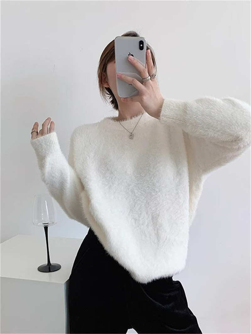 秋冬新款慵懒风圆领仿貂绒长袖套头毛衣女宽松加厚纯色软糯针织衫